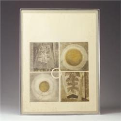 MARLEE THOMSON colligraph, "The Beginning," 1968, of abstract sun and fish shapes in shades of gray with yellow in contemporary chrome frame. Foxing. Pencil signed, titled, dated and numbered 8/12. Image: 18" x 17 3/4" $150 - 250