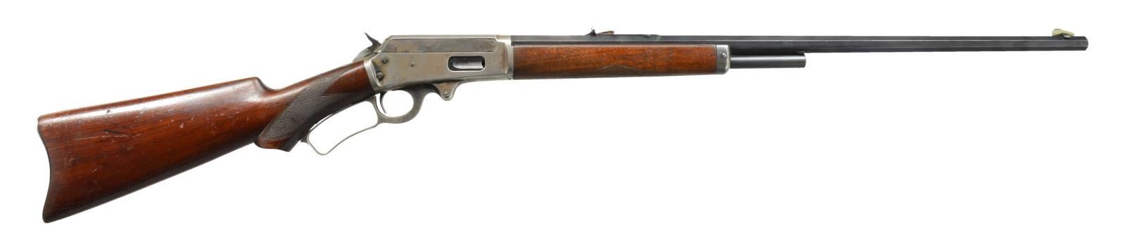 Cal. 30-30. S# 381878. Bbl. 26" oct. German silver blade Rocky Mountain front sight w/ elevator adj. semi buckhorn rear sight. Case colored action. Walnut forearm & S curved pistol grip stock feature a crescent steel buttplate & factory style A checkering. CONDITION: bbl. & mag. tube retain 80% lightly faded blue showing edge wear & spots of freckling. Action retains 20% lightly visible case colors w/ balance fading to gray. Original wood finish shows areas of peeling w/ scattered scratches & handling marks. Bore retains sound rifling. (20-665/DS). CURIO. $2,250-3,000.