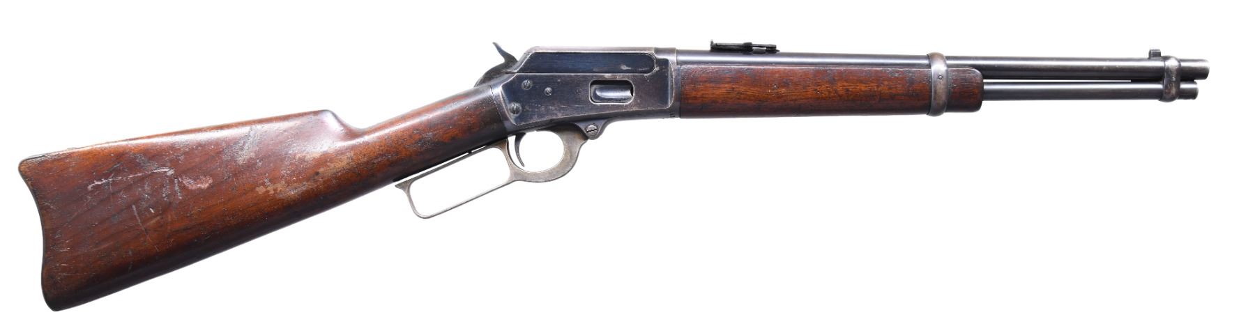Cal. 32-20. S# 435183. Bbl is 15 1/4" round. Barley corn front sight with a graduated leaf carbine rear sight. Full length mag. Action has saddle ring on left side. Blue finish with case colored lever. 8" trapper length forearm and straight grip walnut stock with steel carbine buttplate. UNATTACHED ACCESSORIES: Four page letter from Bureau of Alcohol, Tobacco, & Explosive dated Dec. 16, 2021. The letter is in response to a request for consideration for removal from provisions of the National Firearms Act; page 2 & 3 describe the regulations and specifications of this firearm. The letter concludes "Based on the information you provided, as well as our research and examination, FTISB has determined that the submitted Marlin, model '94, serial number 435183, by reason of the date of manufacture, value, design, and other characteristics, primarily a collector's item and is not likely to be used as a weapon. Accordingly, this firearm is hereby removed from the provisions of the NFA.". CONDITION: 70% lightly worn blue showing carry wear with small spots of corrosion. Lever retains a small amount of case colors in protected areas. Original wood finish shows wear with numerous scratches, marks and dents. Sound mechanics. Bore is generally bright with lightly worn rifling. (25-1157/DS). CURIO. $5,000-8,000.
