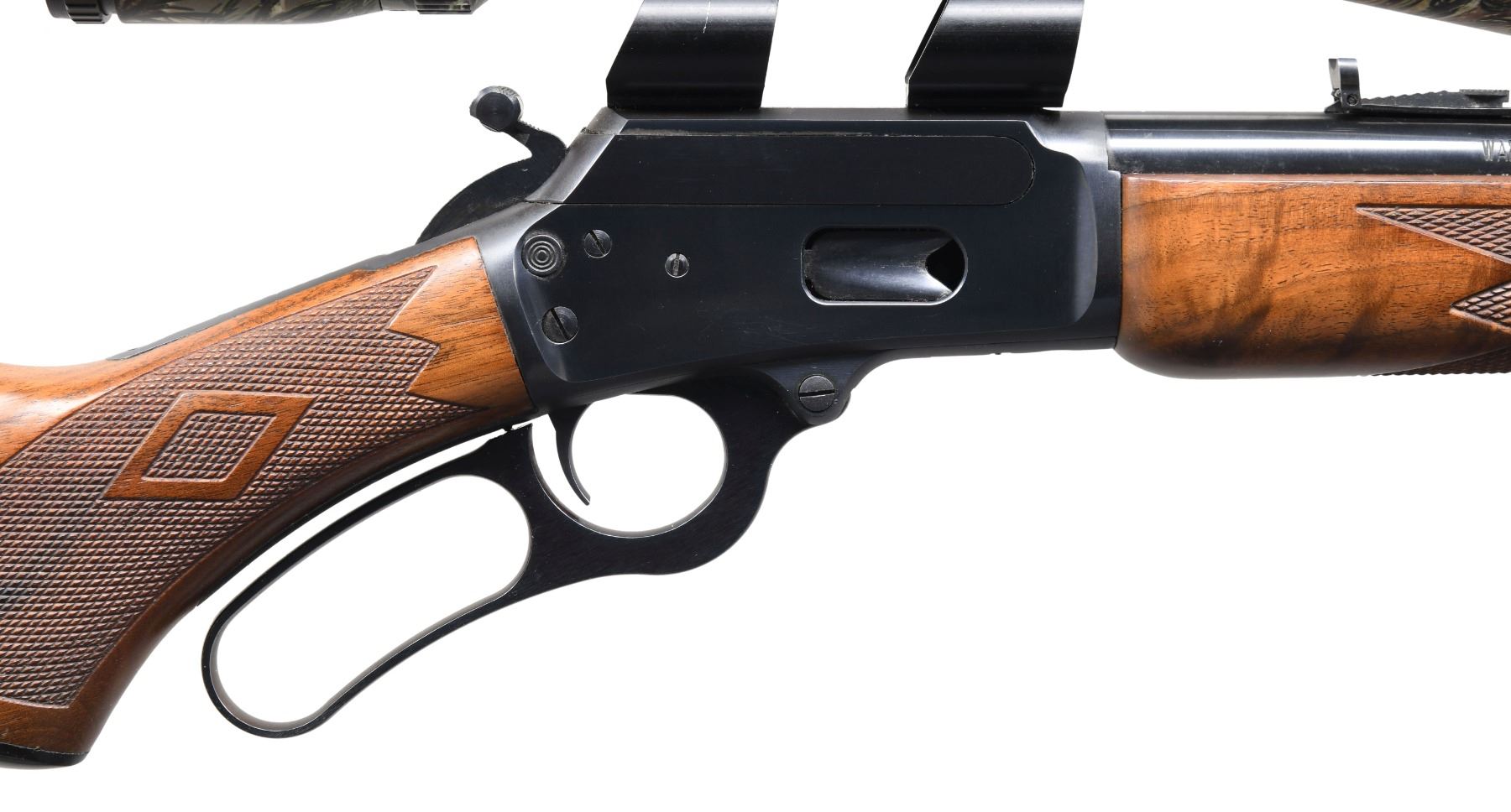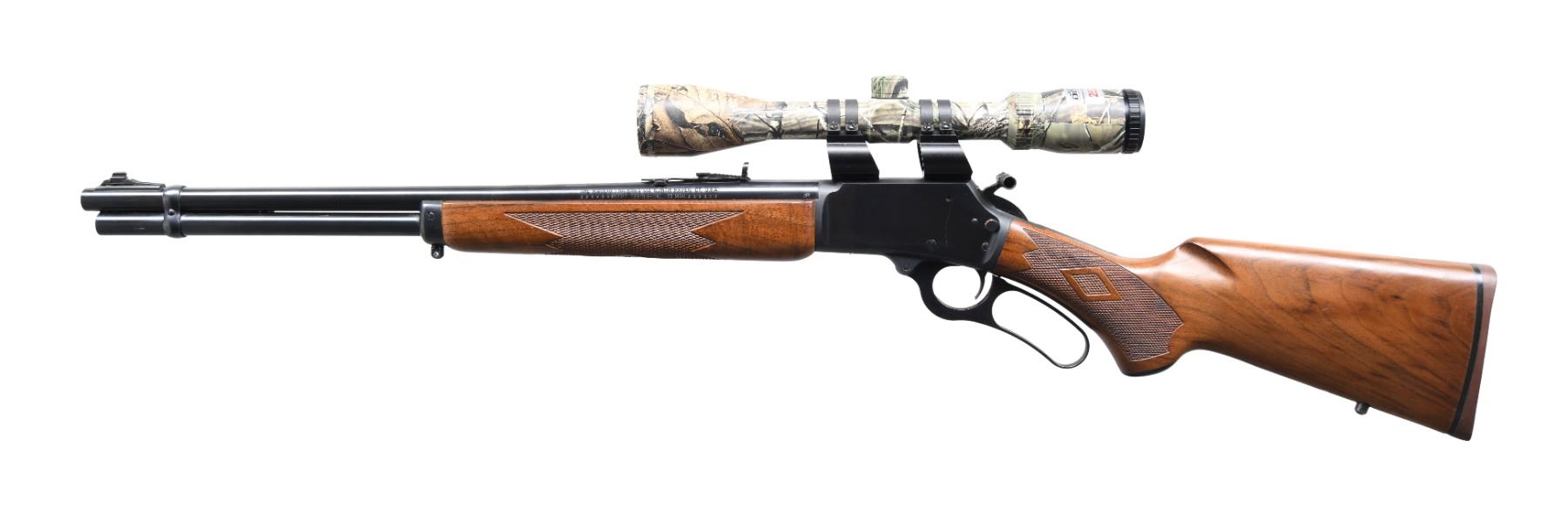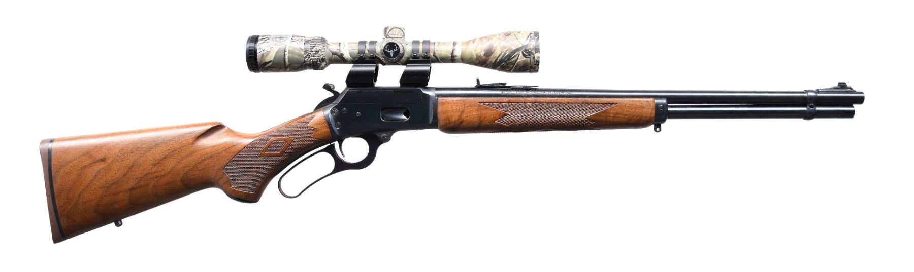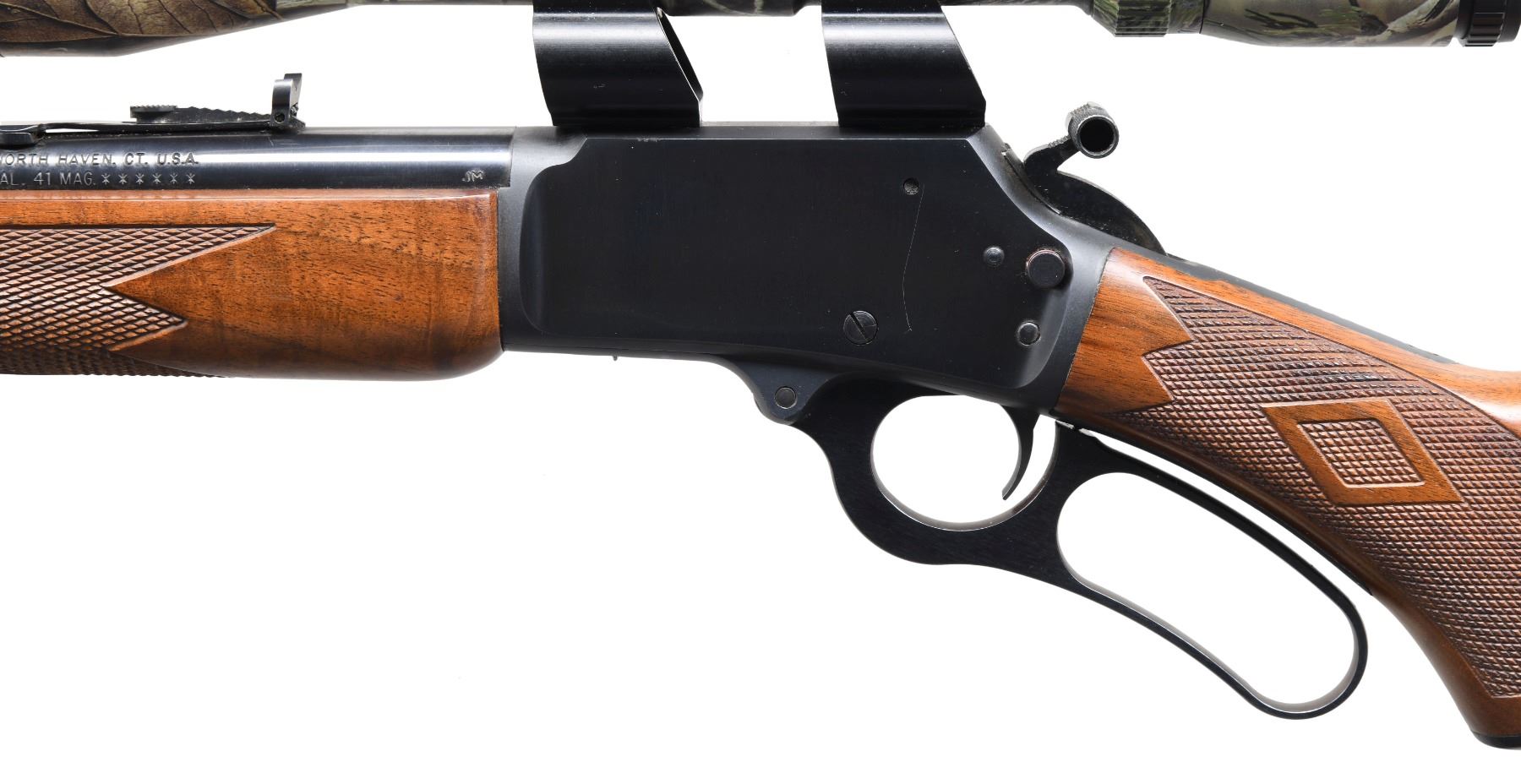 Cal. 41 Mag. S# 97017789. Bbl. 20" round w/ micro-groove rifling. Ramp mounted bead front sight w/ sporting leaf rear sight. Bushnell Trophy XLT 3-9x40 camouflaged scope w/ DOA duplex reticle on see-through mounts. 10 rd full length mag. Action has crossbolt safety & hammer extension. Semi-beavertail walnut forearm & plastic capped pistol grip stock w/ cut checkering, solid brown pad & swivel bases. Mfg. 2003-2007. CONDITION: over 98% blue showing a scratch on the left side of receiver. Wood has very good finish. Bright near excellent bore. PROVENANCE: Lifelong Collection of Bill Peterken. (24-6264/DS). MODERN. $800-1,200.
