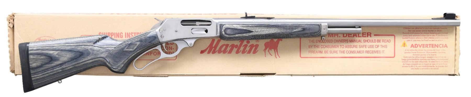 Cal. 450 Marlin. S#. 93202954. Bbl. 24" round w/ micro groove rifling. half length tubular mag. Cross bolt safety & grooved bolt body. Stainless steel construction. Laminated stock & forend w/ cut checkering, plastic grip cap, solid black pad & swivel bases. UNATTACHED ACC: original box containing owners manual packet, scope mt. shims & safety lock. CONDITION: as new in box. (24-3631/DS. MODERN. $800-1200.