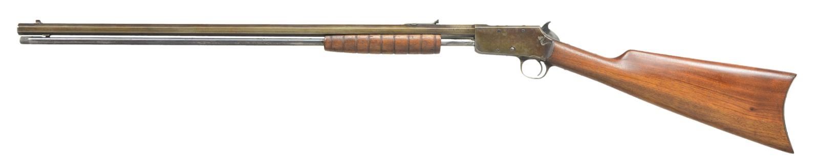 Cal. 22 S, L, LR. NSN. Bbl. 24" oct. w/ sporting sights. Tubular mag. Takedown action. Grooved walnut forearm & straight grip stock w/ crescent buttplate. CONDITION: metal has cold reblue refinish blending w/ fair blue having wear, peppery oxidation, pitting & marks . Good wood finish w/ moderate handling marks throughout. Fair bore w/ pitting throughout. (22-2799/MD). CURIO. $250-350.