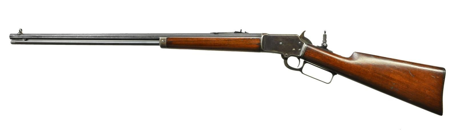 RIFLE. Cal. 22 RF. S# 225648. Bbl. 24" tapered octagon with Beech Combination front sight and standard V notched elevator adjustable rear. Mfg. 1901 (1892-1916) having added Lyman No. 1 second variation tang sight. Predecessor to Model 39 having round top receiver with "MARLIN SAFETY" marking. CONDITION: good to very good overall appearance with refinished stock having top portion of hard rubber buttplate proud of wood; no other compromises. Areas of peppery oxidation (mainly on barrel). Faded case colors with grey tone. Fair to good bore with wear and cleaned, even light pitting; distinct rifling and serviceable. PROVENANCE STATEMENT: Estate collection of Thomas F. Wolfinger. (22-6111/NW). CURIO. $500-750.