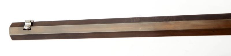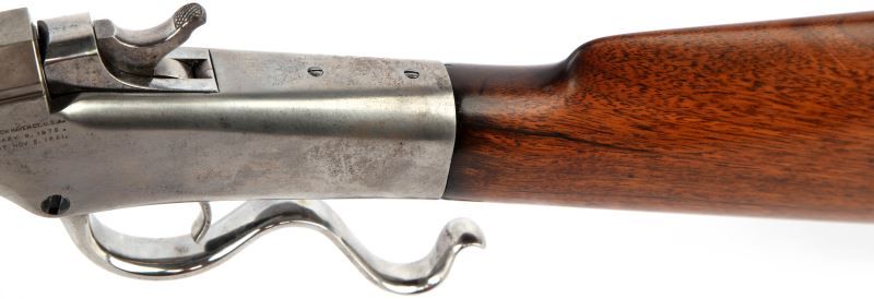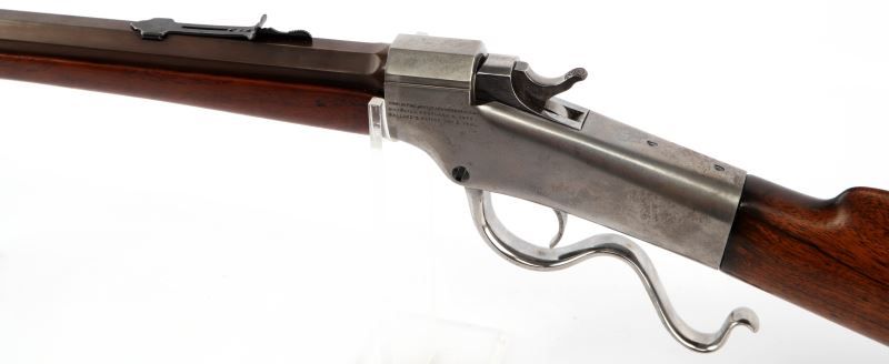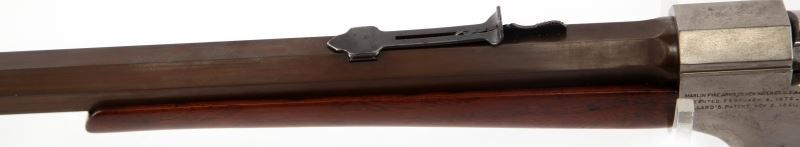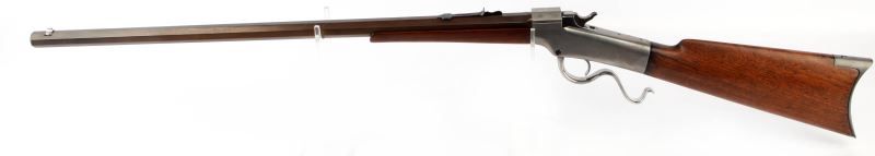 Marlin-Ballard No. 3 gallery rifle. 26 inch octagon barrel, with falling block action. Two line address in left side of receiver. Receiver, lever, block, hammer, and butt plate all appear to have been originally nickel plate, with nickel remaining on some parts, but certain evidence of cleaning. Barrel has been re-finished, and fore end of stock appears to have had quality work done as well. Butt stock also re-finished, with a small crack appearing to have been repaired and filled before re-finish. Bore is bright and clean, appearing in excellent condition for the age. Some play in lever, but action is still functional and smooth. Overall good partially restored condition. Caliber: .22 Serial #: 33575