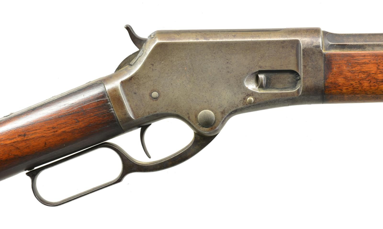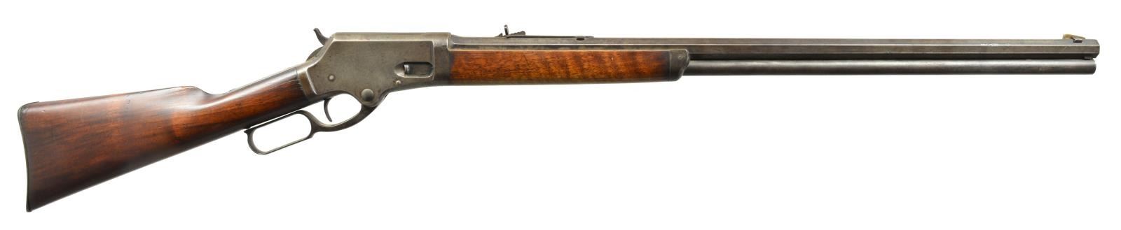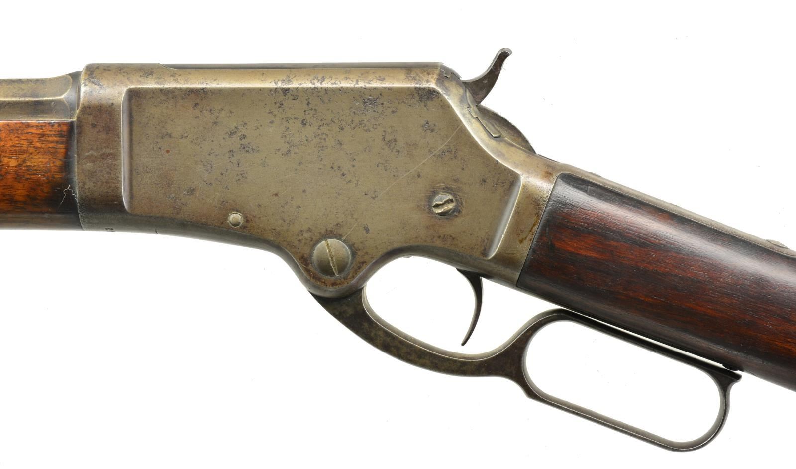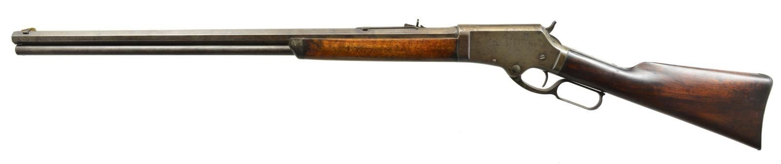 Cal. 40 (40-60). S# 9143. Bbl. 28" oct. w/ Rocky Mountain front sight & elevator adj. sporting rear sight. Full length mag. Walnut forearm & straight grip stock w/ steel buttplate. CONDITION: metal finish has faded to mottled gray brown showing scattered pitting. Lightly sanded & refinished wood shows scattered scratches & marks. Stock has hairline crack extending from right side of action. Good mechanics. Bore retains sound rifling showing spots of light pitting. (01-18170/DS). ANTIQUE. $900-1,200.
