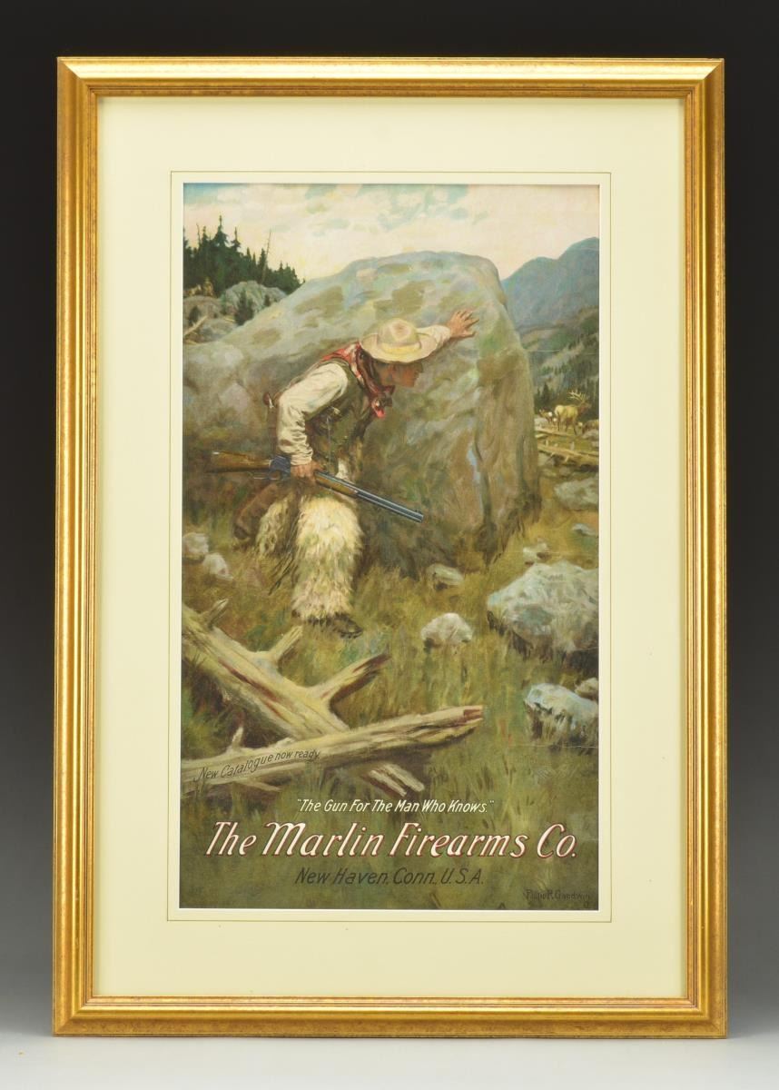 KNOWS" FRAMED ADVERTISING PRINT. Picture depicts a Rocky Mountain scene with hunter in western attire and his Marlin rifle peering around a boulder at an impressive bull elk. Description at bottom states "New Catalog now ready" over "The Gun for the Man Who Knows / The Marlin Firearms Company / New Haven, Conn., U.S.A." Lower right corner has the artists name Phillip R. Goodwin. Image size is 23" high by 13 1/4" wide. Picture has a light beige matting with gold line highlight and antique gold finished frame. Frame size is 31" high by 21 1/4" wide. Ca. 1906. CONDITION: very good showing little fading or wear. Poster does show mild creases apparently from storage in original tube. PROVENANCE: From the life long collection of Robert Runge. (02-17732/DS). $1,000-1,500.