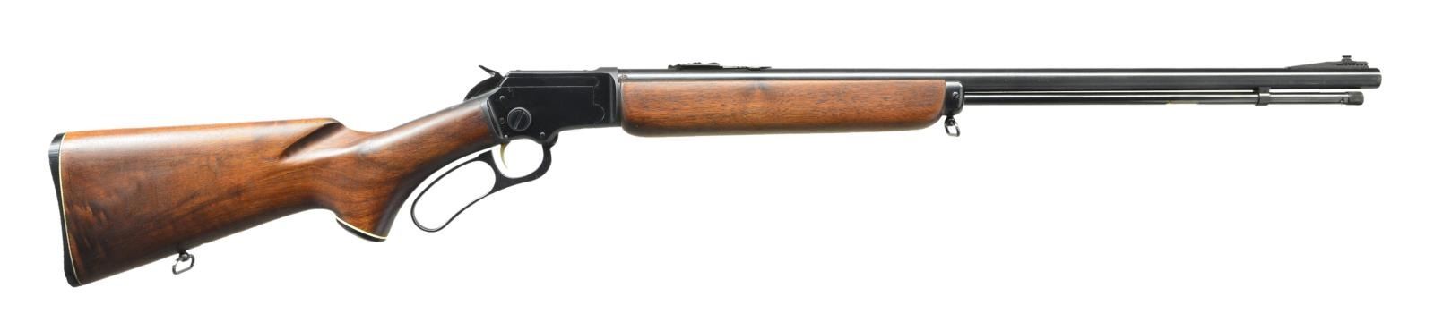 Cal. 22 S, L, LR. S# R12176. Bbl. 24" Round with Micro-Groove rifling.. Ramp mounted bead front sight with sporting rear sight. Full length tubular mag. Blue finish with gold finished trigger. Semi beavertail forearm & pistol grip walnut stock having plastic buttplate & grip cap with white line spacers. Factory sling swivels. "R" Serial number prefix indicates 1957-1958 mfg. CONDITION: over 98% blue. Very good wood finish shows a few very sm marks. Toeline of stock missing Marlin trademark button. Bright near excellent bore. (22-4721/DS). CURIO. $800-1,200.