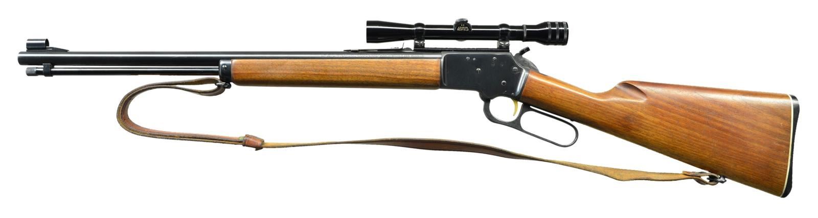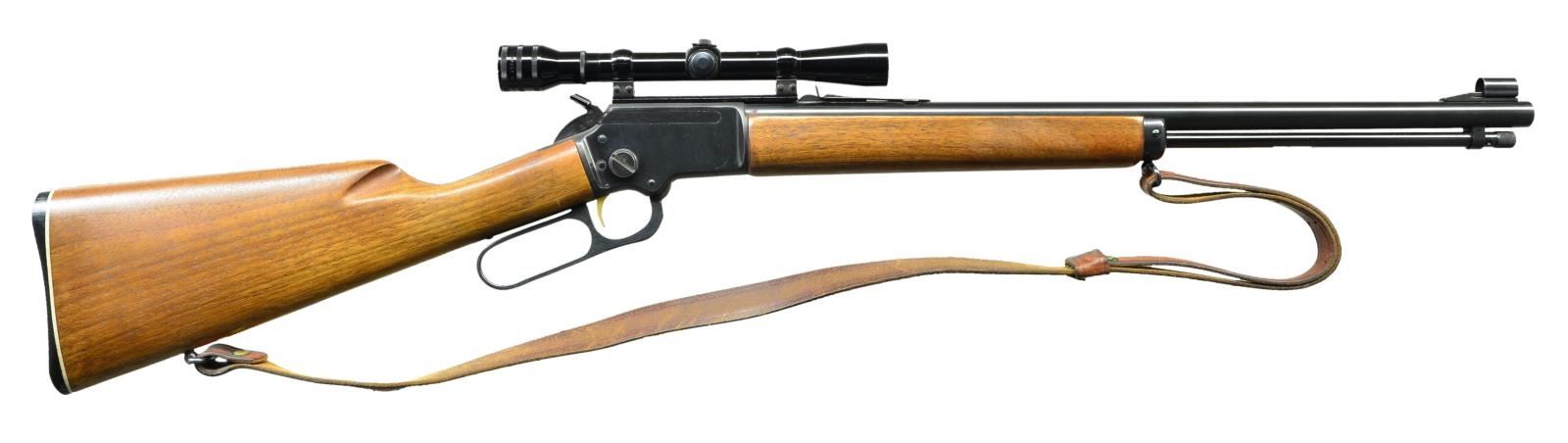 Cal. 22 S, L & LR. S# AC6110. Bbl. 20" w/ hooded ramped Marlin front bead & corresponding elevator adjustable rear. JM marked bbl. & offset hammer extension. Mfg. 1967 w/ straight gripped uncheckered walnut stock set having factory swivels holding Hunter sporting sling. Marlin scope adapter base w/ gloss finished 3/4" tubed Redfield 4X scope having heavy crosswire reticle; highly desirable scope set to include Redfield rings. White line spaced checkered Marlin buttplate plus "bullseye". CONDITION: only aspect not near excellent is the sling that exhibits age & use. An especially nice Model 39A. (22-3266/NW). CURIO. $700-1,000.