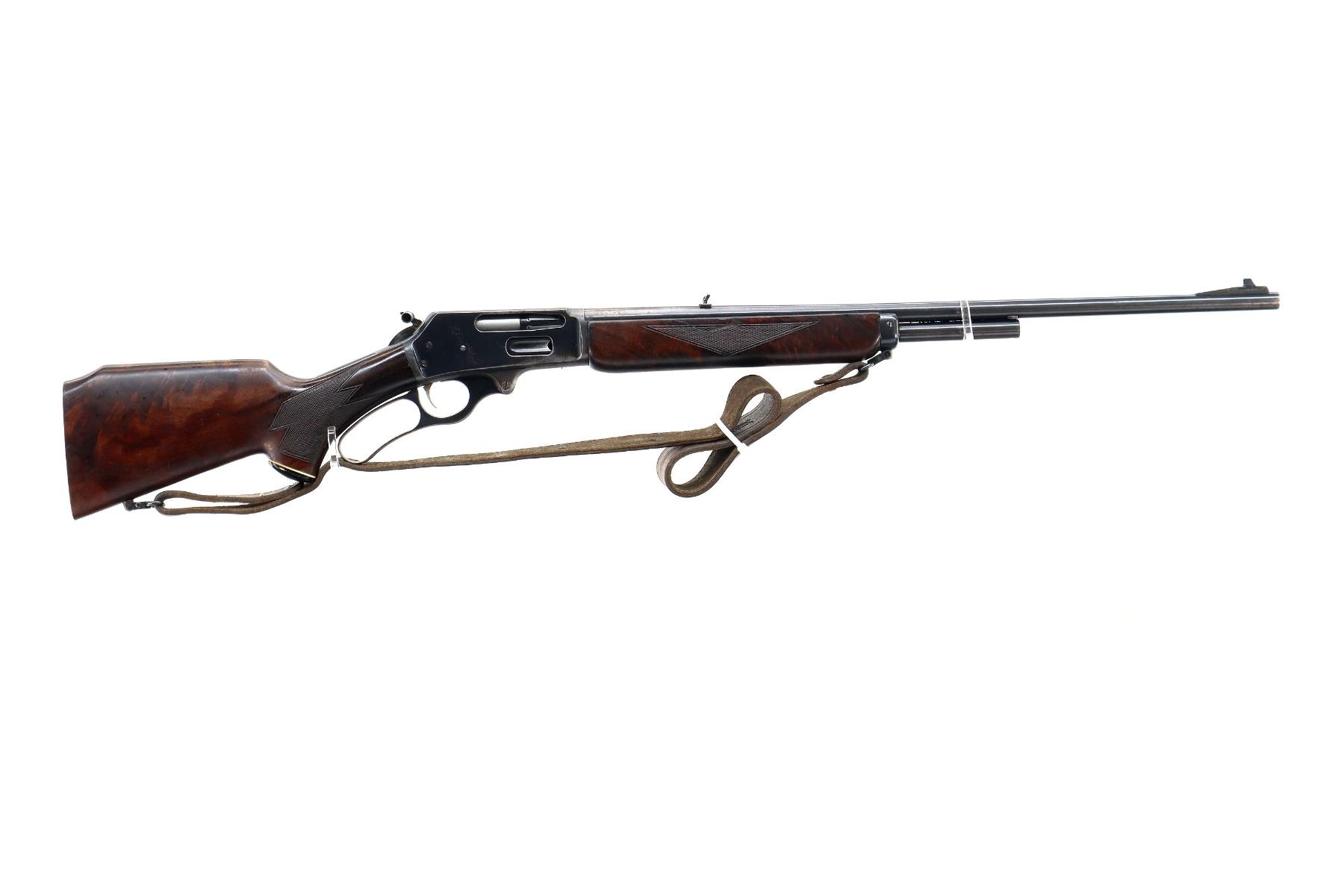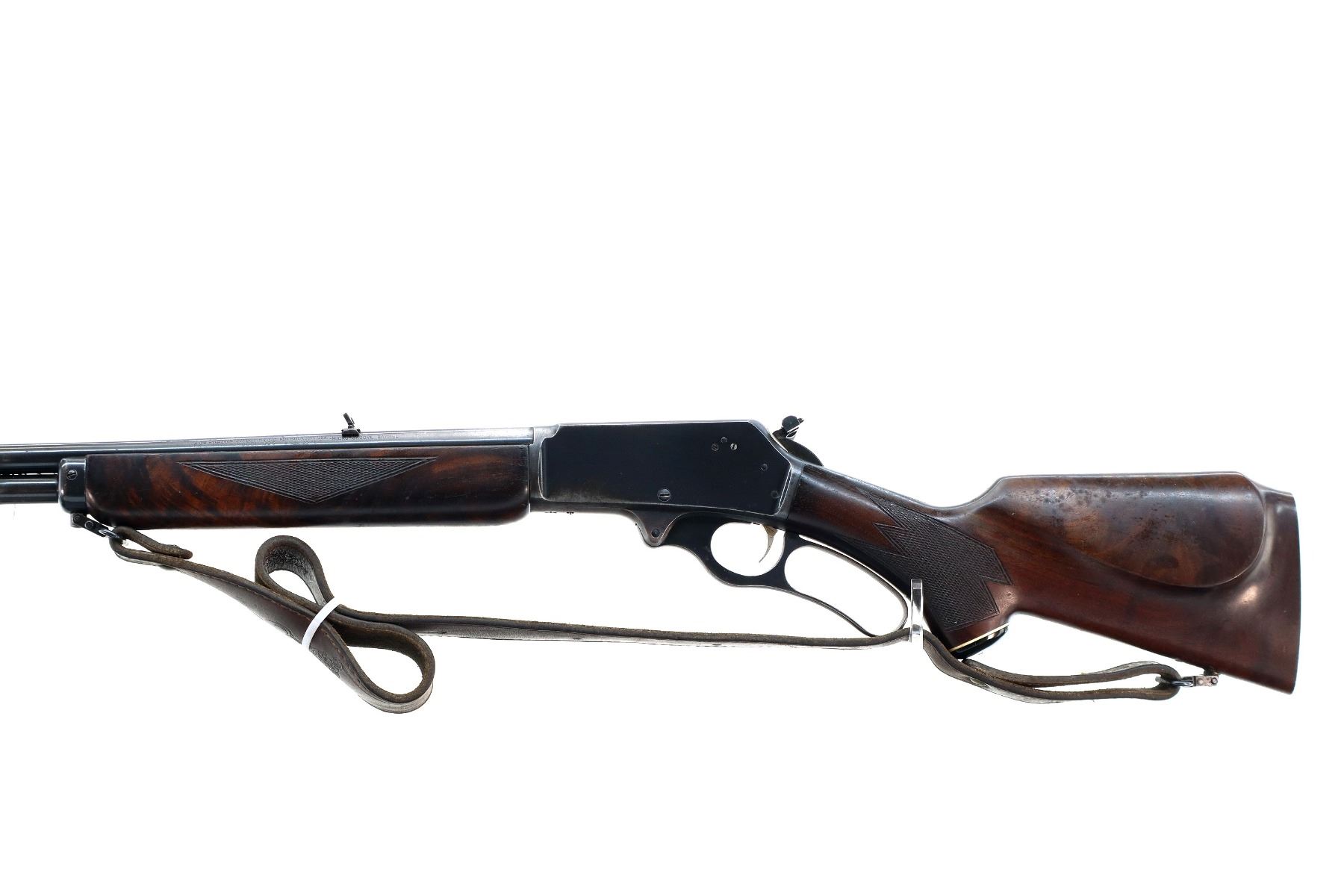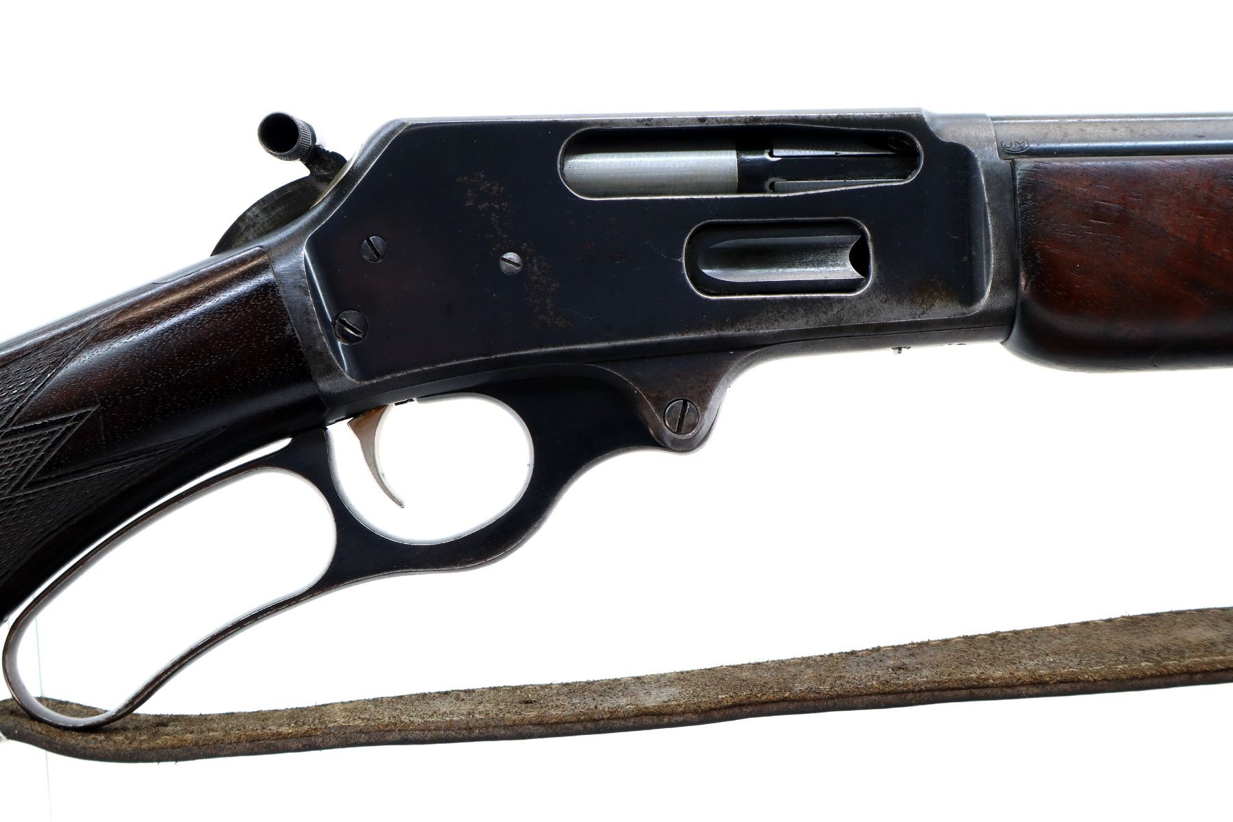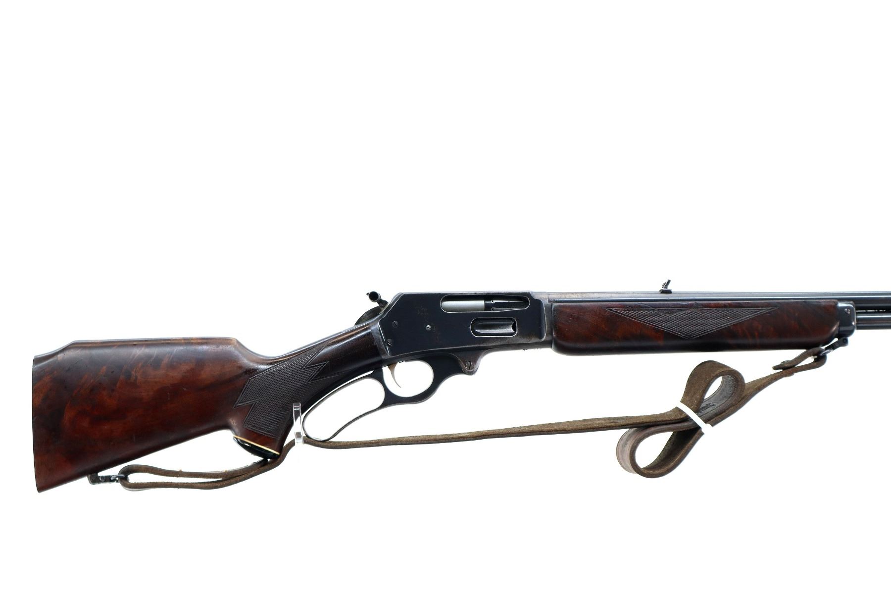Main Description: Blade front sight with ramp, adjustable folding u notched rear sight, blued finish, receiver drilled and tapped with no plug screws installed, grooved spur hammer with checkered extension. Two piece wood stocks, checkered forearm and pistol grip, cheek rest, missing butt plate and screws, 11.75" LOP, missing Marlin Bullseye, has a grip cap and 2/3rd length magtube. Sling swivels with brown leather sling.
