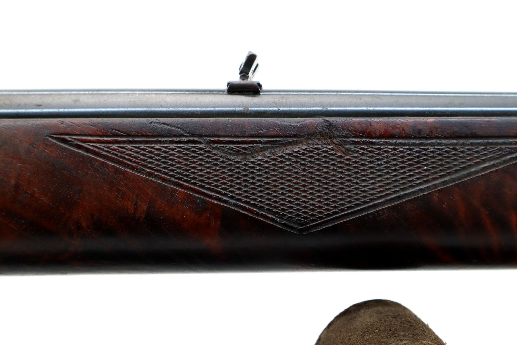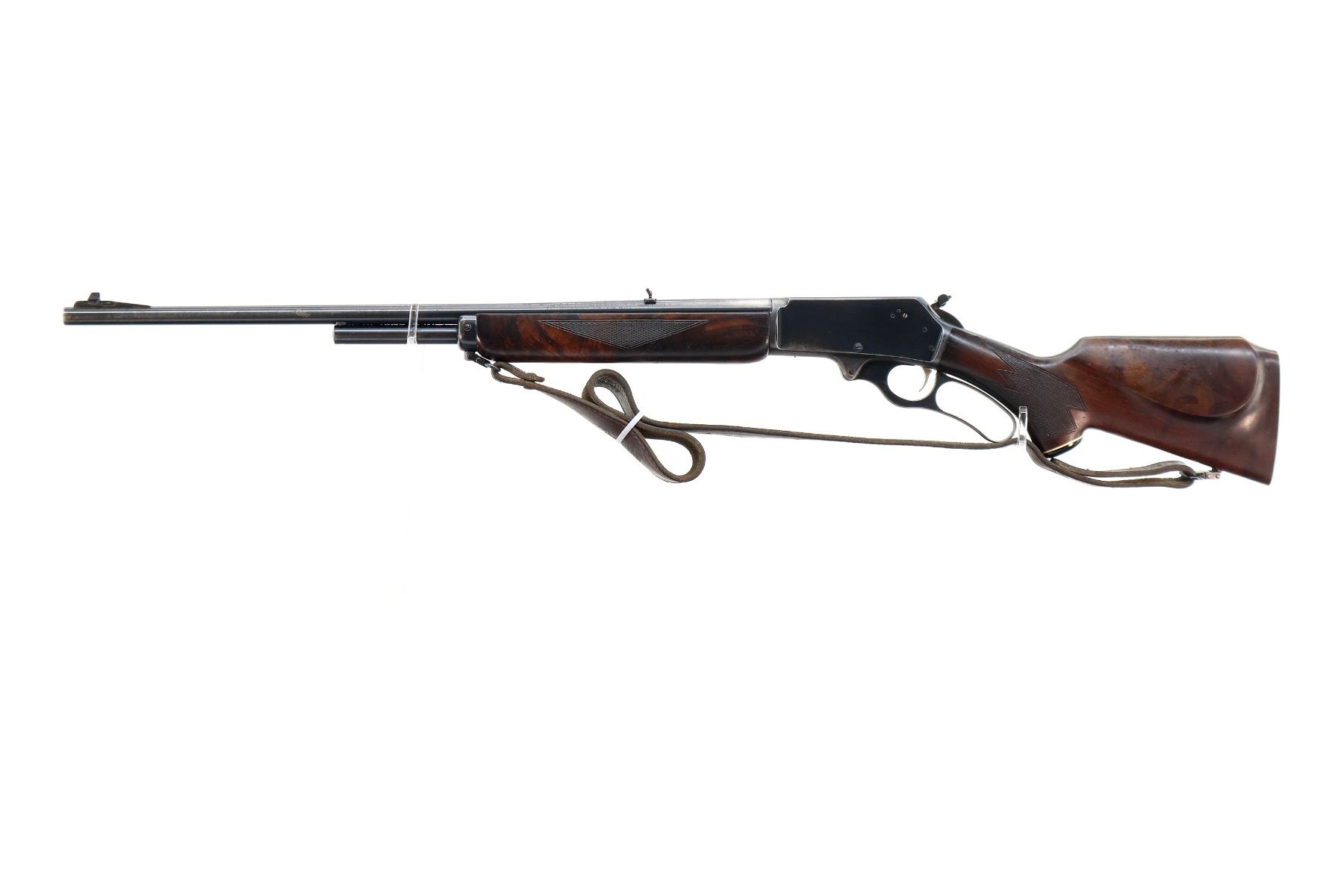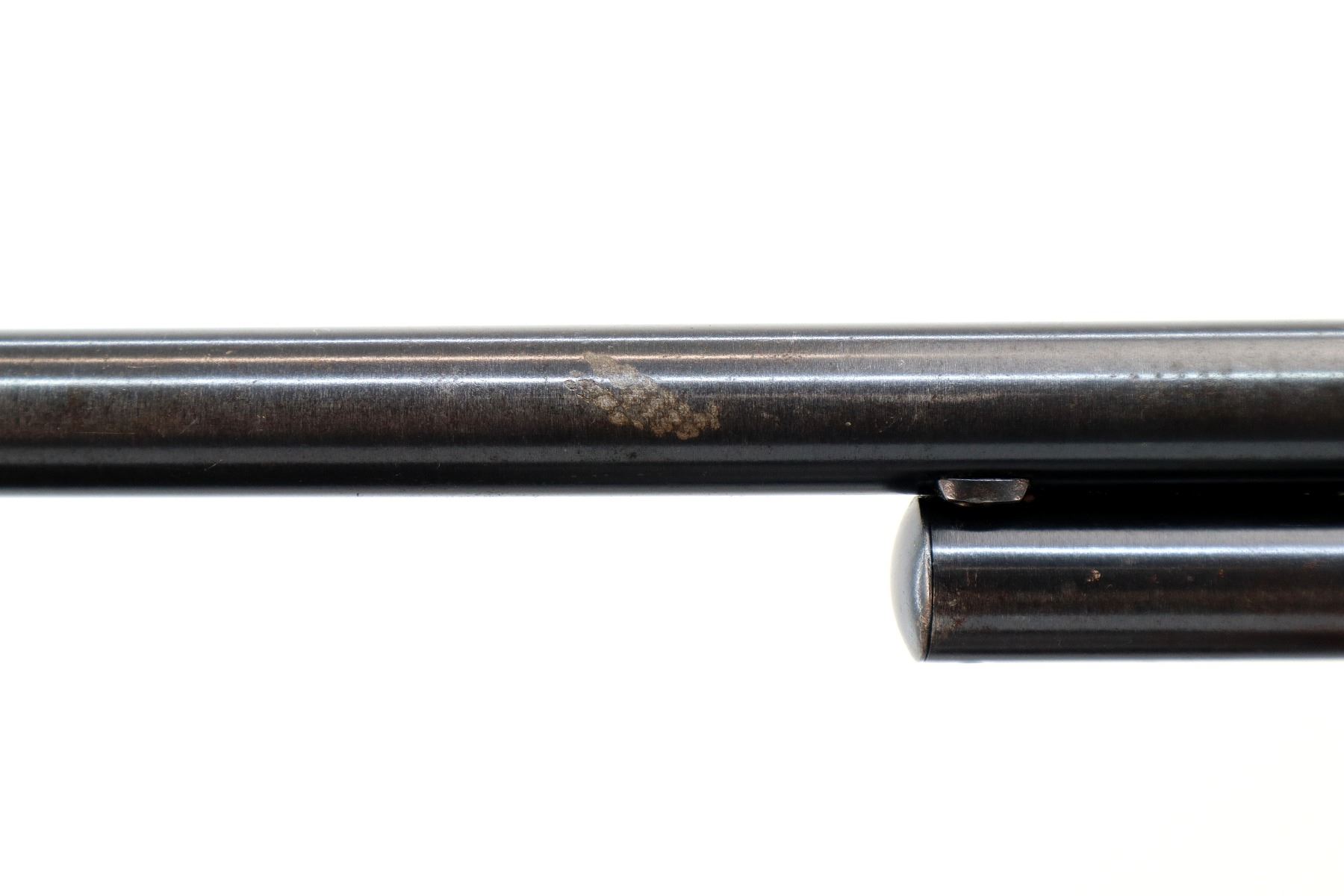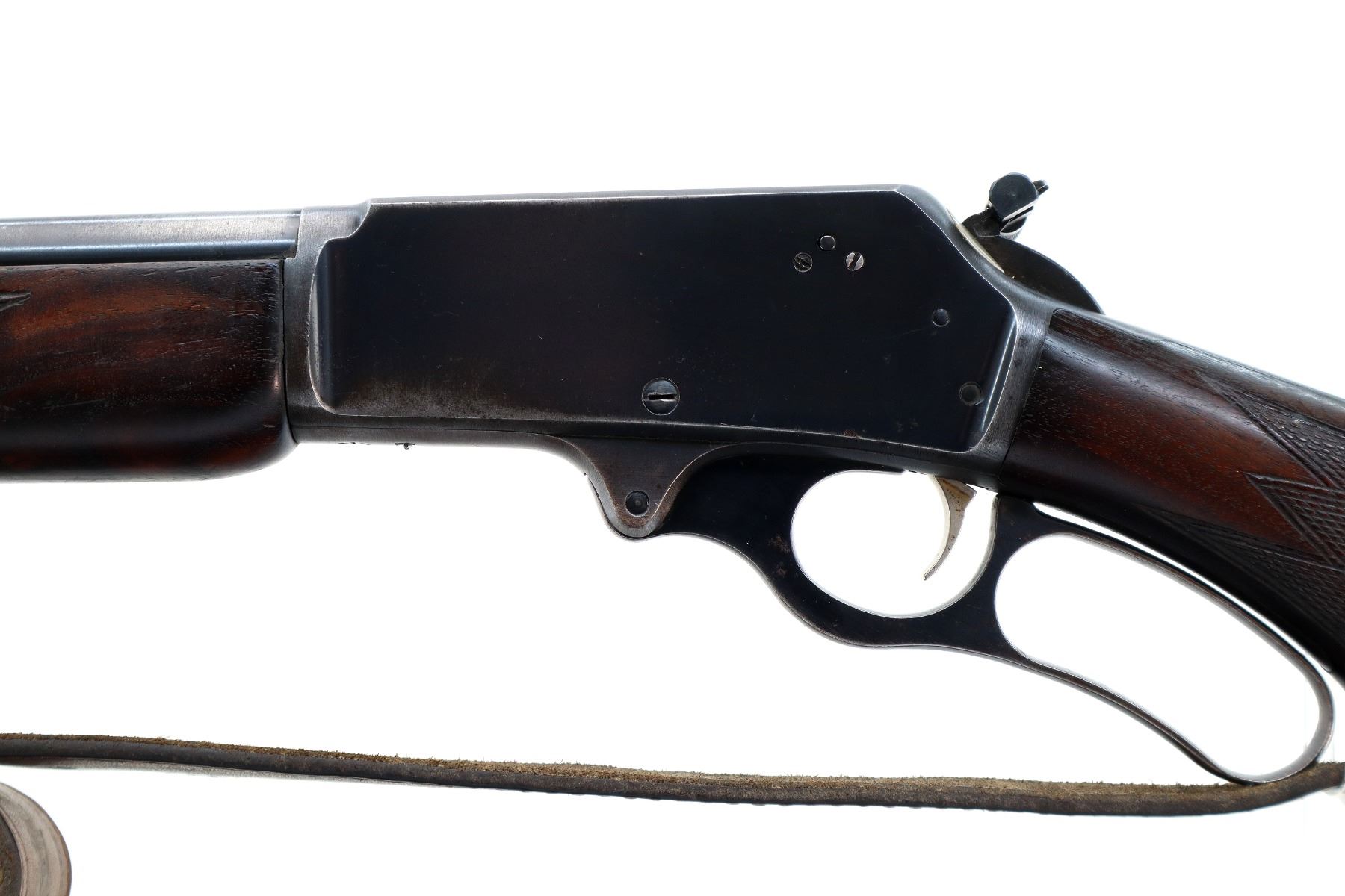 Main Description: Blade front sight with ramp, adjustable folding u notched rear sight, blued finish, receiver drilled and tapped with no plug screws installed, grooved spur hammer with checkered extension. Two piece wood stocks, checkered forearm and pistol grip, cheek rest, missing butt plate and screws, 11.75" LOP, missing Marlin Bullseye, has a grip cap and 2/3rd length magtube. Sling swivels with brown leather sling.