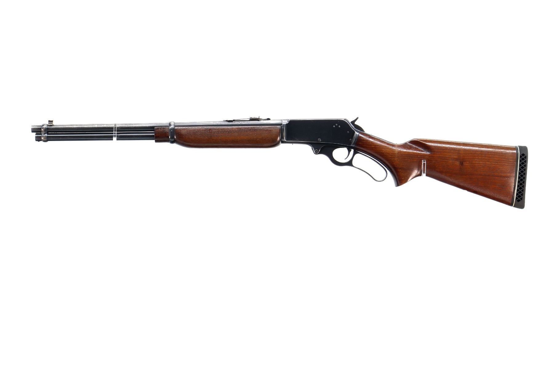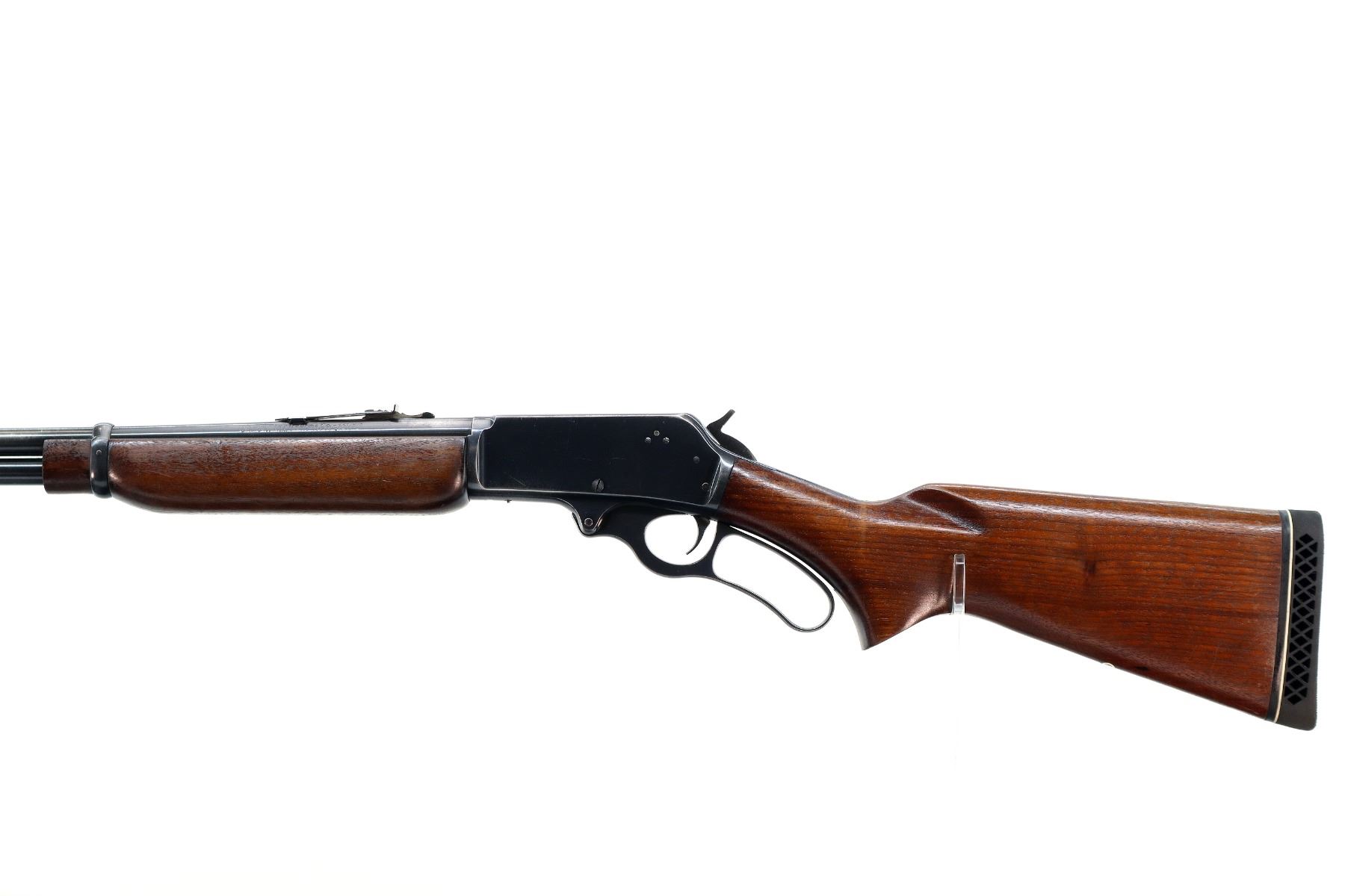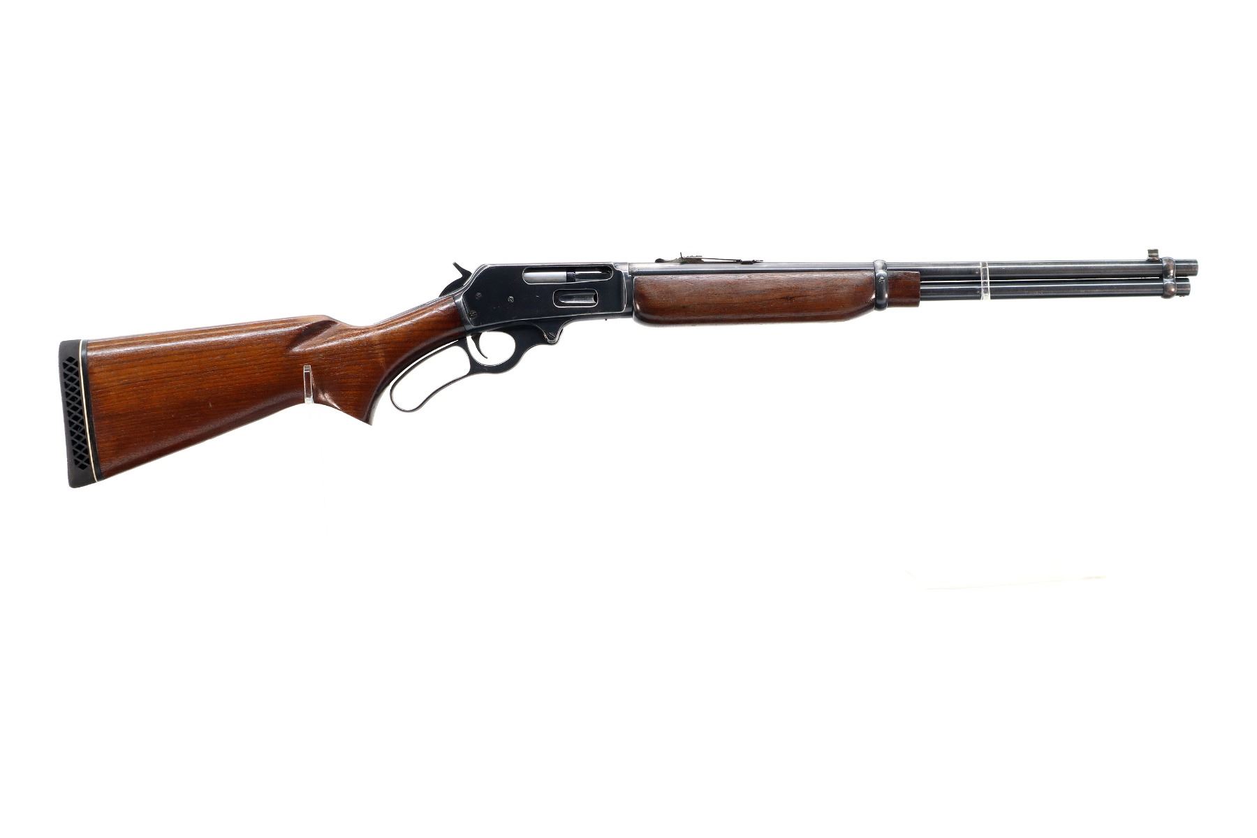 Main Description: Blade front sight, adjustable u notched rear sight, blued finish, grooved spur hammer. Two piece wood stocks, pistol grip small chips behind upper tang, black vented rubber recoil pad, Marlin bullseye, full length magtube.