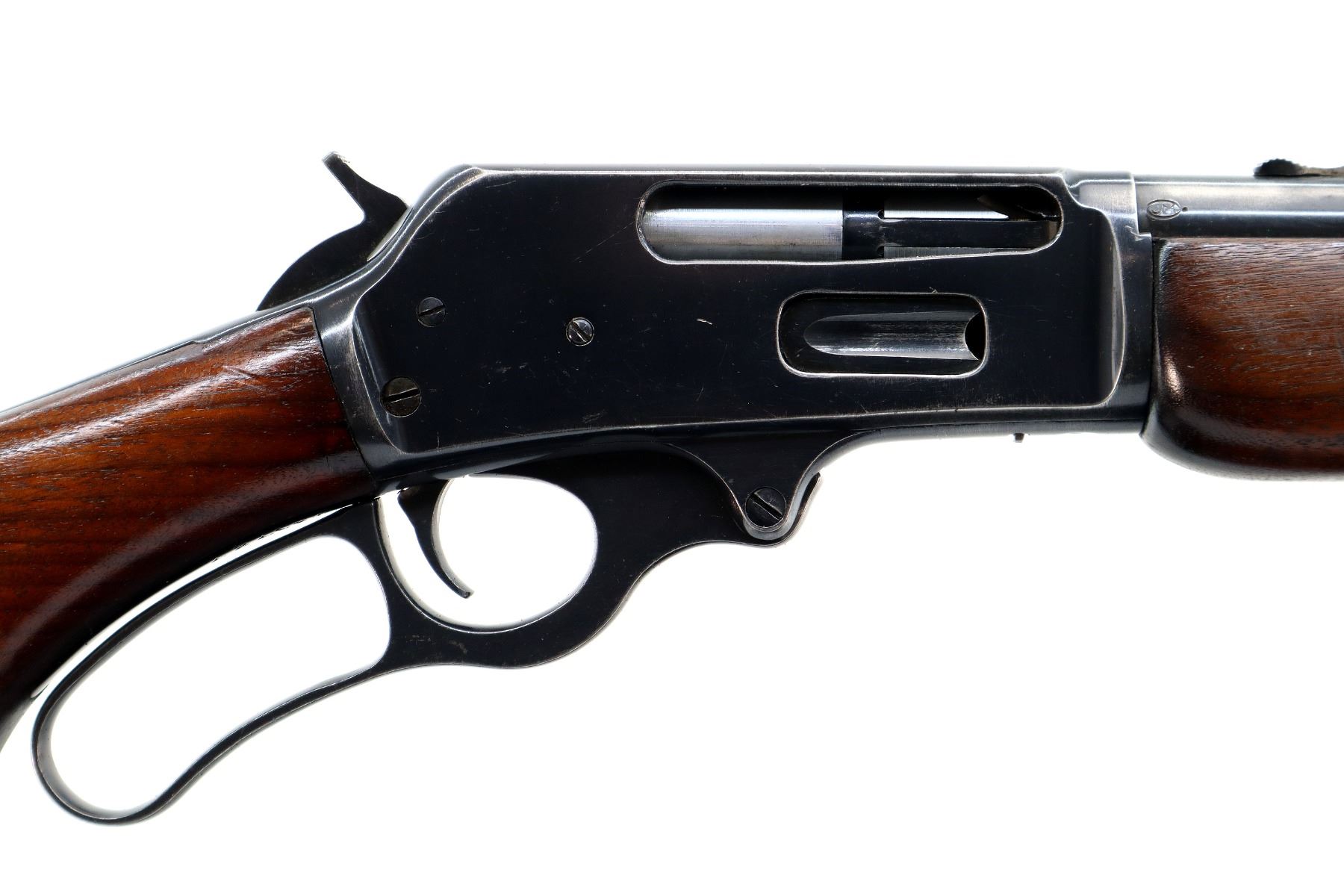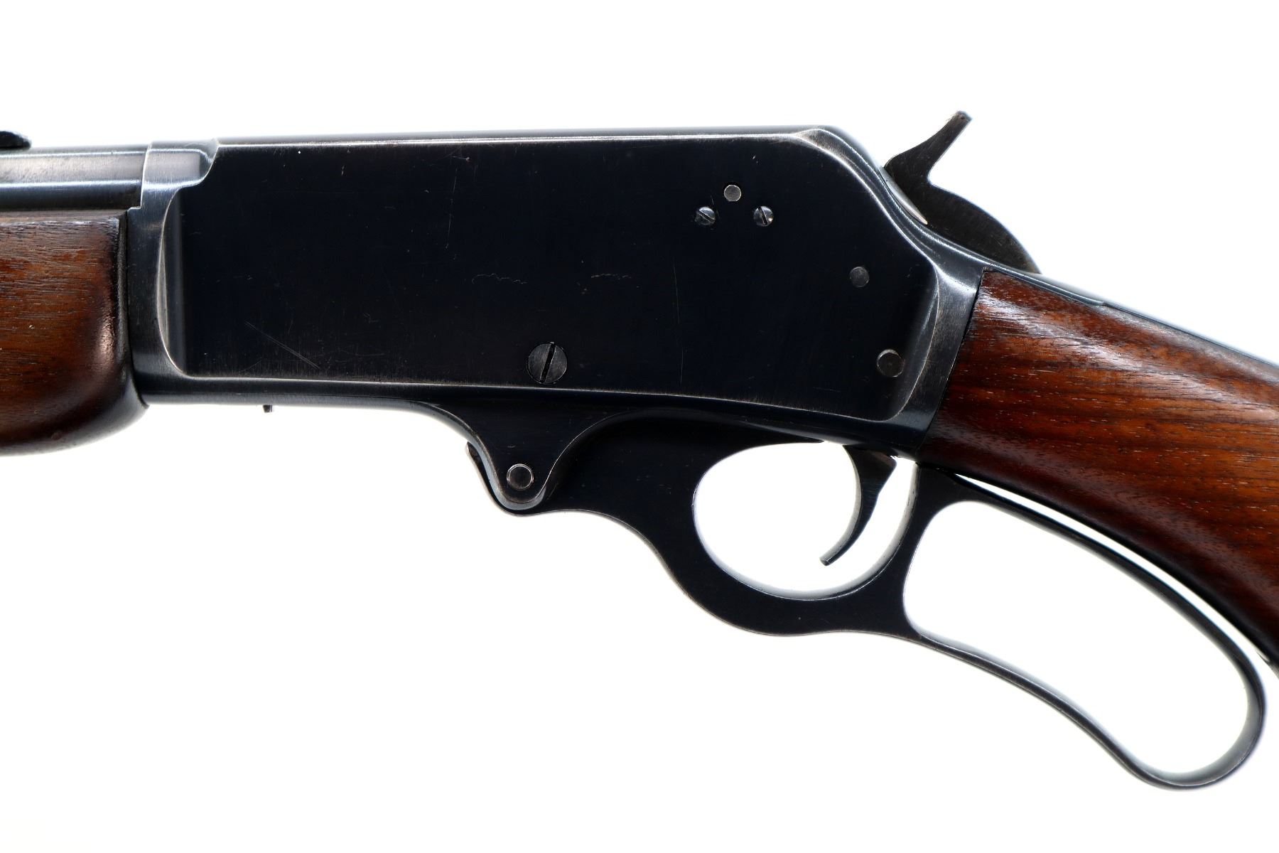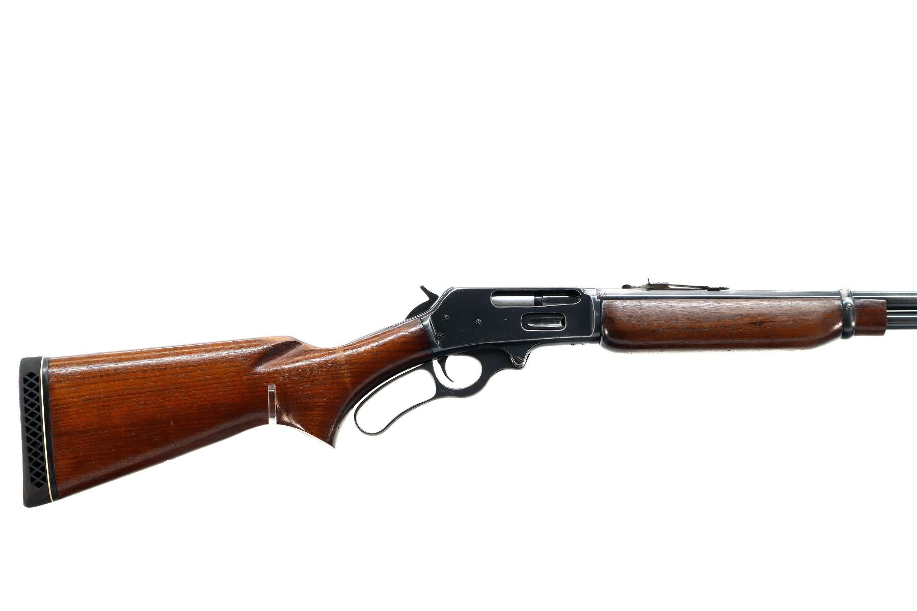 Main Description: Blade front sight, adjustable u notched rear sight, blued finish, grooved spur hammer. Two piece wood stocks, pistol grip small chips behind upper tang, black vented rubber recoil pad, Marlin bullseye, full length magtube.