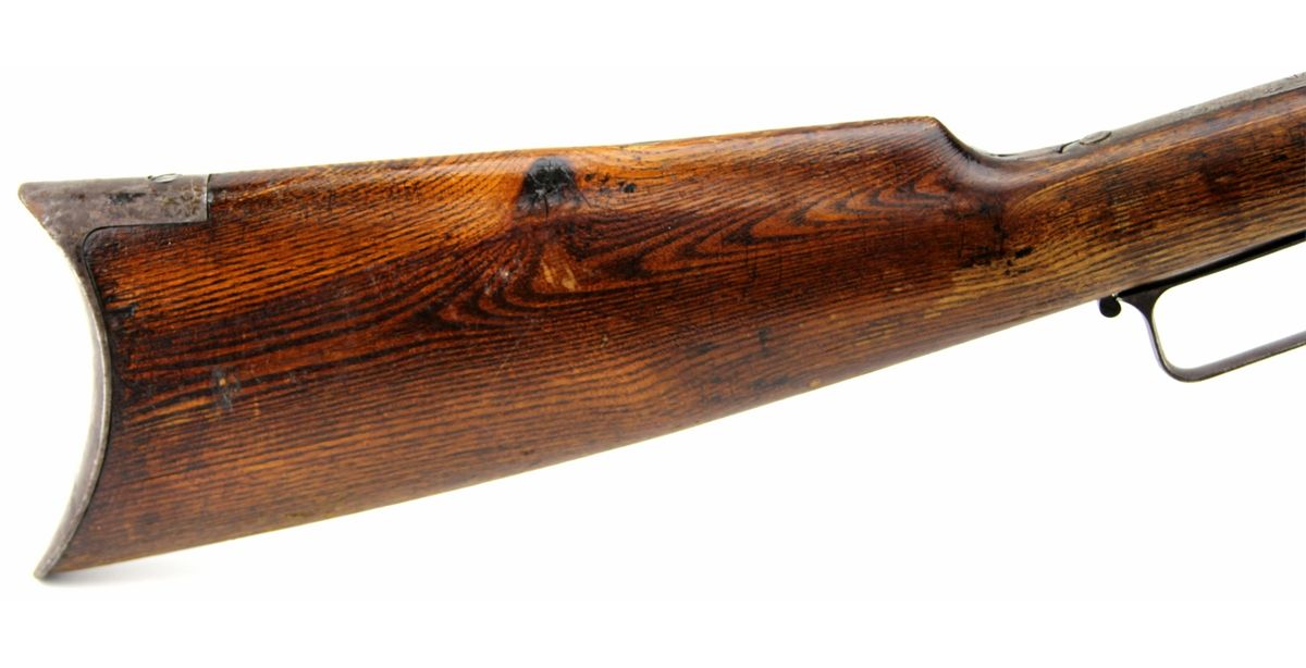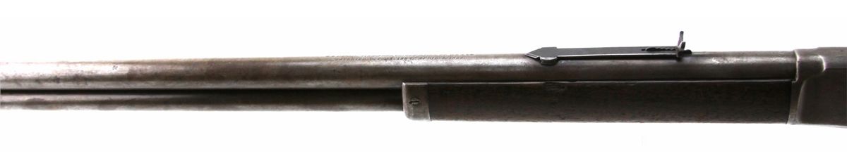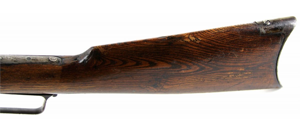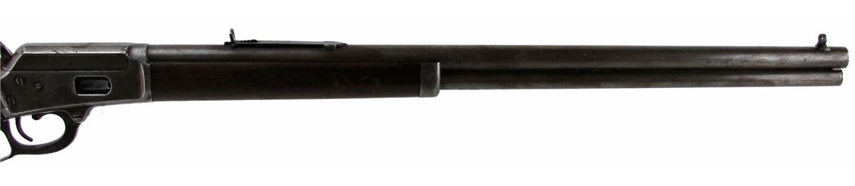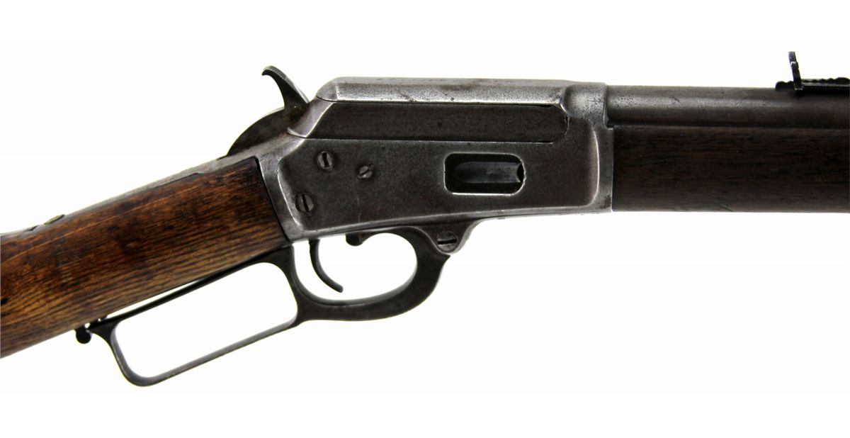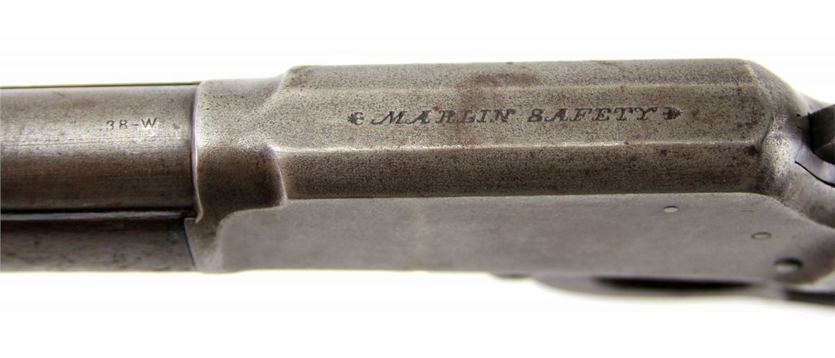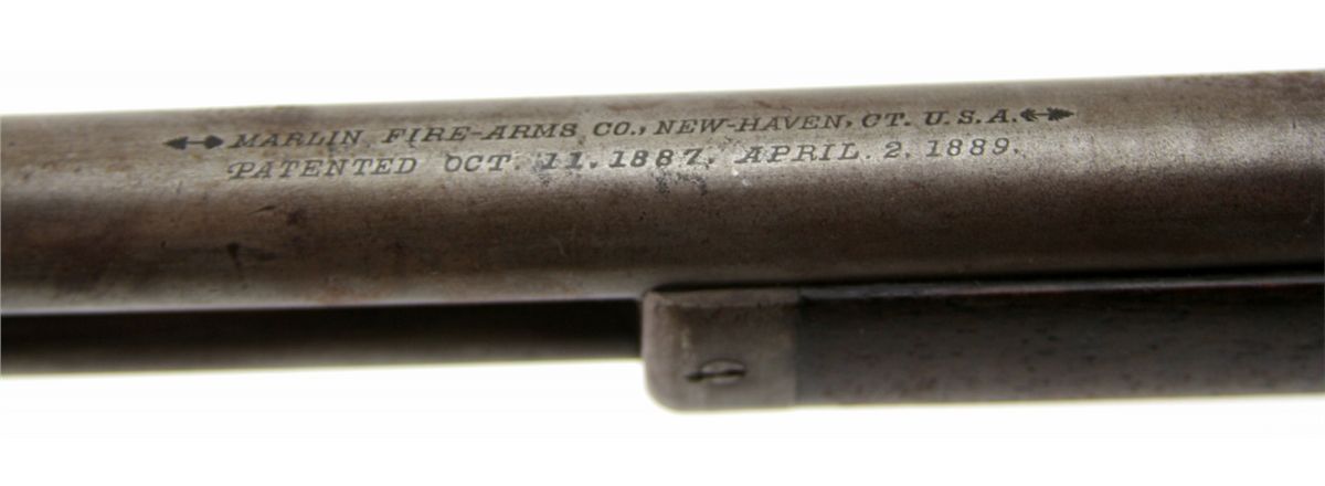 MARLIN MODEL 1889 LEVER ACTION RIFLE IN .38-40 WCF Marlin Mode 1889 lever action rifle. 24 inch round barrel, roll-stamped: "MARLIN FIRE-ARMS CO. NEW-HAVEN CT. U.S.A./PATENTED OCT. 11. 1887. APRIL 2. 1889." in two lines ahead of the rear sight. The caliber ".38 - W." is stamped on the top of the barrel in front of the receiver. "-MARLIN SAFETY-" is roll-stamped on the top of the receiver. Type: rifle-antique Manufacturer: Marlin Model: 1889 Caliber / Gauge: .38-40 WCF Serial Number: 38802 Condition: Bore is good for the age, bluing mostly absent with light grey patina to metal surfaces. Stock good, with likely refinish to butt stock.