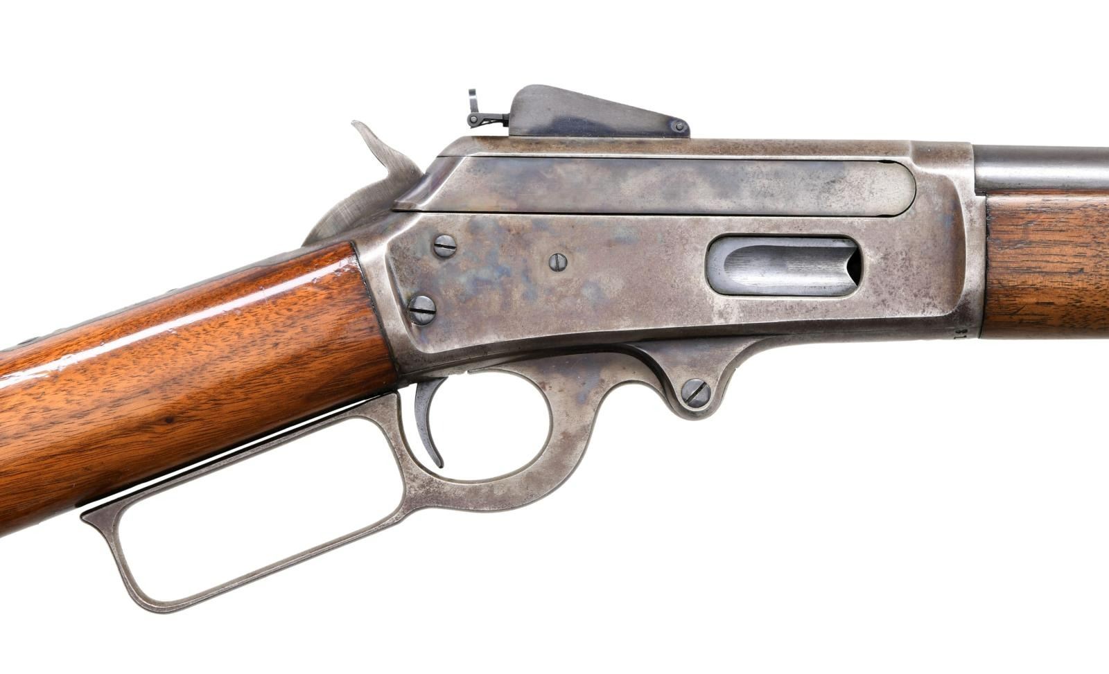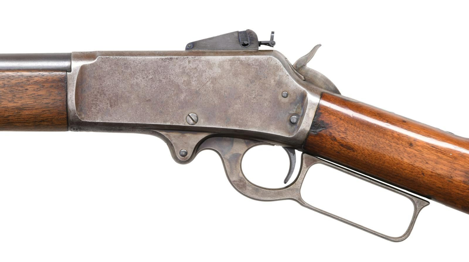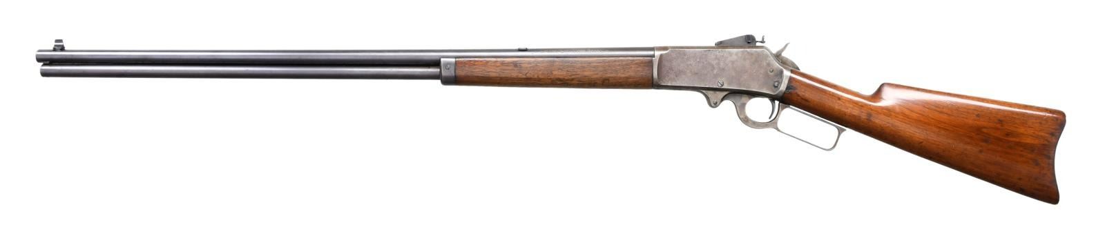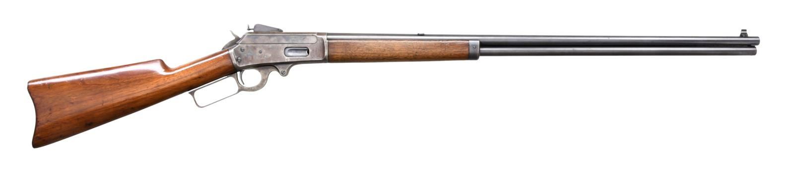 Cal. 38-55. S# 315952. Bbl. 28" round, 2" longer than standard. Replacement brass bead front sight w/ filler in rear dovetail & smokeless powder receiver sight. Full length mag. Case colored action. Walnut forearm & straight grip stock w/ crescent steel buttplate. Mfg. 1905. CONDITION: bbl. & mag. tube retain over 80% lightly faded blue. Action retains 30% lightly visible case colors w/ balance fading to brown. Forearm has worn finish showing scratches & marks. Stock has gloss refinish showing scratches, marks & small dents. Bore shows very light pitting over lightly worn rifling. (24-739/DS). CURIO. $2,000-3,000.