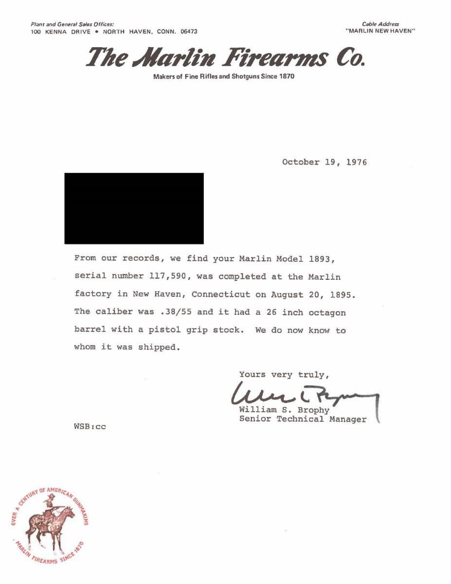 ACTION RIFLE. Cal. 38-55. S# 117590. Case colored action with No. 1 factory engraving. Left side of receiver features a circular vignette of a whitetail buck surrounded by fancy borders & highlights of Arabesque scroll. Right side of receiver has fancy borders surrounding Arabesque scroll with a sunburst behind the loading gate. Complimenting scroll continues to the lower receiver, lever & bolsters. Breech block has a series of rolling single line spiral cuts with leaf type highlights. Matching spirals are found along upper surfaces of receiver & top tang. Top of receiver has the "Marlin Safety" trademark. Top tang marked "MODEL / 1893". Although not signed the engraving appears to be the work of Conrad Friedrich Ulrich Jr (1844-1925). Conrad Ulrich did almost all of the Marlin engraving from 1881 to 1910. Bbl. 26" octagon. German silver blade rocky mountain front sight with elevator adjustable sporting rear sight. Full length tubular mag. Capped rifle forearm & S curved pistol grip walnut stock with crescent steel buttplate. Forearm & stock have factory style B point pattern hand checkering. UNATTACHED ACCESSORIES: Marlin letter stating the following: "From our records, we find your Marlin Model 1893 serial number 117,590, was completed at the Marlin factory in New Haven, Connecticut on August 20, 1895. The caliber was .38/55 and it had a 26 inch octagon barrel with a pistol grip stock. We do now know to whom it was shipped". CONDITION: bbl. & mag. tube retain over 80% dull lightly faded original blue showing mild edge wear. Action retains over 50% faded visible case colors with spots of corrosion on sides of lever. Buttplate finish has faded to mottled gray. Top tang screw is replacement. Original wood finish & checkering show normal wear & age related darkening with scattered scratches & marks. Stock has sm. chips around top tang. Bore is bright with sharp rifling having a sm. area of light pitting near muzzle. PROVENANCE: From the life long collection of Robert Runge. (01-21661/DS). ANTIQUE. $10,000-15,000.