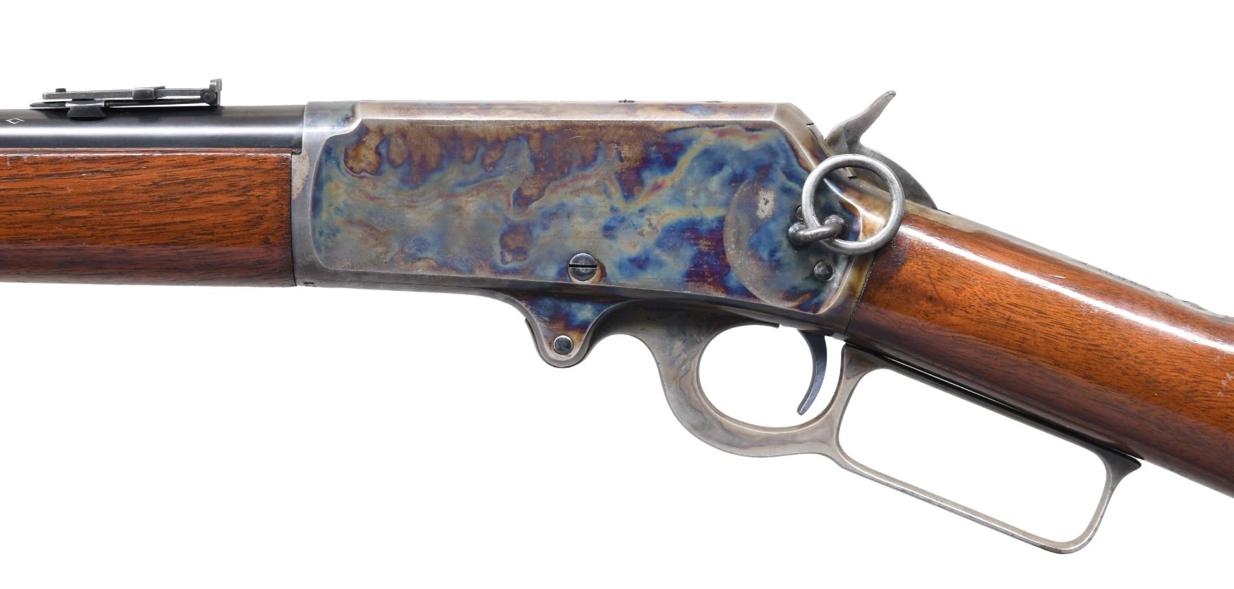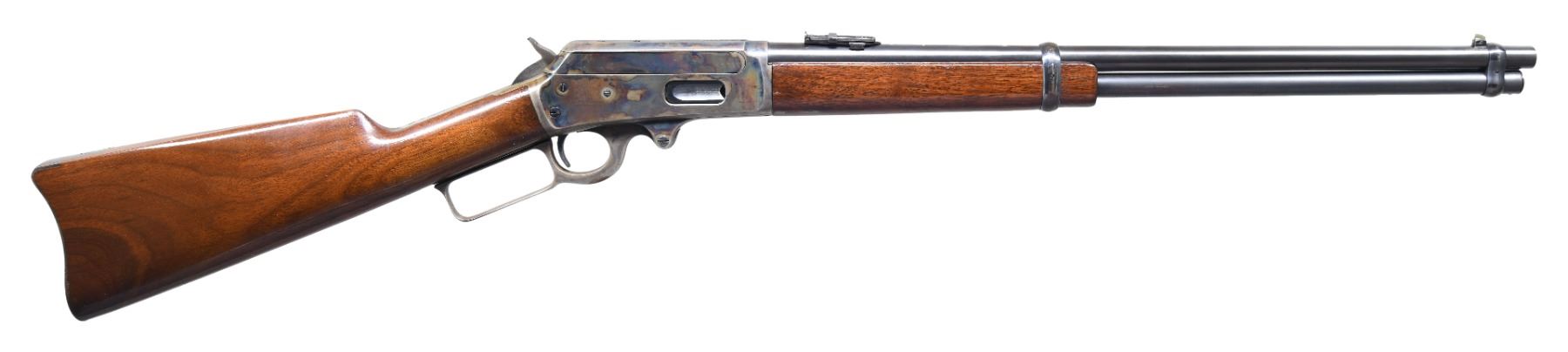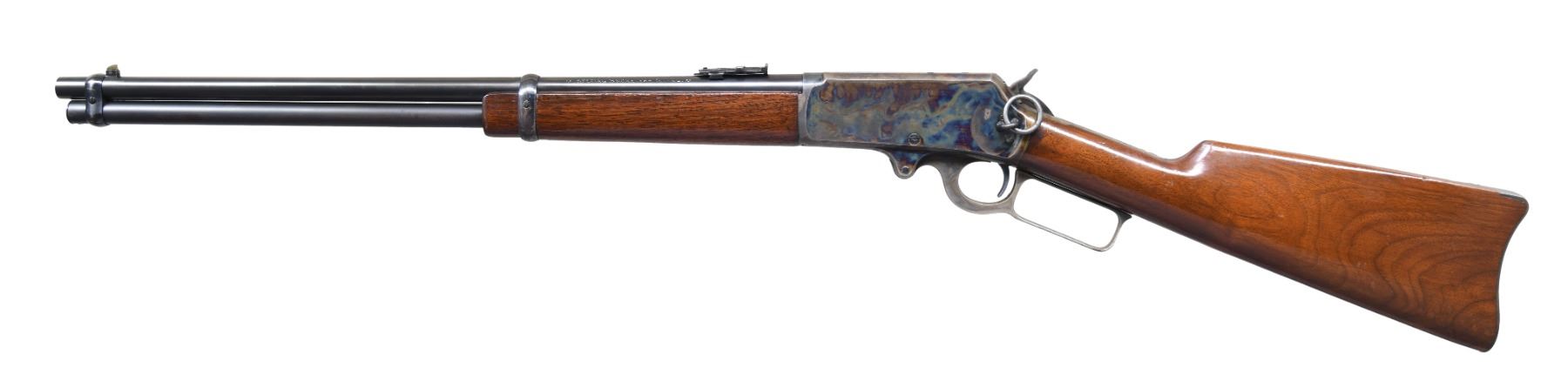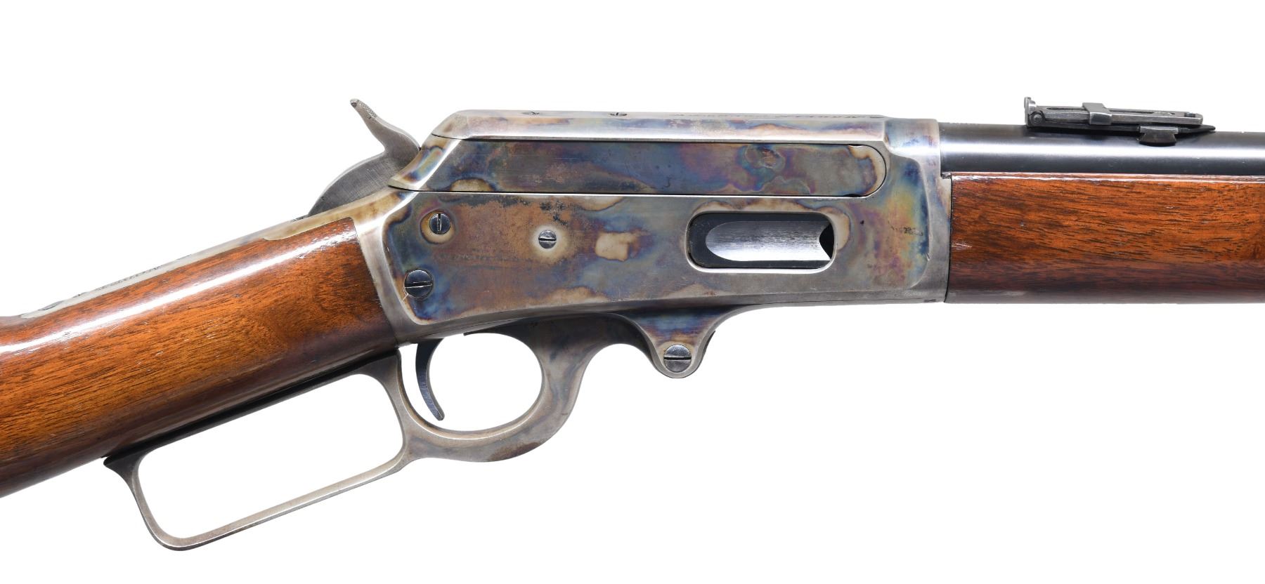 Cal. 38-55. S# 384817. Bbl 20" with pinned German silver front sight and carbine leaf rear sight. Full length mag. Blue finish with case colored action. Action has saddle ring on left side. Carbine forearm and straight grip walnut stock with steel carbine buttplate. CONDITION: very nice original carbine. Bbl and mag tube have over 90% blue showing small scratches. Action retains 80% case colors showing fading in carrying areas. Good original wood finish shows scattered light scratches and marks. Very good bright bore. (25-1155/DS). CURIO. $2,500-3,500.