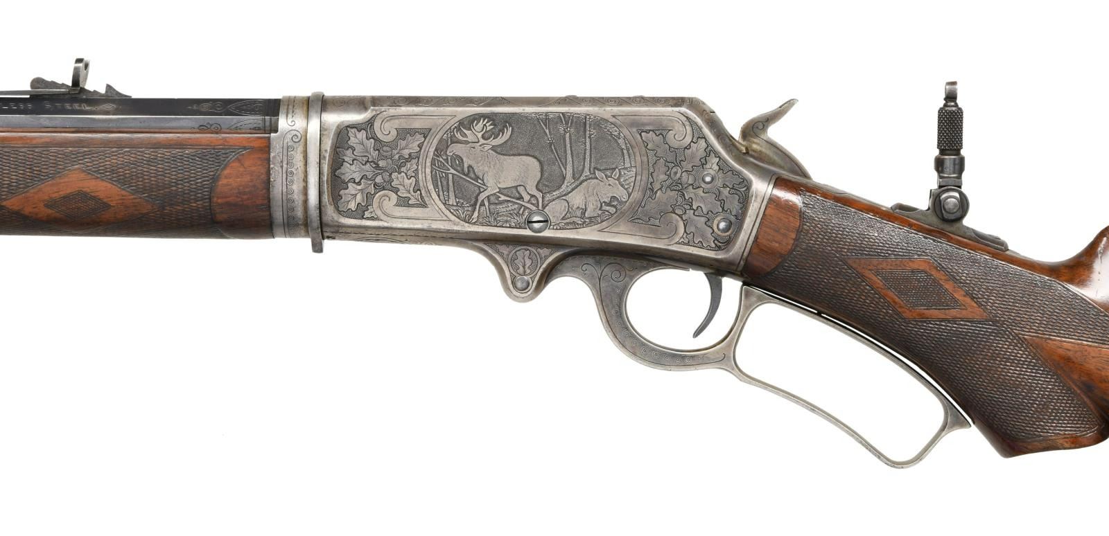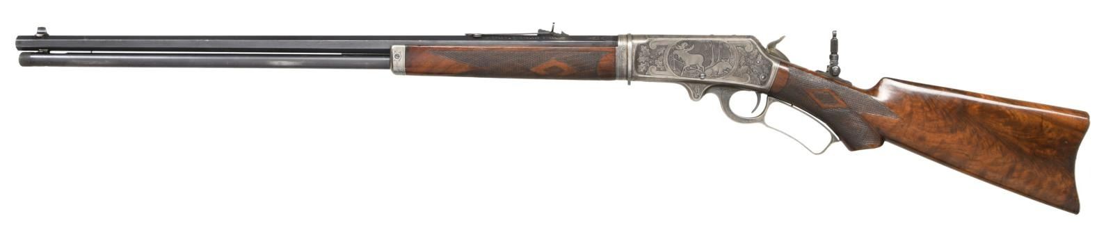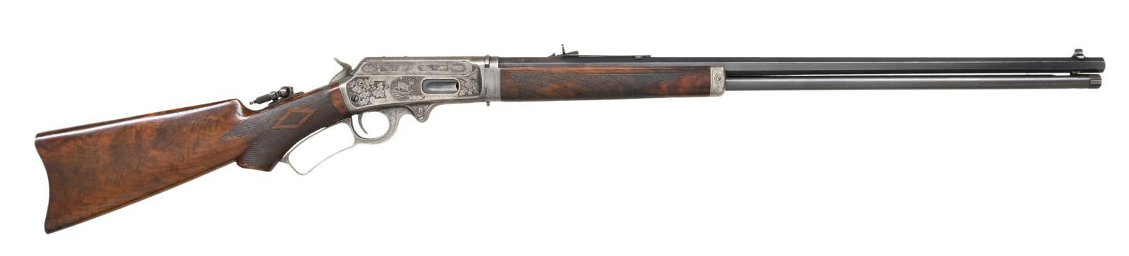 TAKEDOWN LEVER ACTION RIFLE. Cal. 30-30. S# 355083. Bbl. 26" octagon. Sporting front & rear sight w/ combination tang sight. Full length takedown mag. Case colored action has 5-3 factory engraving. Left side game scene depicts two moose. Right side scene shows a running whitetail buck. Balance of receiver sides feature oak leaf engraving w/ punch dot backgrounds & straight line borders. Complimentary engraving extends to upper and lower receiver areas, lever, breech end of bbl. & nickel finished forearm cap. Forearm & S curved pistol grip stock of fancy walnut w/ engraved crescent steel buttplate. Style F factory checkered stock. Forearm has style D factory checkering. WEIGHT: 8 lbs, 3.6 ozs. Mfg. 1906. CONDITION: bbl. & mag. tube retain 80% lightly worn blue showing edge wear. Action has 70% lightly faded case colors. Forend cap retains 80% nickel finish. Wood shows moderate finish & checkering wear w/ numerous scratches, marks & small dents. Bore has dark frosted appearance with sound rifling. (23-4799/DS). CURIO. $20000-30000.