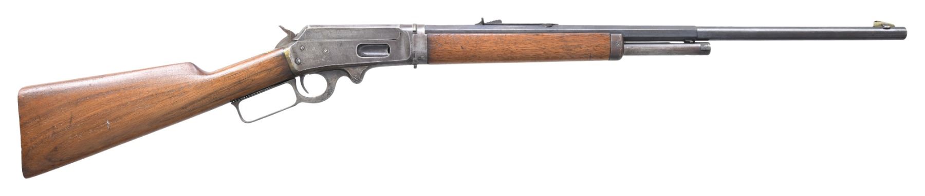 Cal. 38-55. S# 360243. Bbl is 24" octagonal to round takedown style. 2/3 length mag. Rocky mountain front with flattop sporting rear sight. Walnut forearm w/ straight grip stock. CONDITION: bbl retains 30% dull fading blue showing spots of surface corrosion. Action has faded to gray showing surface corrosion w/ areas of pitting on left side of receiver w/ dents around takedown area. Stocks have added finish over heavy wear w/ spots of darkened appearance, scratches, marks and small dents. Buttplate not present. Good mechanics. Lightly pitted bore retains sound rifling. (25-1544/DS). CURIO. $800-1,200.