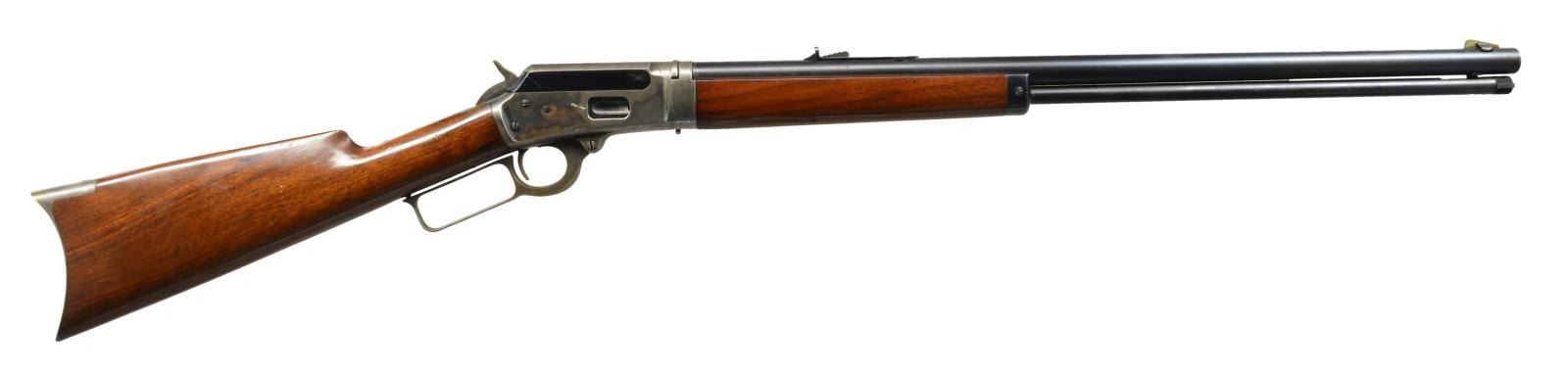 Cal. 25-20 Marlin. S# 172690. Bbl. 24" rnd. w/ Rocky Mountain front sight & sporting rear sight. Full length mag. Case colored takedown action. Walnut forearm & straight grip stock w/ case colored steel buttplate. 1898 Mfg. CONDITION: bbl. & mag. tube retain 90% lightly faded blue showing sm. wear spots & scratches. Receiver, lever & buttplate retain 70% light & fading case colors showing a series of sm. dents around takedown lever at bottom of action. Stocks have lightly worn original finish showing scratches & marks. Bore retains largely intact rifling showing spots of deep pitting. (01-18797/DS). ANTIQUE. $1,000-1,500.