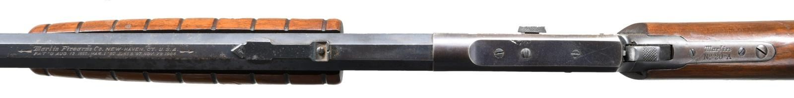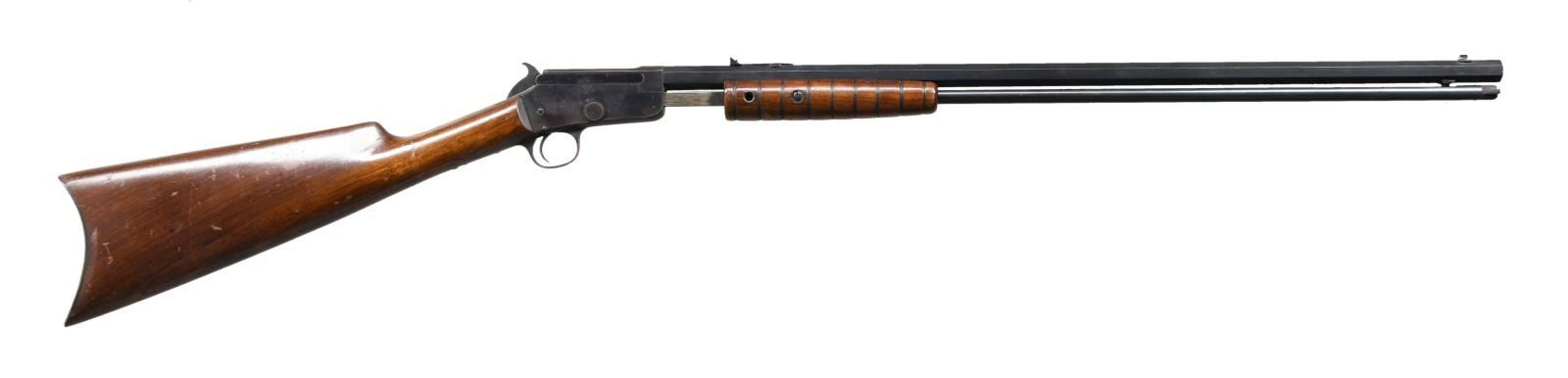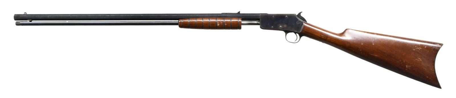 Cal 22 S, L or LR. NSN. Bbl. 24" octagon. Takedown action, fixed sights, full length magazine tube, blued finish, 9 groove forend & straight grip smooth buttstock w/ crescent buttplate. CONDITION: metal retains about 80% blue blending w/ freckling, staining, high edge wear & scratches. Trigger guard & tang are a brown patina. Stock set shows numerous gouges, scrapes & dents. Bore is fair plus w/ visible but worn rifling & frosting/light pitting throughout. (23-1582/CW). CURIO. $200-300.