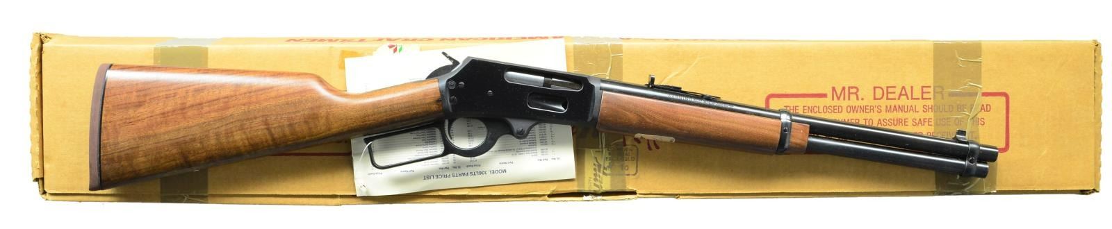 Cal. 30-30. S# LTS02551. Bbl. 16". Manufactured 1988-1989. Blued finish on exposed metal surfaces. Blade front & elevation adjustable buckhorn rear sights. Serial number on top rear tang. Hardwood stock & forend. Cross slide receiver safety below hammer. UNATTACHED ACCESSORIES: factory cardboard box, hammer spur extension. CONDITION: all aspects indicate very little use, if any. Forend still retains factory sticker & owners manual connected to lever. Finish coverage is complete & consistent w/ no noticeable wear. Wood forend still retains factory sticker. No obvious blemishing on furniture. Bore is bright w/ strong rifling. PROVENANCE: Estate collection of Thomas F. Wolfinger. (22-6102/JZ). MODERN. $400-600.
