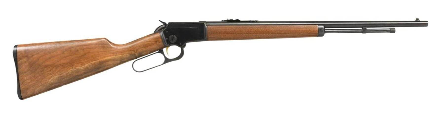 Cal. 22 S, L, LR. S# W6366. Bbl. 20 3/8". Model 39 lever action carbine mfg. by Marlin Firearms Co. The left side of the bbl. is marked with Marlin's mfg. information above the cal. designation and "MICRO-GROOVE BARREL", followed by "MARLIN 39 CARBINE" in gold colored characters. Metal components exhibit a blued finish overall. Plain wood straight grip buttstock and forend. Brass beaded blade front sight with U-notch rear sight. CONDITION: metal components retain the vast majority of their original factory finish overall, exhibiting a few spots of light wear from cycling of the action and a couple superficial handling marks. Mirror bore, exhibiting well defined rifling throughout. Wood furniture exhibits a few marks from handling and storage, but is otherwise very good overall. (23-5996/MLW). MODERN. $350-500.