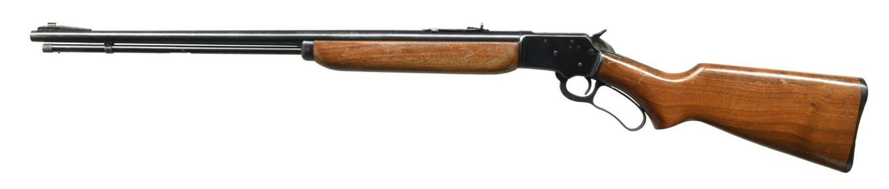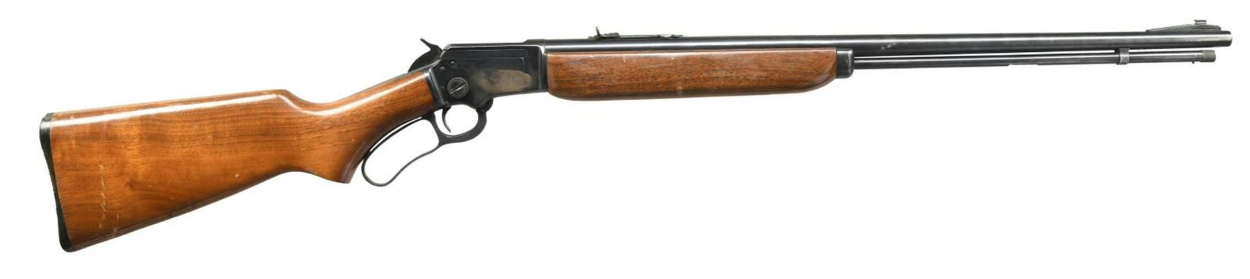 Cal. 22 S, L, LR. S# D19370. Bbl. 24". Model 39A lever action rifle mfg. by Marlin Firearms Co. circa. 1947-1948. The left side of the bbl. is marked with Marlin's mfg. information, followed by the model and cal. designations. Metal components exhibit a blued finish. Plain wood pistol grip buttstock and forend. Ramped brass bead front sight with V-notch rear sight. Buttstock no longer retains its sling swivel. CONDITION: metal components retain the majority of their original finish, exhibiting mild wear and thinning overall, with a couple spots of pitting and mild surface oxidation. Right side of receiver exhibits an area of loss to the finish, appearing to be from heavy cleaning. Mirror bore, exhibiting well defined rifling throughout. Wood furniture shows scattered marks and minor impressions from handling and storage, with some flaking and wear to the varnish, but otherwise remains sturdy and serviceable. The Collection of Curtis H Halvorson. (23-5952/MLW). CURIO. $300-400.