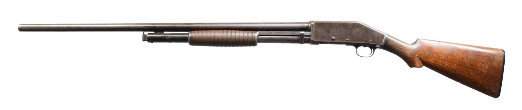 Cal. 12 GA. S# 12229. Bbl. 30". Model 43 pump action shotgun mfg. by Marlin Firearms Co. Left side of the bbl. is marked with Marlin's mfg. and patent information, followed by "12.Ga.". Underside of the receiver is marked with the S# and model designation. Metal components exhibit a blue finish. Plain wood pistol grip buttstock with grooved wood pump. Top of bbl. exhibits a matte strip. Bead front sight is absent. CONDITION: metal components retain traces of their original factory blue finish, with the balance exhibiting wear through to gray and brown patinas, with remnants of lacquer present overall. Mirror bore. Wood furniture shows scattered marks and impressions from handling and storage but otherwise remains sturdy and serviceable. Buttstock exhibits a chip on the right side of the toe, with the buttplate exhibiting a chip on either side of the toe. (24-3529/MLW). CURIO. $200-300.