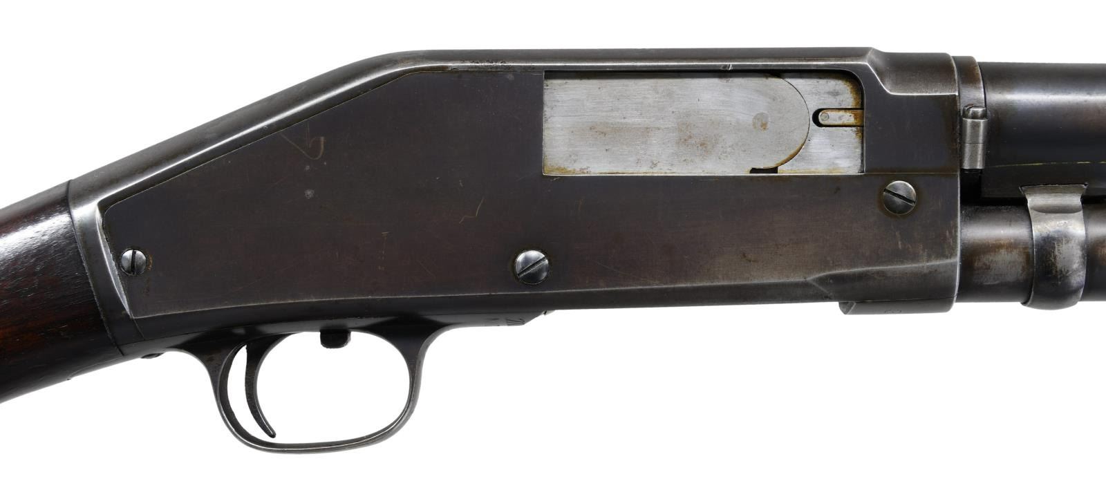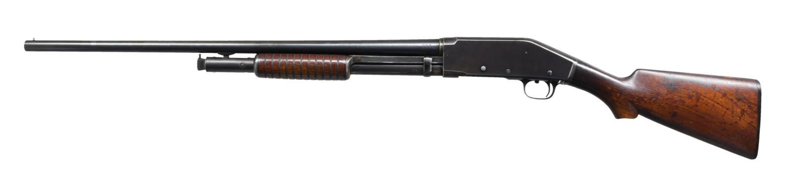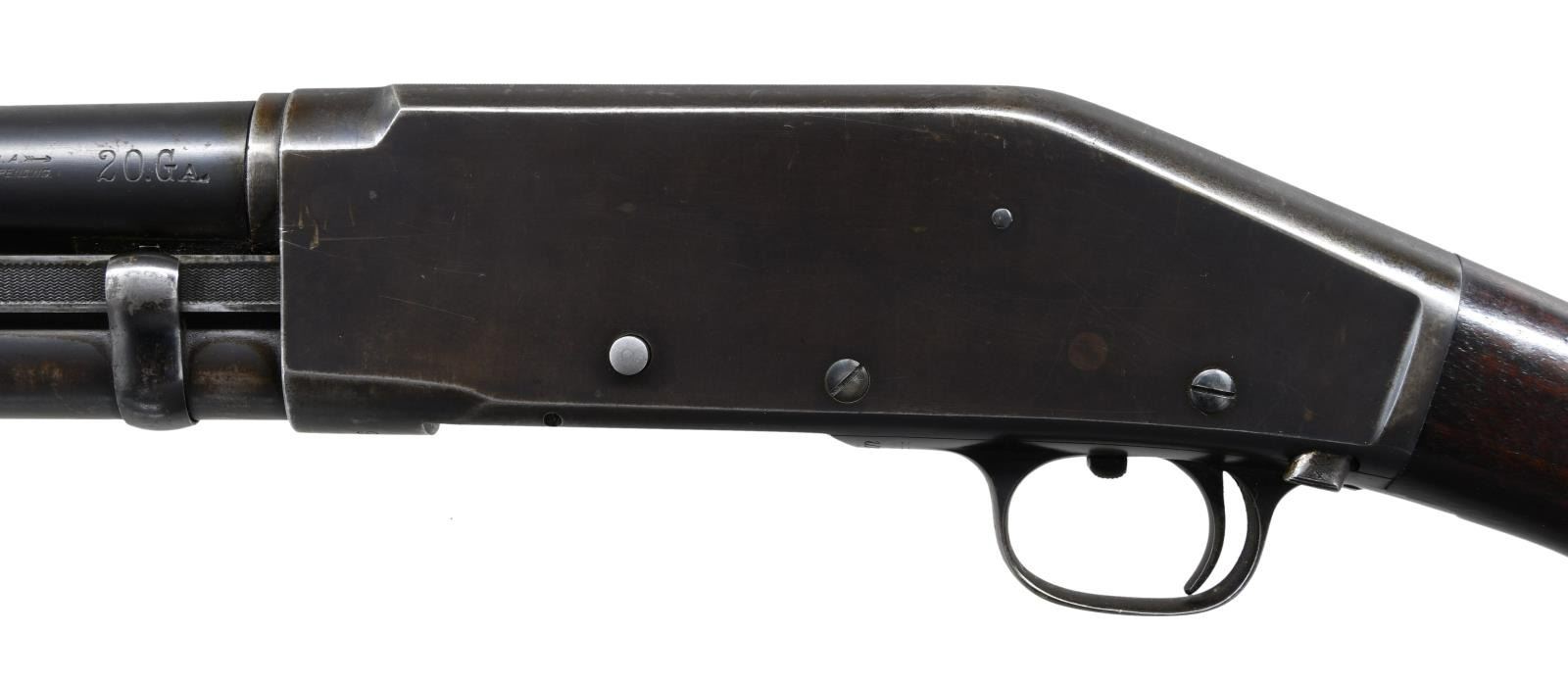Cal. 20 Ga. S# 3786. Bbl. 25". Front bead sight atop matted Bbl. w/ a fixed "MOD" choke. Blued finish, safety button is forward of the trigger. 11 groove forend & pistol grip buttstock w/ 12 1/2" LOP to grooved buttplate. These were Mfg. in limited numbers from 1923 to 1935 & only offered in 20 Ga. CONDITION: metal retains about 70% thinning & fading blue finish w/ scattered freckling, rust, scratches & dings. Stock set shows moderate to heavy flaking to the butt; less so on the forend. Bore is near excellent, bright & quite shiny. (23-1456/CW). CURIO. $400-600.