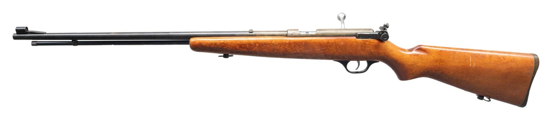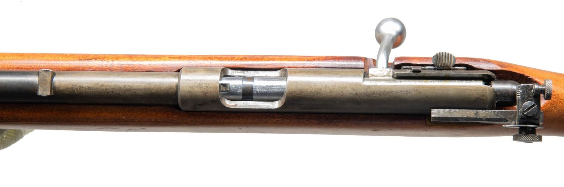 Cal. 22 S, L, LR. NSN. Bbl. 24". Receiver aperture rear sight & hooded bead front sight. Tubular mag. Hardwood stock. CONDITION: balance of blue is good with large portions of receive & rearward portion of bbl. has cold blue applied. Good wood finish. Strong rifling. (25-2766/MD). CURIO. $100-200.