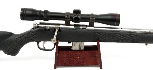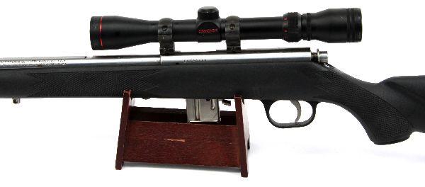 Marlin Model 882 bolt action sporting rifle, in .22 WMR. Stainless finish, with black synthetic stock, and Simmons 9x scope. Bore is good and clean, finish is about 80%, with some scratches and light rust spots, mostly on the barrel, and stock is very good. Overall good condition. Caliber: .22 WMR Serial #: 00394310