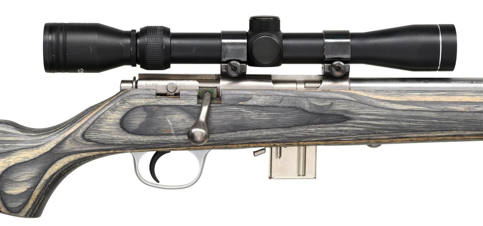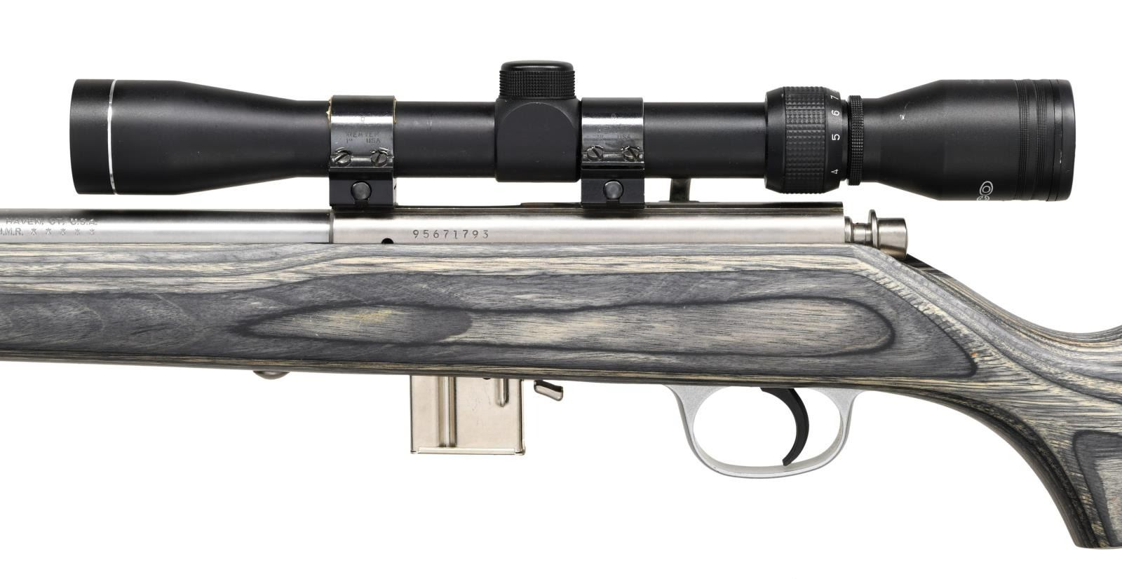 Cal. .17 HMR. S# 95671793. bbl 22". Stainless steel finish w. a gray laminated wood stock featuring a black rubber recoil pad. Receiver is mounted w/ a Tasco 3-9x scope. MAGS: 1 7 rd. CONDITION: Very good, w/ metal components exhibiting some superficial marks form handling and storage. Mirror bore, exhibiting well defined rifling throughout. Stock exhibits some light superficial marks from storage and handling, but is otherwise very good. Scope retains a clear and sharp image. PROVENANCE: From the estate collection of Thomas J. Mulligan. (23-2213/MLW). MODERN. $300-400.