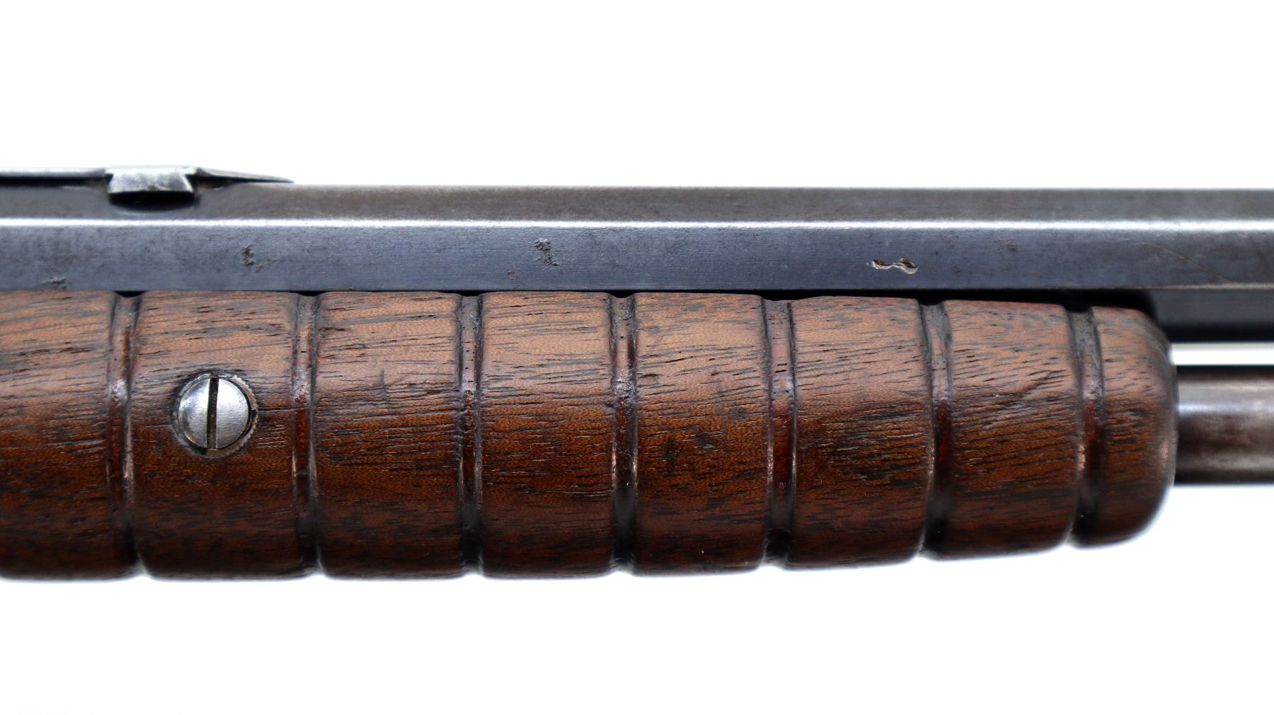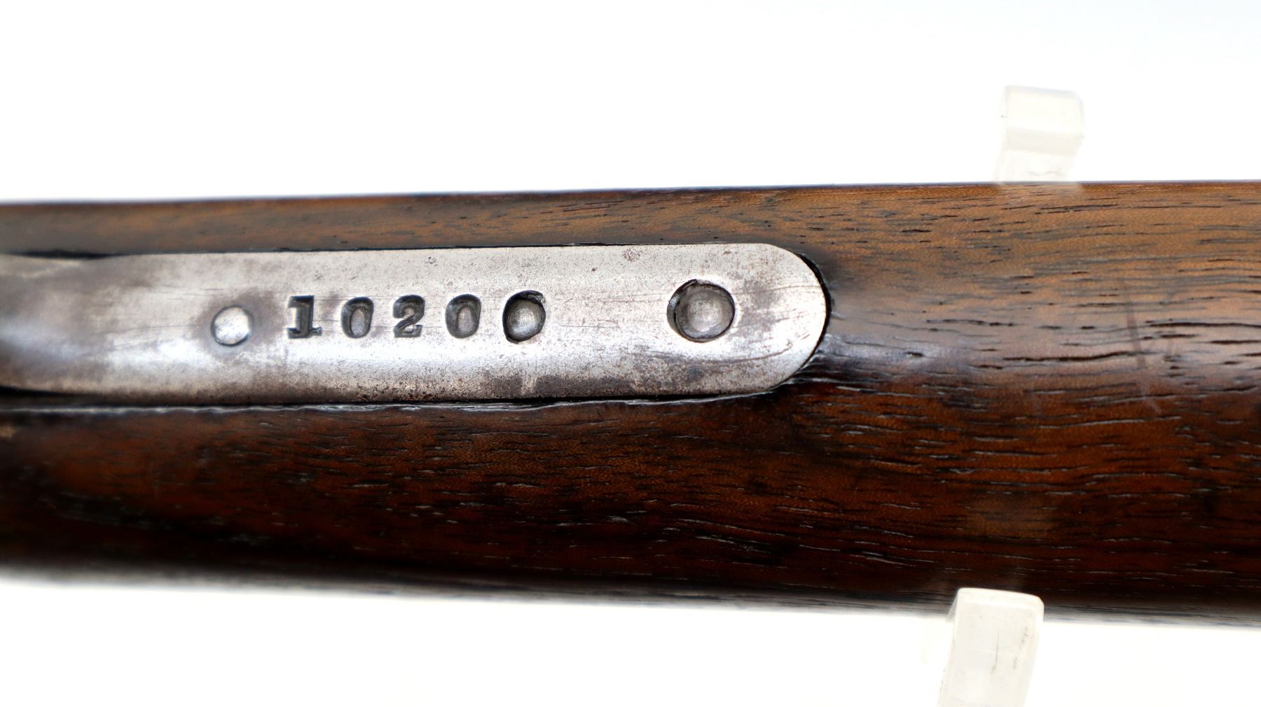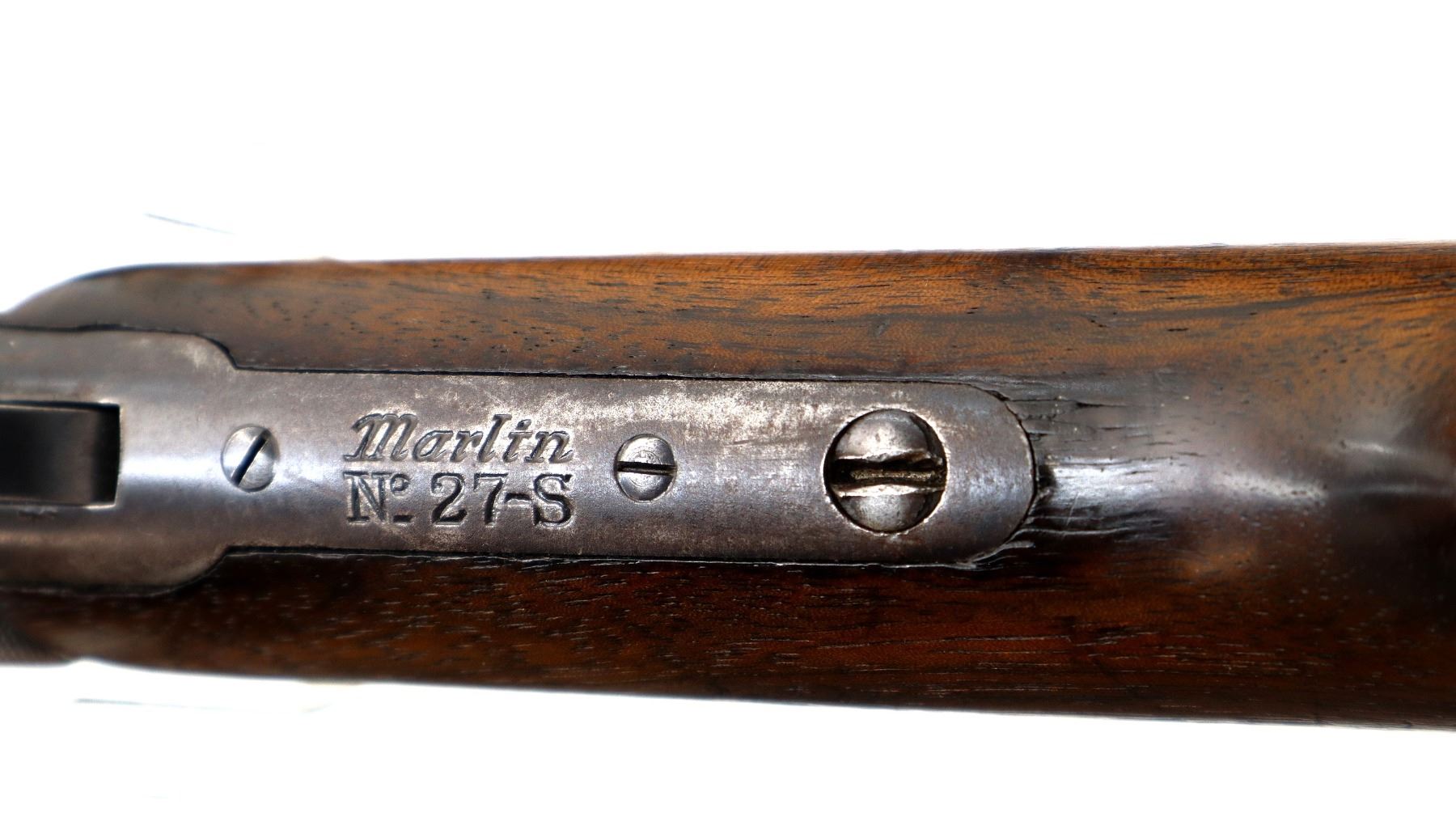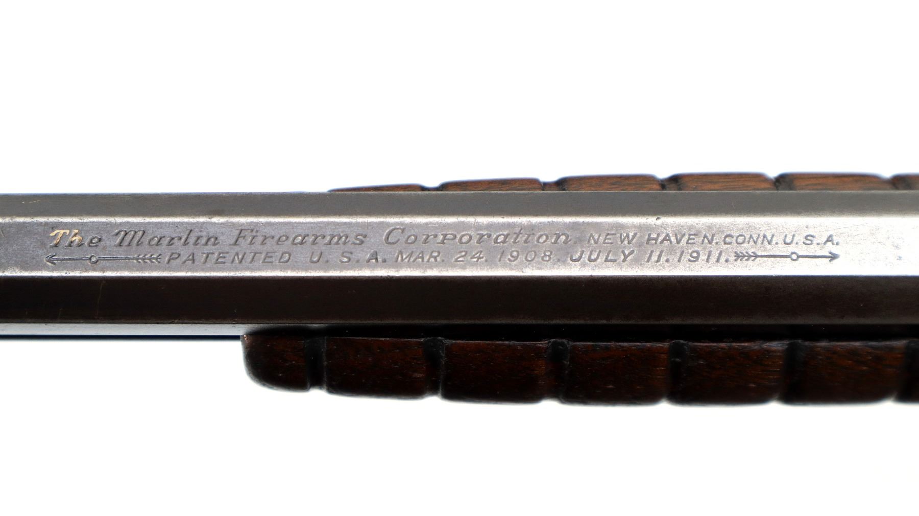 Main Description: Blade front sight, adjustable u notched rear sight, blued finish, octagon barrel, checkered spur hammer. Two piece wood stocks, grooved forearm which is cracked, straight grip cracked behind upper and lower tangs, smooth curved steel butt plate, Marlin Bullseye
