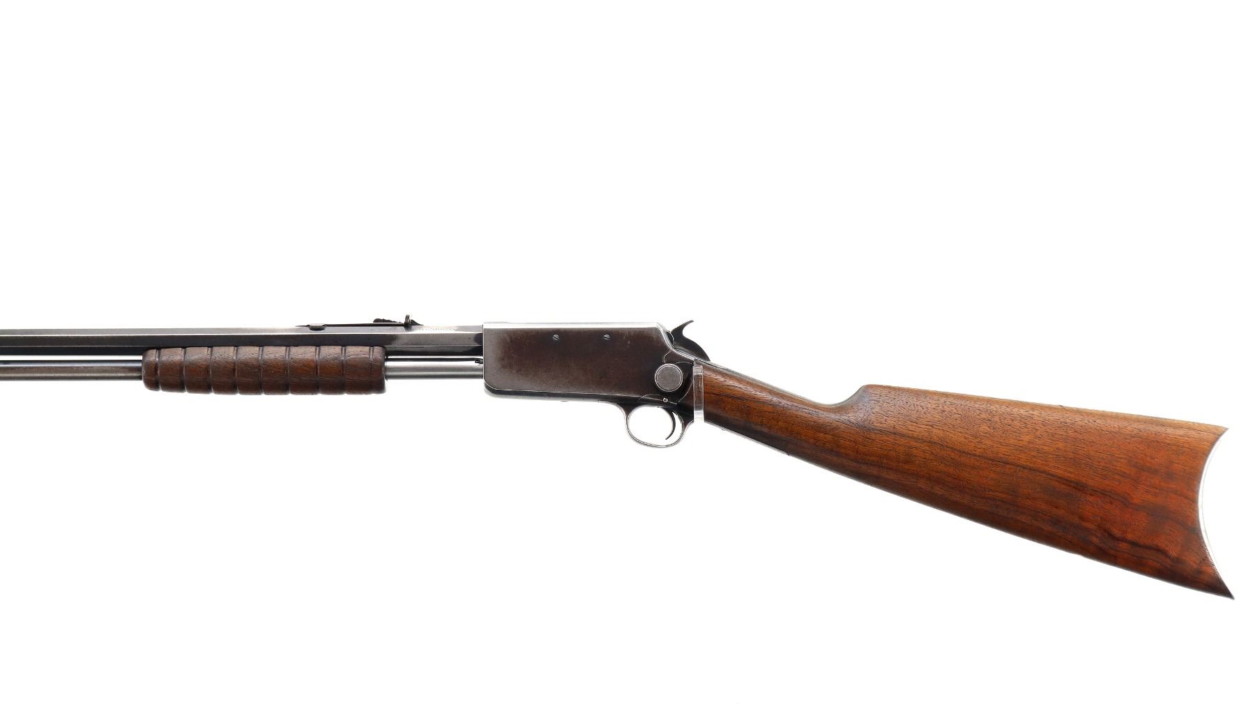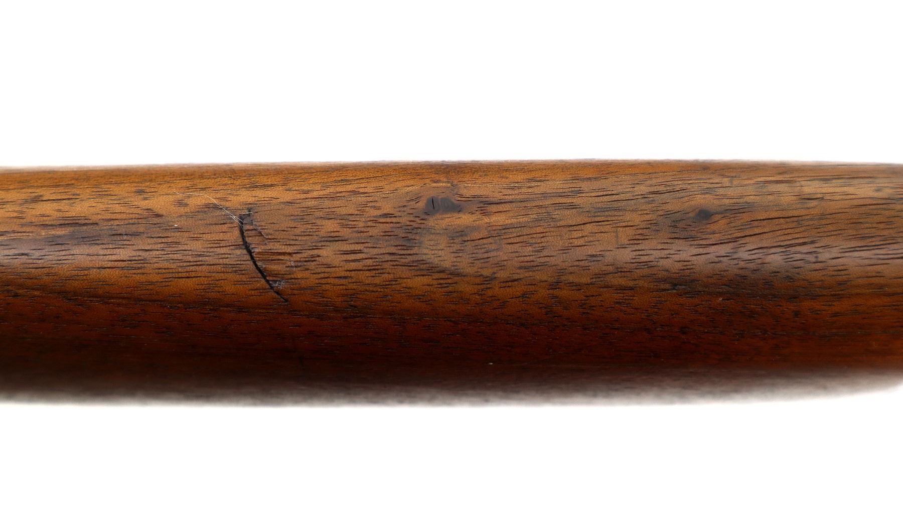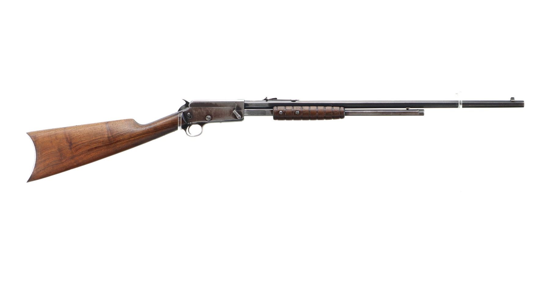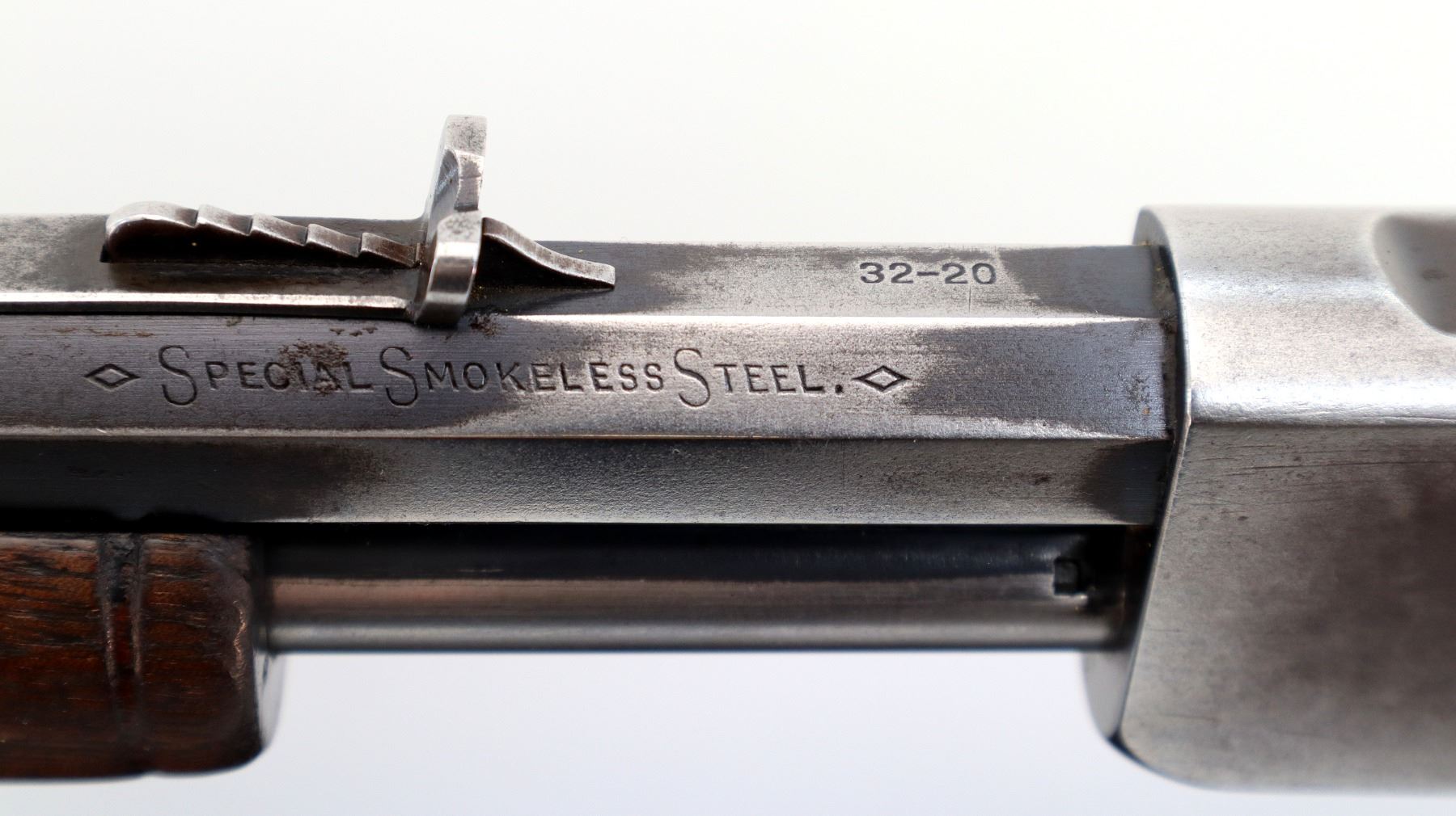 Main Description: Blade front sight, adjustable u notched rear sight, blued finish, octagon barrel, checkered spur hammer. Two piece wood stocks, grooved forearm which is cracked, straight grip cracked behind upper and lower tangs, smooth curved steel butt plate, Marlin Bullseye