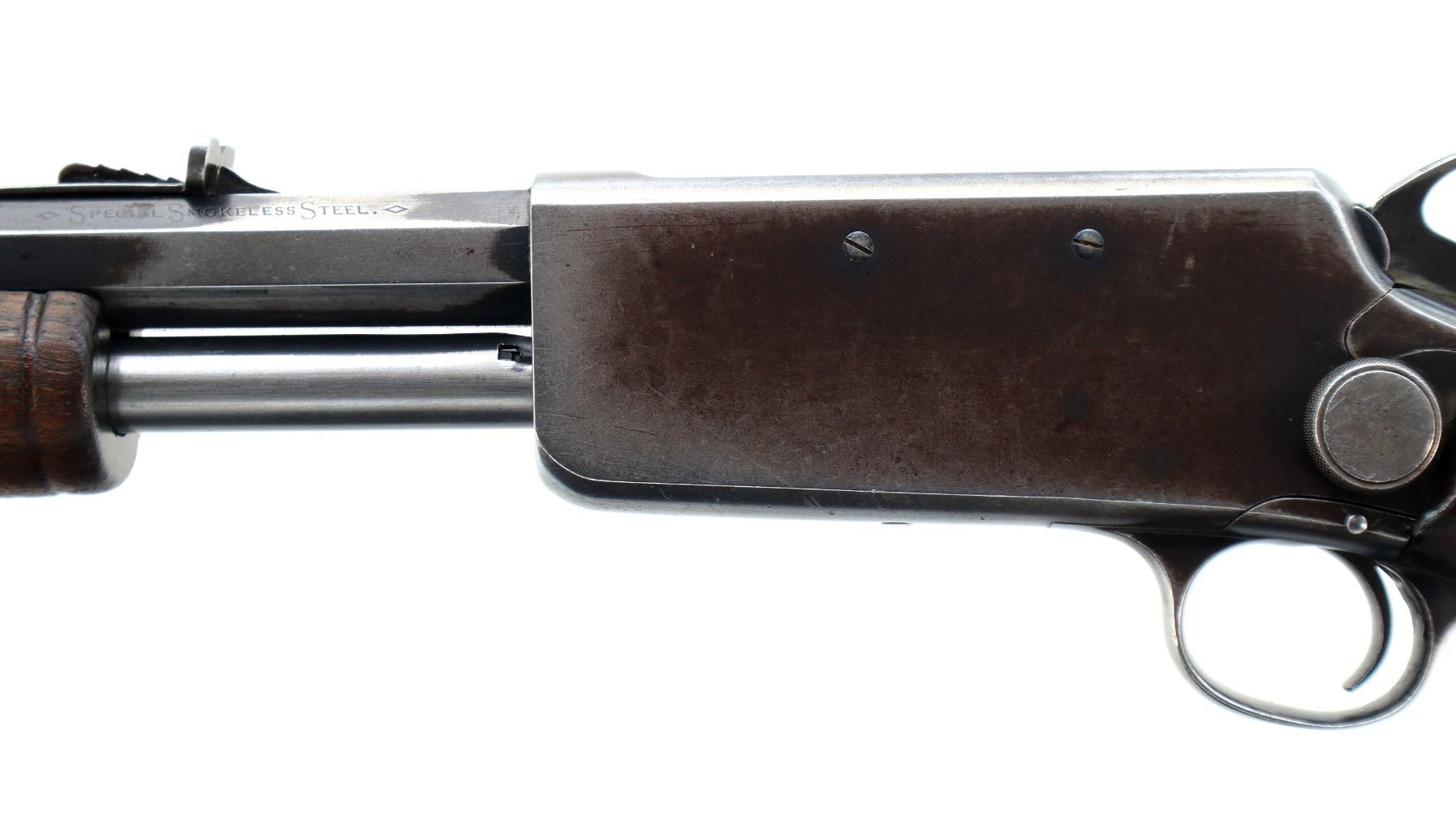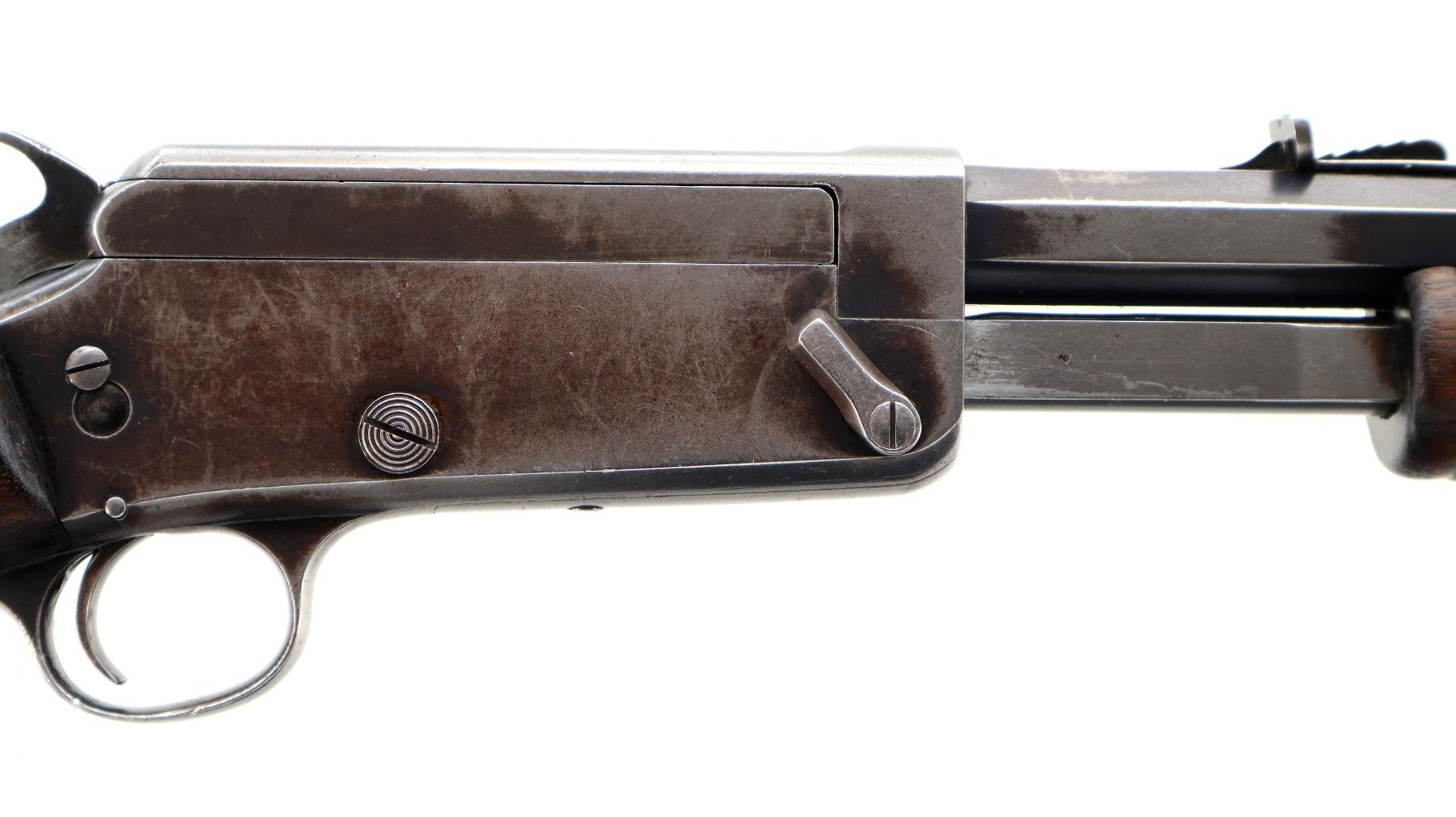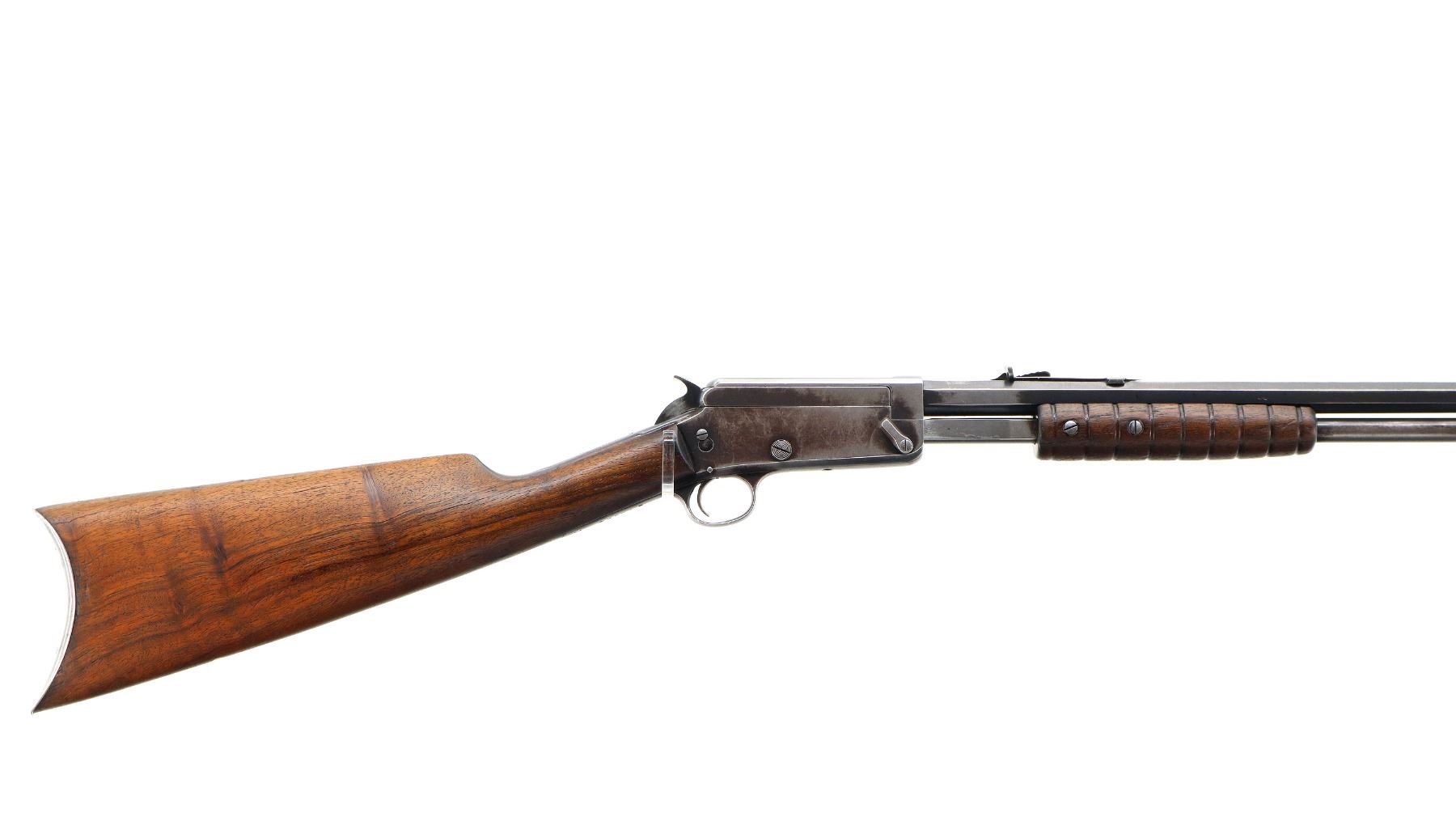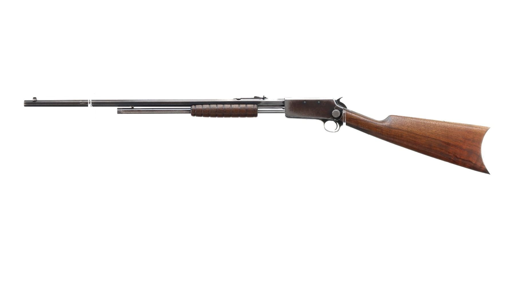 Main Description: Blade front sight, adjustable u notched rear sight, blued finish, octagon barrel, checkered spur hammer. Two piece wood stocks, grooved forearm which is cracked, straight grip cracked behind upper and lower tangs, smooth curved steel butt plate, Marlin Bullseye