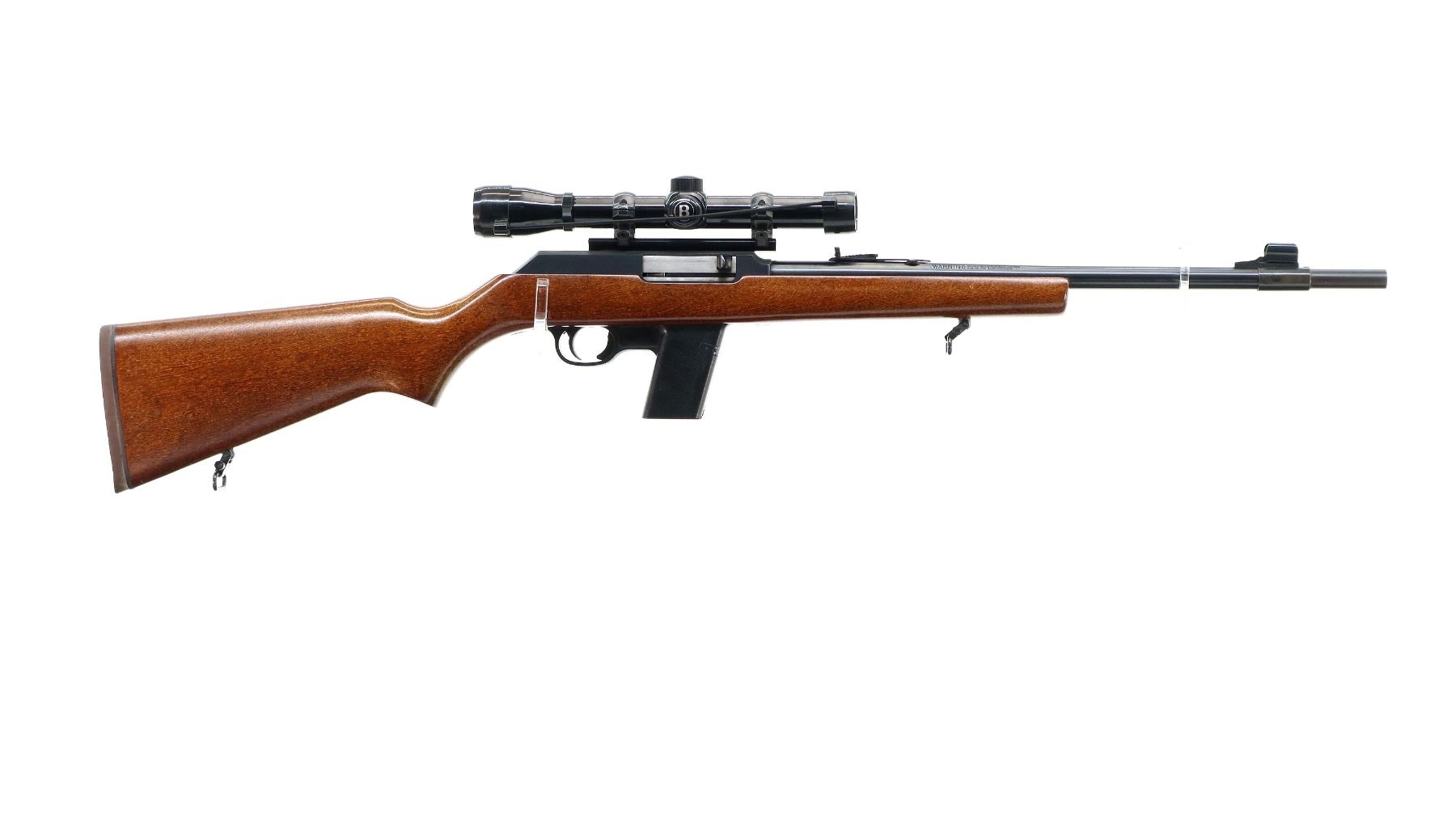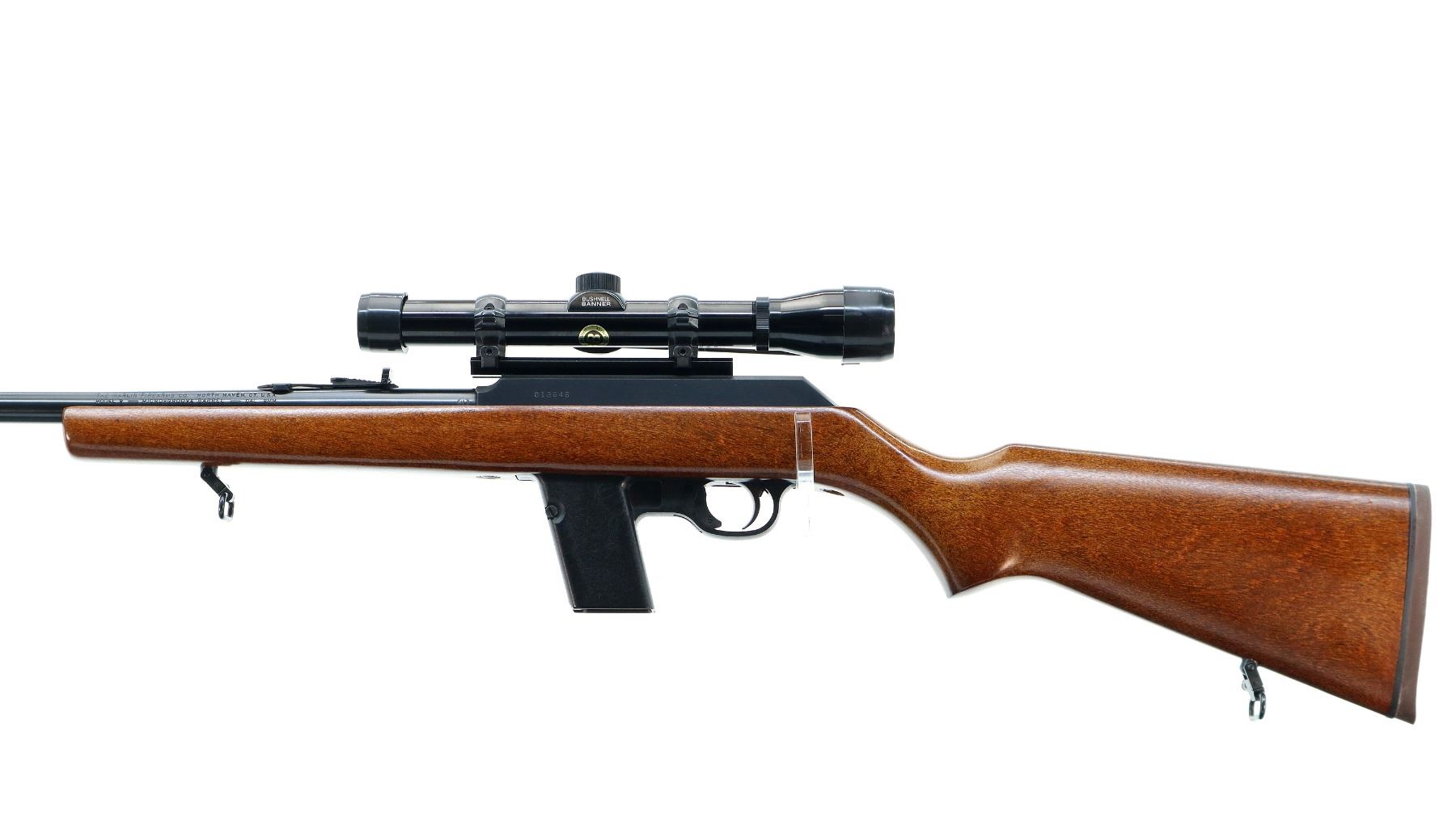 Main Description: Blade front sight with hood and ramp, adjustable folding u notched rear sight, blued finish, receiver drilled and tapped with Bushnell Banner 4x28 scope installed, clear optics with duplex crosshair. Smooth cocking handle. One piece wood stock, pistol grip, brown rubber recoil pad, sling swivels. Note: the barrel has a round extension which does not qualify as part of the barrel making this a restricted firearm.