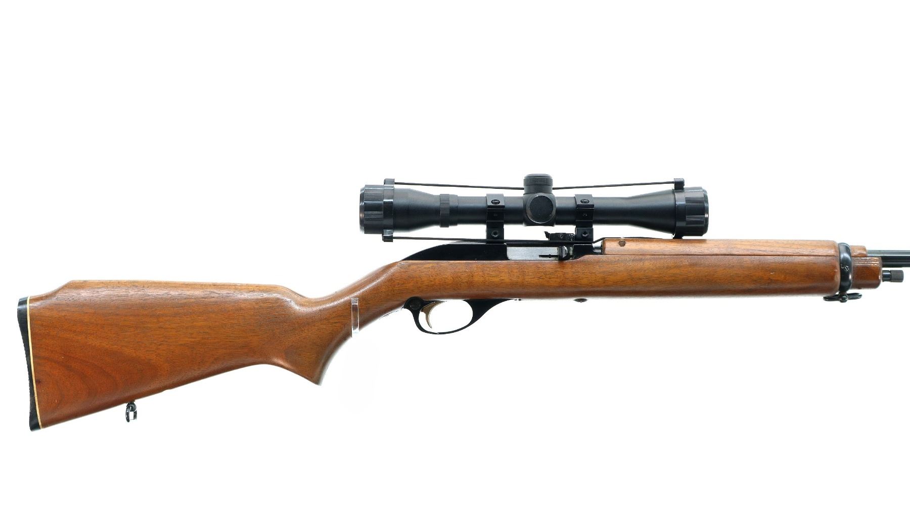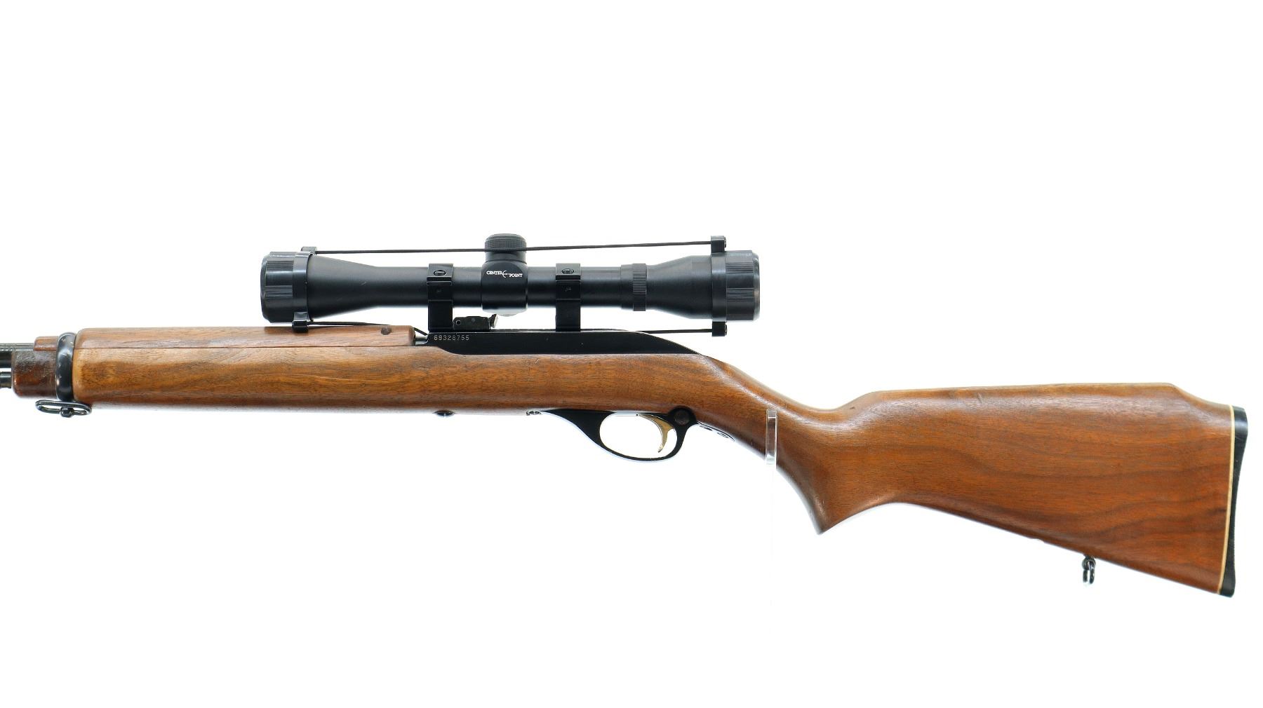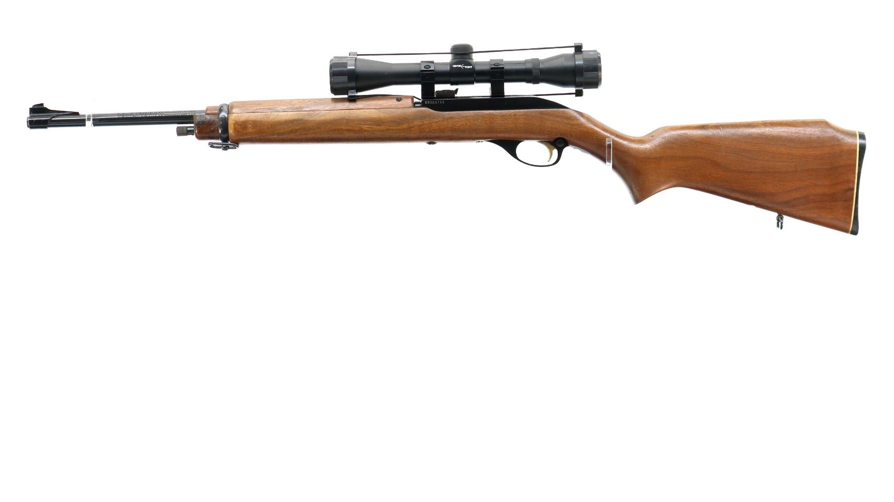 Main Description: Blade front sight with ramp, adjustable u notched rear sight, blued barrel, grooved black alloy receiver with Center Point 4x32 scope installed, clear optics with duplex crosshair. Two piece wood stocks, pistol grip, raised comb, checkered black polymer butt plate, Marlin Bullseye, gold trigger, sling swivels.