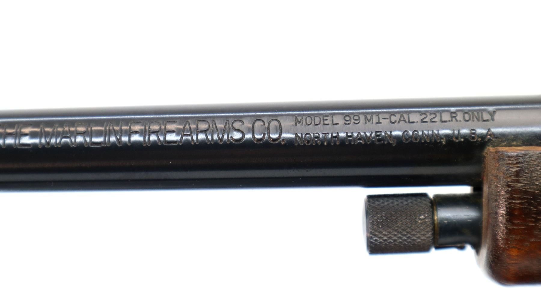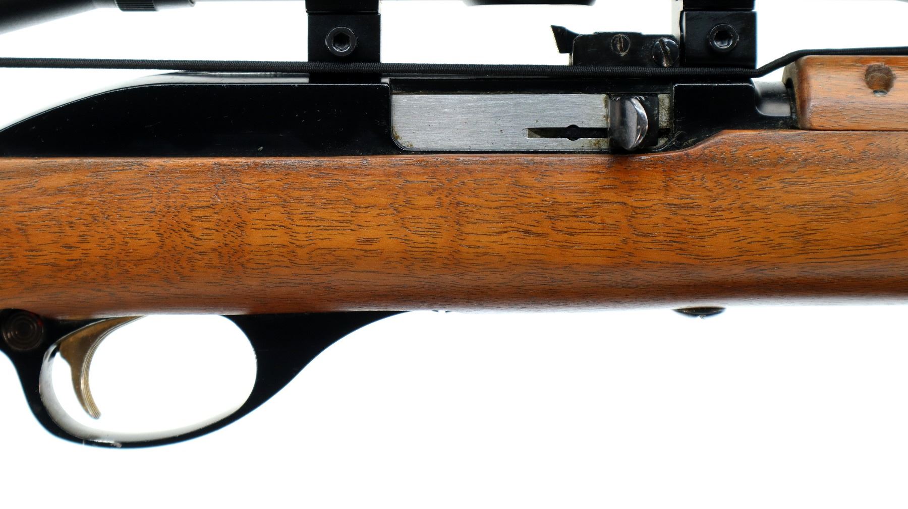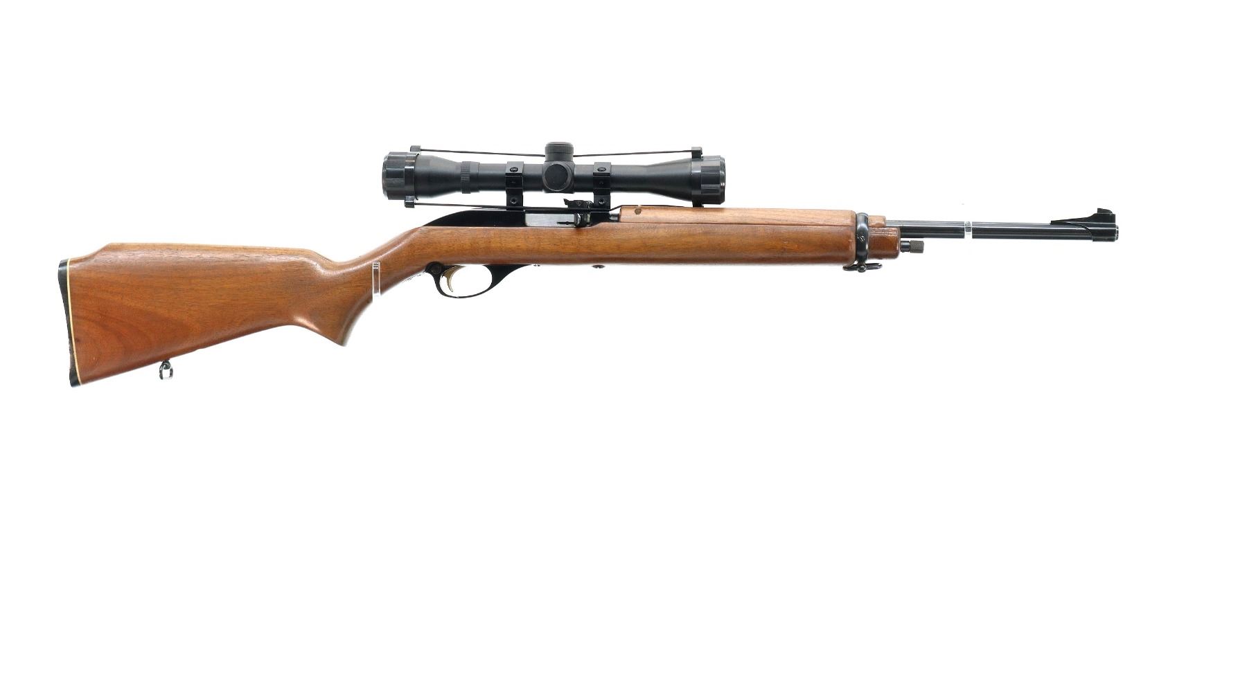 Main Description: Blade front sight with ramp, adjustable u notched rear sight, blued barrel, grooved black alloy receiver with Center Point 4x32 scope installed, clear optics with duplex crosshair. Two piece wood stocks, pistol grip, raised comb, checkered black polymer butt plate, Marlin Bullseye, gold trigger, sling swivels.