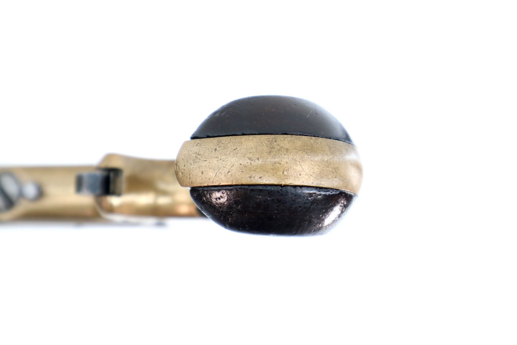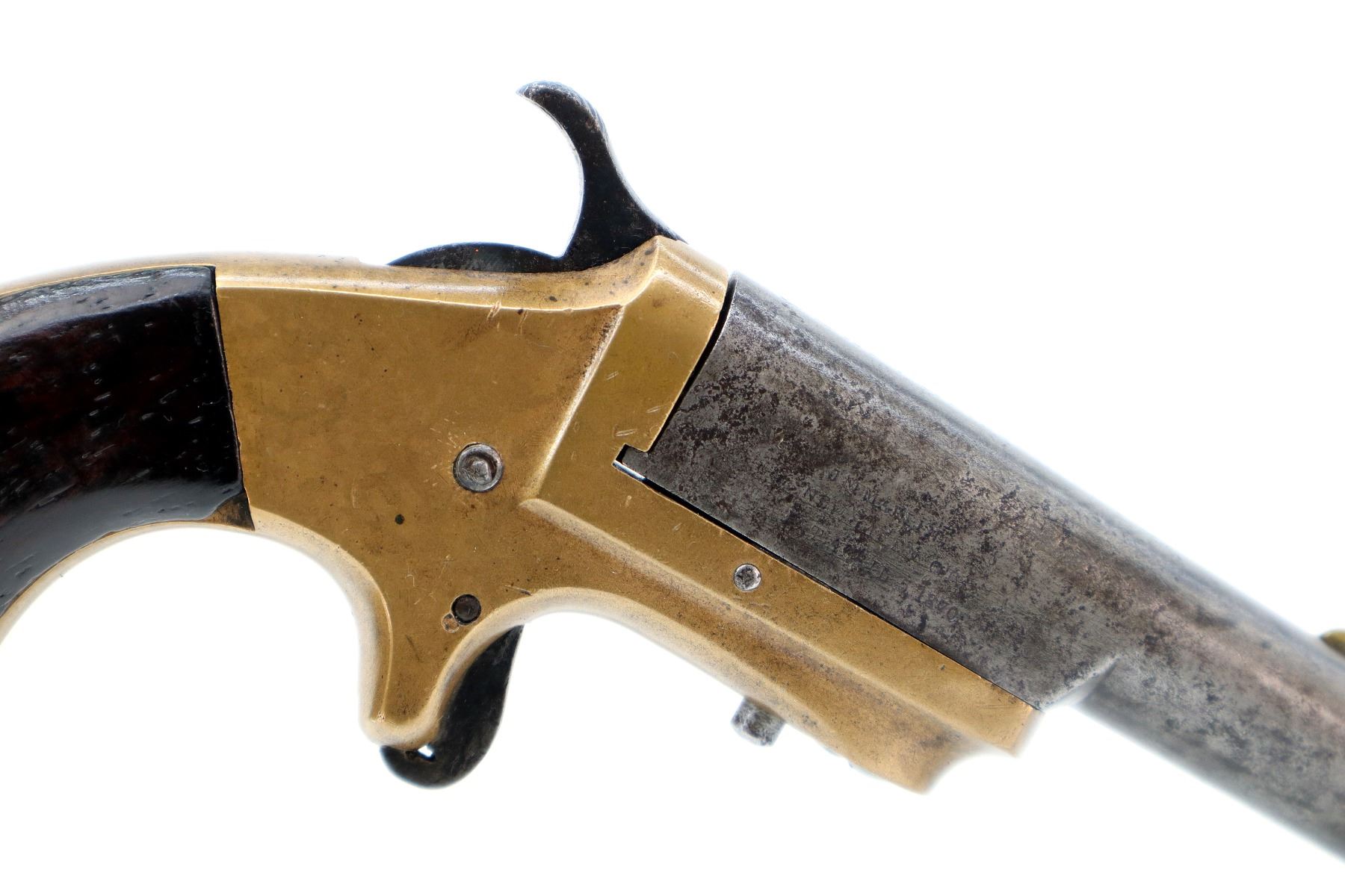 Main Description: Functions mechanically as designed, action does not stay cocked. Blade front sight, steel barrel, brass frame, checkered spur hammer and smooth trigger, extractor is present. Two piece smooth wood grips both are chipped.