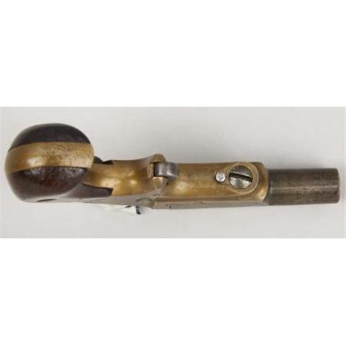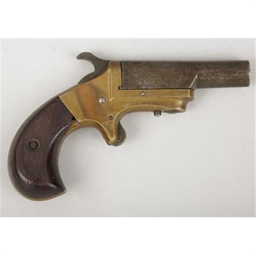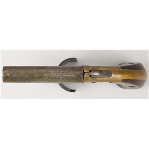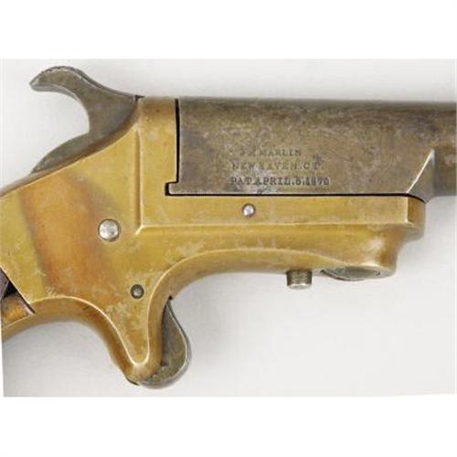 <B>MARLIN NEVERMISS SINGLE SHOT DERINGER</B></I> - Serial number 10999, circa 1870s. 2 ½” round barrel in .32 rimfire caliber. Top of barrel stamped “NEVERMISS'. Marlin patent stamp on right side of barrel flat. Functioning action with factory wood grips.<BR><BR><B>Condition:</B></I> Barrel has turned a brown patina. Pinched front sight missing but easily replaced. Brass frame retains a nice patina. Right wood grip has a small chip at its juncture with the frame.<BR><BR><b>Shipping:</b> Bats, Clubs, Sticks, Swords, Rif (<a target="_blank" href="http://www.heritageauctions.com/common/shipping.php">view shipping information</a>)