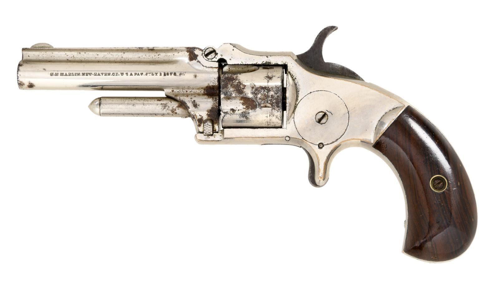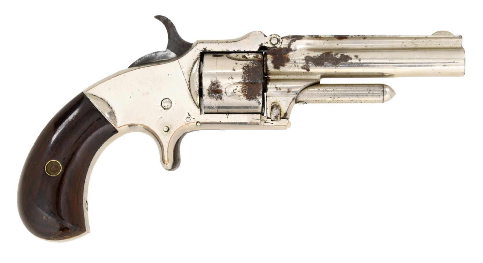 Cal. 32 RF Long. S# 8016. Bbl. 3". Rounded blade front sight. Left side of bbl. marked w/ J.M. Marlin patent. Cyl. does not always rotate when hammer is pulled & may require mechanical attention. Nickel finish. Smooth walnut grips. CONDITION: show scattered dings & handling wear. Metal retains 70% nickel w/ scattered flaking & oxidation. Worn pitted bore. (01-23588/MJC). ANTIQUE. $300-500.