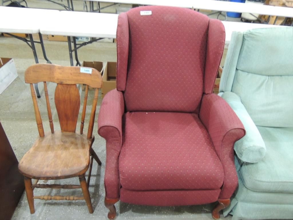 MAROON WING BACK RECLING CHAIR. GOOD CONDITION. AS SHOWN. SEE PHOTO FOR MORE DETAILS.