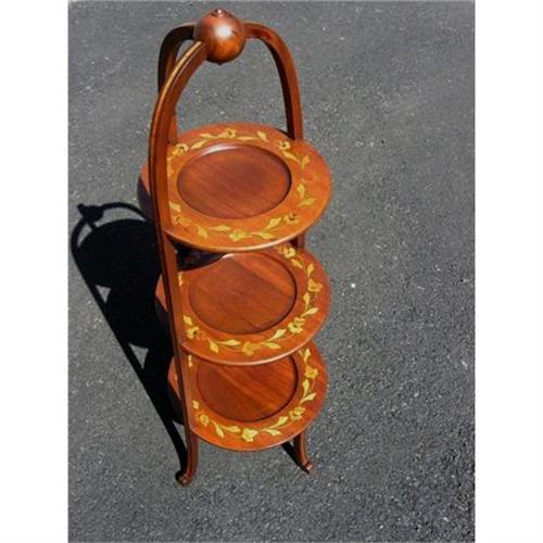 A GREAT MARQUETRY THREE TIER MUFFIN STAND IN ORIGINAL FINISH. THERE IS A SMALL AGE CRACK ON THE BOTTOM TIER BUT DOES NOT EFFECT THE STRUCTURE.