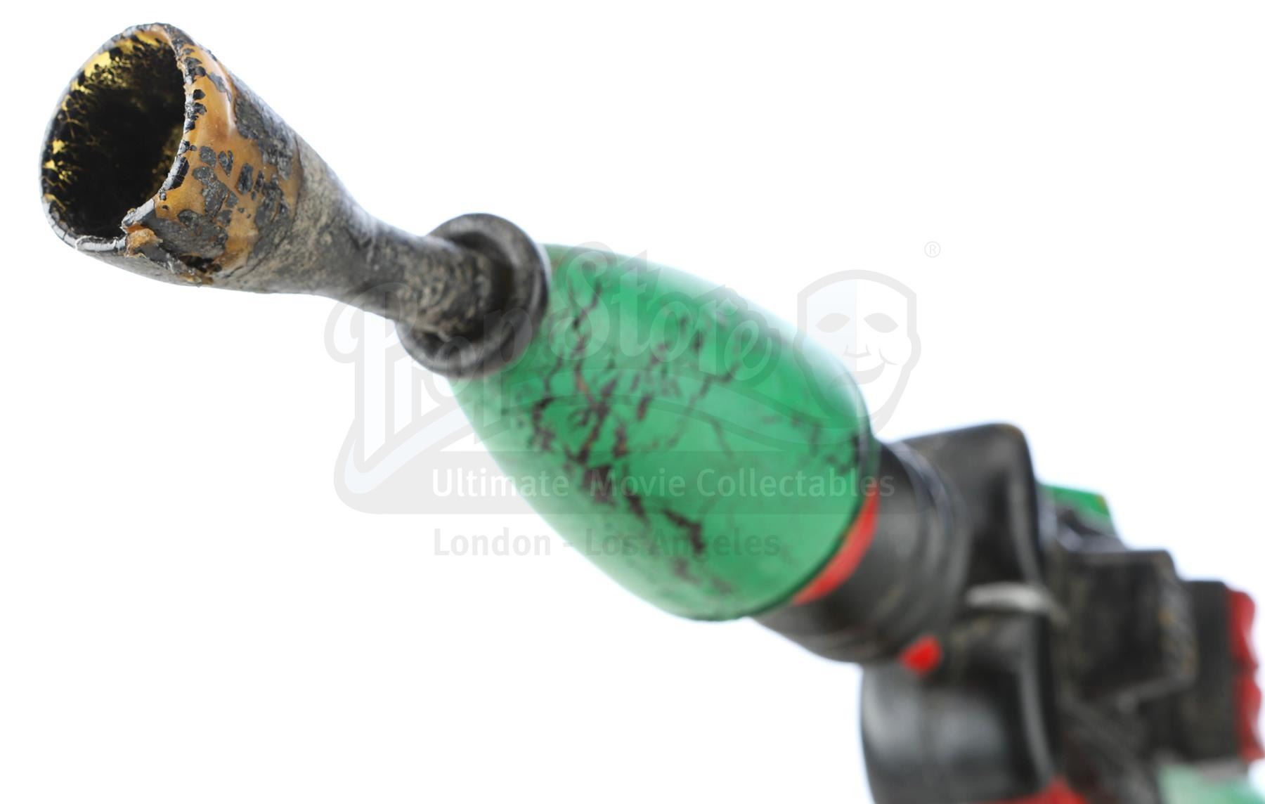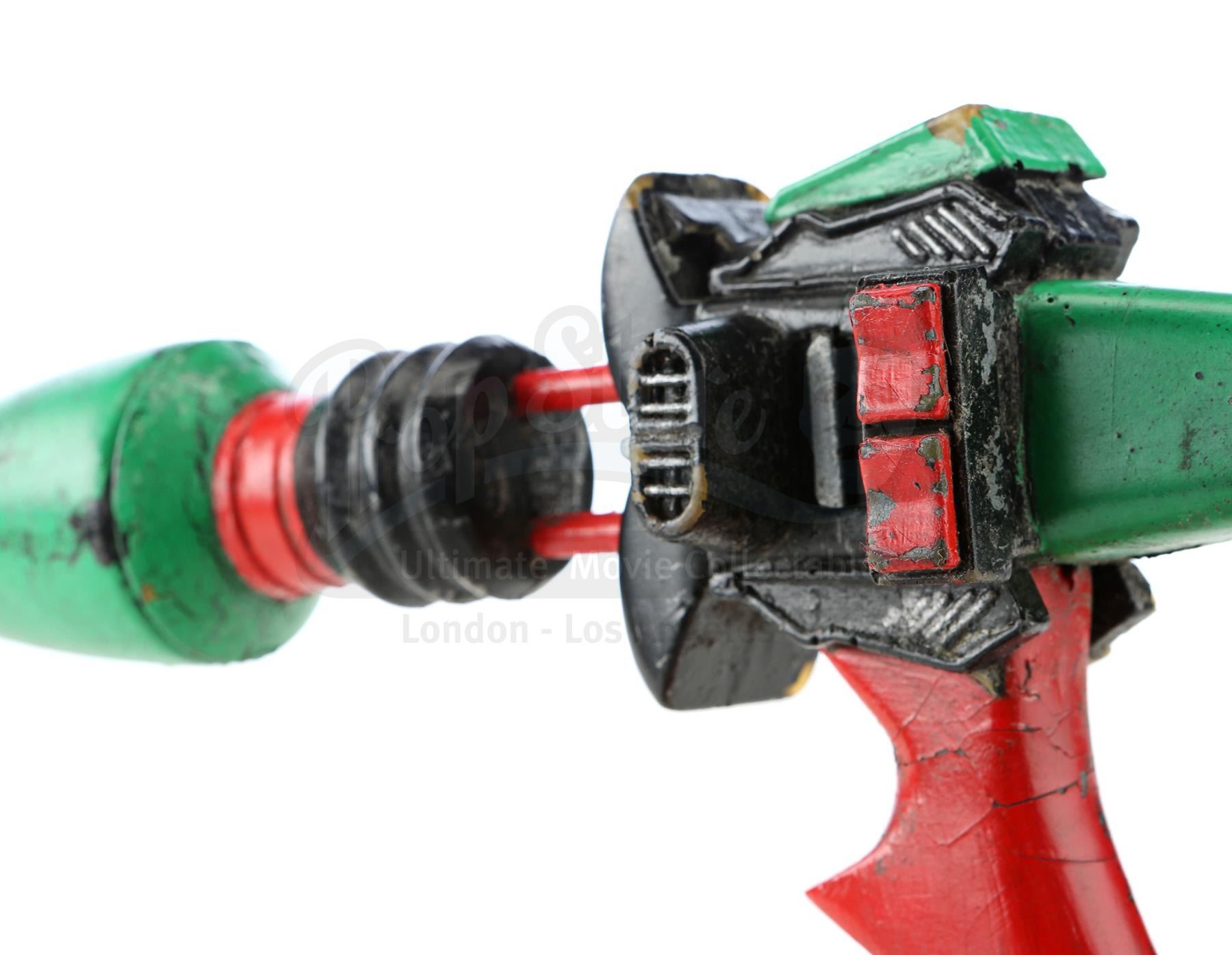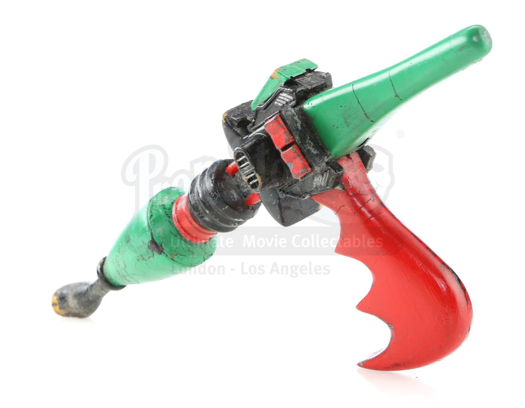 This otherworldly blaster is made of dense moulded rubber painted red, green, grey, and silver. It exhibits visible signs of wear, including paint chipping throughout and several nicks and cracks to the barrel from handling. Dimensions: 38 cm x 17.75 cm x 6.25 cm (15 " x 7" x 21/2")