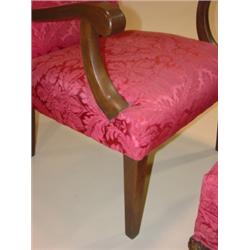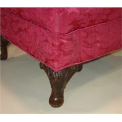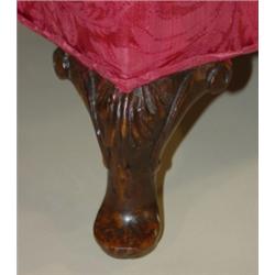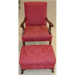 Martha Washington style upholstered arm chair with upholstered Queen Anne style footstool. Chair shows signs of wear on arms and has slight staining on seat. 37"H to top of back, 25" W, 16" H to top of seat. Footstool has major staining to top. 12.5" H, 23.5" x 17".