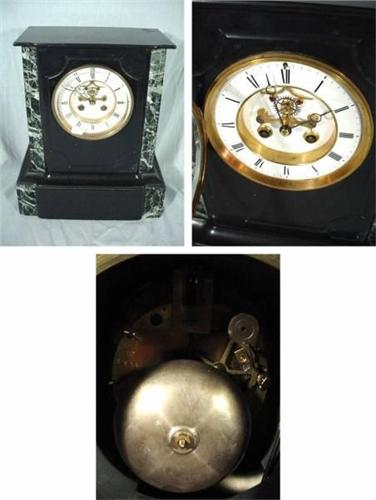 MARTI AND CIE MEDAL DE BRONZE 1867-1889 BLACK BELGUAN MARBLE WITH BLACK AND WHITE MARBLE TRIM. VISIBLE ESCAPEMENT WITH AGAGE PALLETS TIME AND STRIKE. 13"X11.25"X6.25". VALUATION: 650-850 USD.