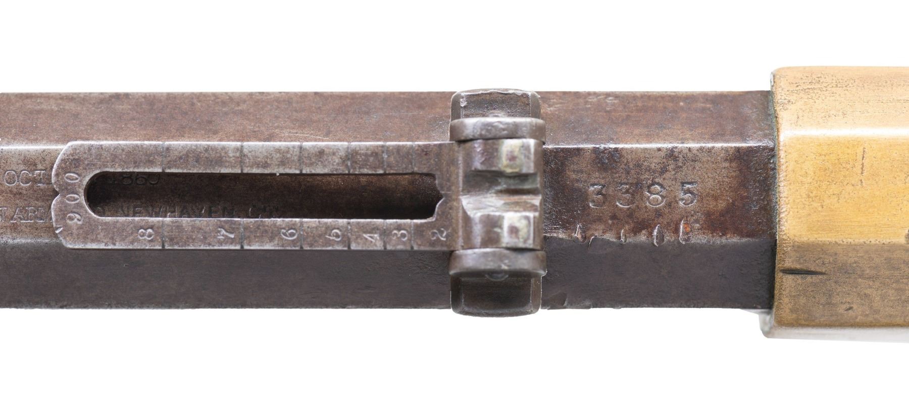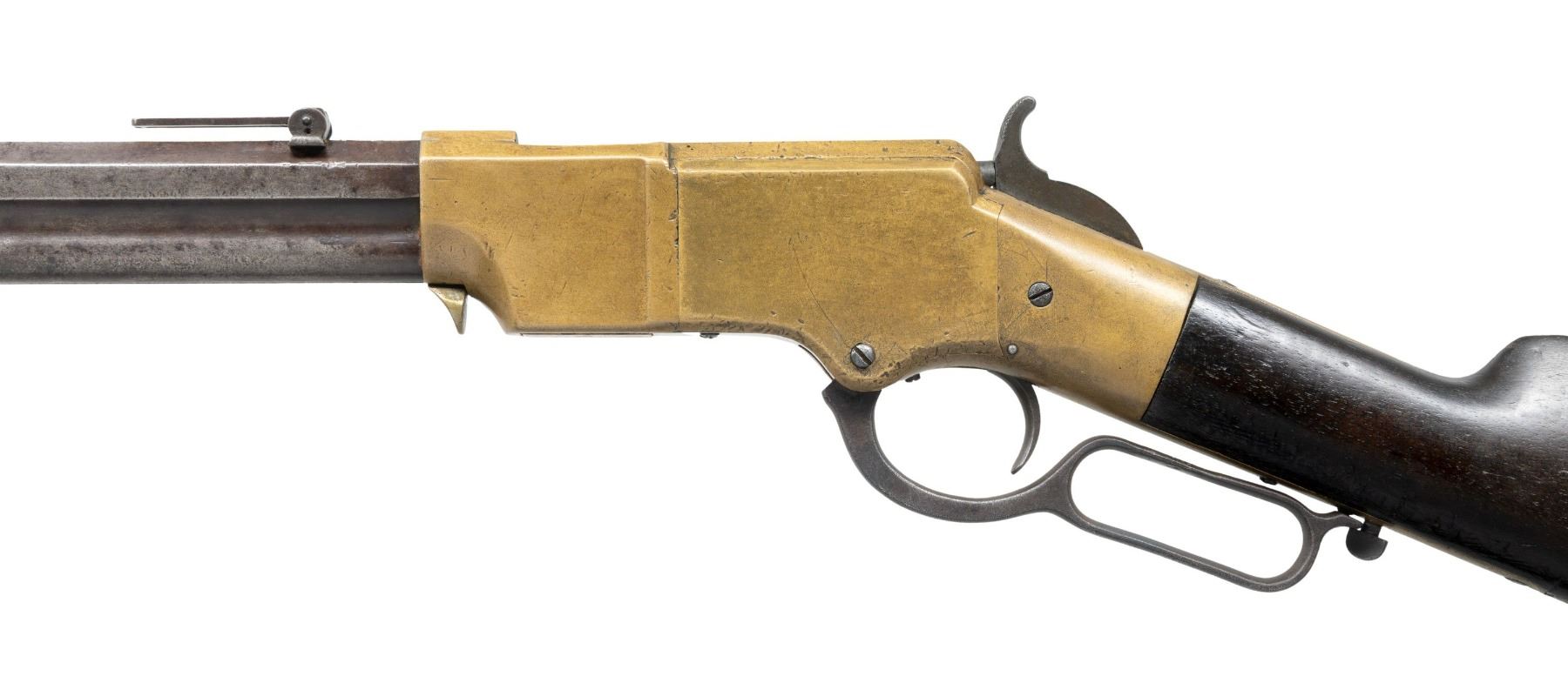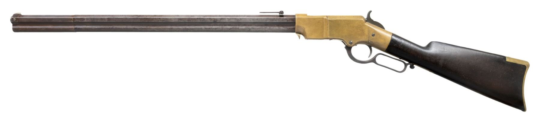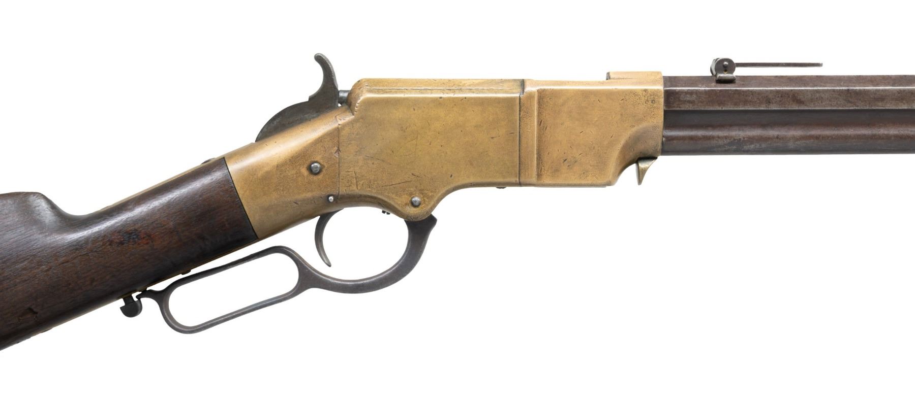 Cal. 44. S# 3385. This is a standard 4th variation Henry rifle made in 1863. 4th variation serial range about 3000-5000, with early DC cavalry guns all found in range 3001-3999 where this gun falls. Original CGC (Charles G. Chapman) inspection cartouche stamped on right side of stock and stamped on frame and barrel, and same small "c" on right side of butt plate near top. Standard configuration for all early martials, rounded 1st type butt plate with 7/8" wide trap door, .9" hole bored in butt stock to accept 4 piece wooden cleaning rod, lever latch on lower receiver tang and latch flange on rear of lever, has a milled flat along the magazine follower slot in lower front of receiver, large magazine follower with 5/8" wide finger tab, small .095 diameter trigger retaining pin, square back front German silver sight blade, slanted profile to stock comb, straight profile to lower edge of stock. Early 2.5" address which ends about S# 3500, sight dovetail milled in barrel only, six groove rifling, 900 yard rear sight with no slide stop screw. Matching serial number stamped on following parts: barrel behind rear sight dovetail, left side of lower receiver tang, top receiver tang channel in butt stock, inside bottom edge of butt plate, and both butt plate screws. The 3 tang screws are original correct unserialized Henry screws. Matching assembly numbers stamped on rounded portion of barrel under loading sleeve and on rear edge of loading sleeve. CONDITION: good overall, all original & authentic, iron patina with light areas of pitting, brass has toned patina, stock is sound with small hairlines & 2 small chips at toe and top tang, well worn, cartouche is visible in outline. Mechanics functional, good dark rifled bore. PROVENANCE: The Esteemed Norm Greenberg Collection. (01-27721/JS). ANTIQUE. $20,000-30,000.