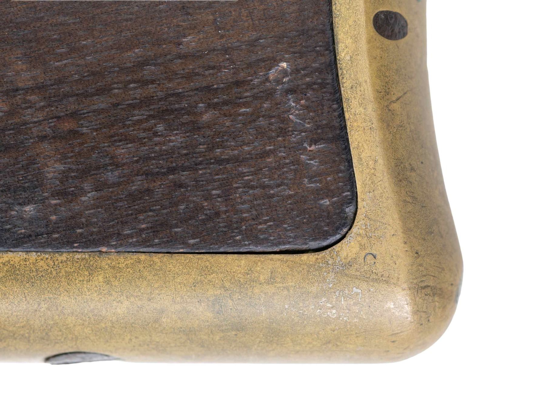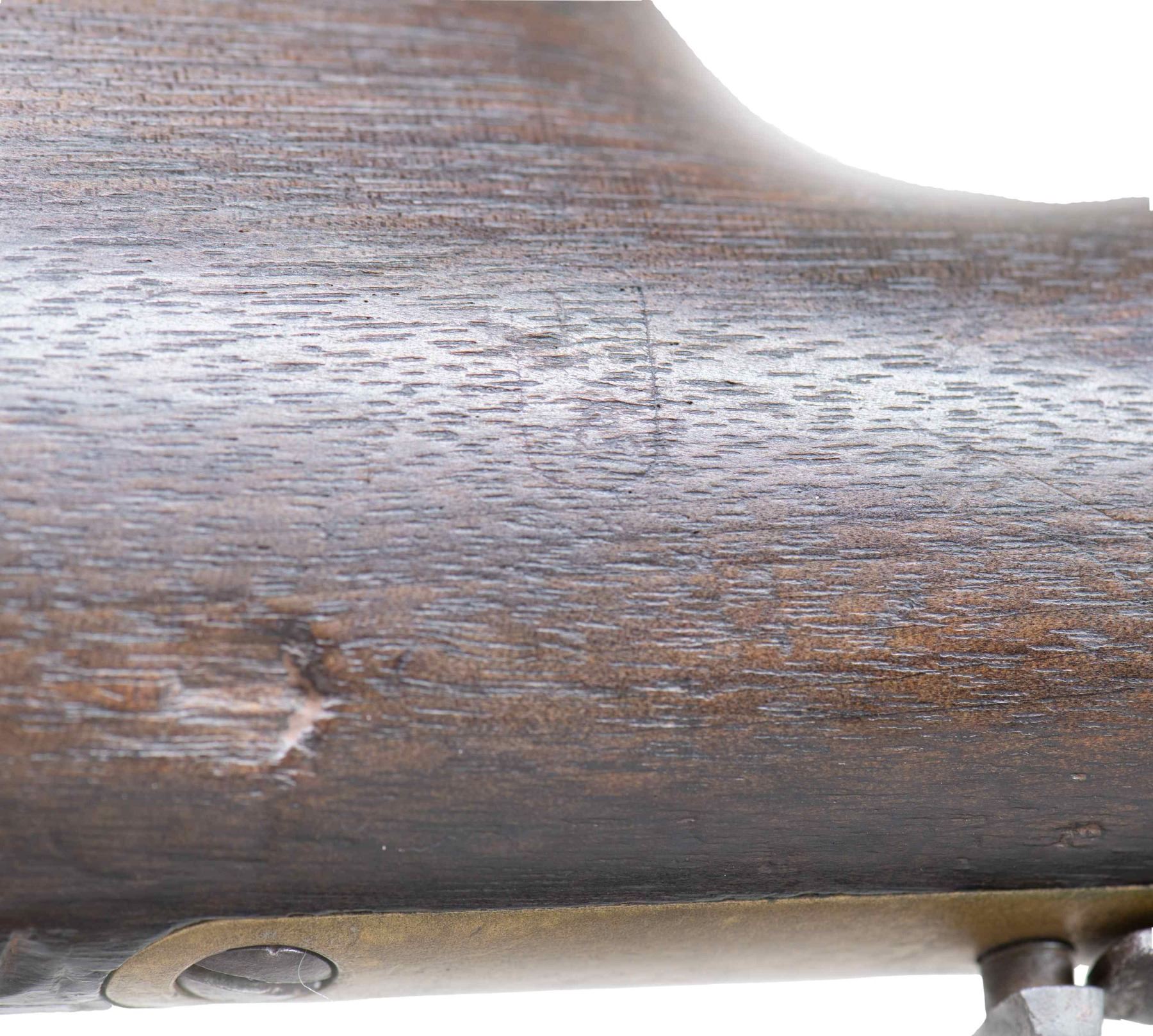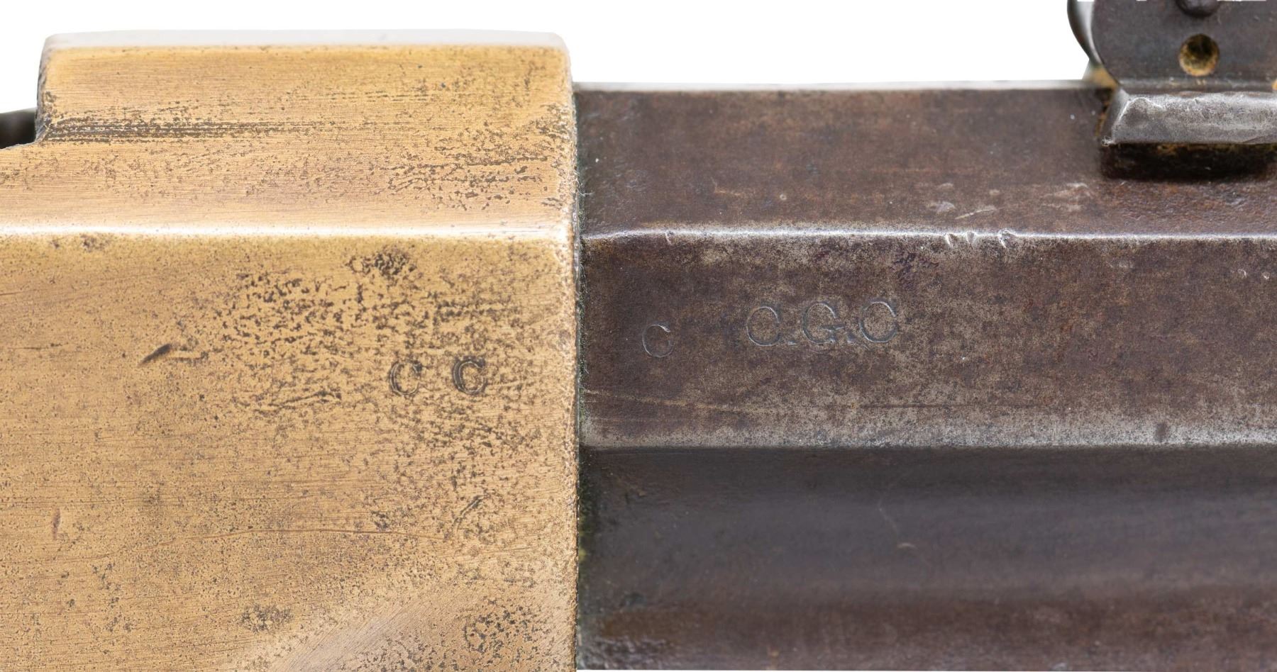 Cal. 44. S# 3385. This is a standard 4th variation Henry rifle made in 1863. 4th variation serial range about 3000-5000, with early DC cavalry guns all found in range 3001-3999 where this gun falls. Original CGC (Charles G. Chapman) inspection cartouche stamped on right side of stock and stamped on frame and barrel, and same small "c" on right side of butt plate near top. Standard configuration for all early martials, rounded 1st type butt plate with 7/8" wide trap door, .9" hole bored in butt stock to accept 4 piece wooden cleaning rod, lever latch on lower receiver tang and latch flange on rear of lever, has a milled flat along the magazine follower slot in lower front of receiver, large magazine follower with 5/8" wide finger tab, small .095 diameter trigger retaining pin, square back front German silver sight blade, slanted profile to stock comb, straight profile to lower edge of stock. Early 2.5" address which ends about S# 3500, sight dovetail milled in barrel only, six groove rifling, 900 yard rear sight with no slide stop screw. Matching serial number stamped on following parts: barrel behind rear sight dovetail, left side of lower receiver tang, top receiver tang channel in butt stock, inside bottom edge of butt plate, and both butt plate screws. The 3 tang screws are original correct unserialized Henry screws. Matching assembly numbers stamped on rounded portion of barrel under loading sleeve and on rear edge of loading sleeve. CONDITION: good overall, all original & authentic, iron patina with light areas of pitting, brass has toned patina, stock is sound with small hairlines & 2 small chips at toe and top tang, well worn, cartouche is visible in outline. Mechanics functional, good dark rifled bore. PROVENANCE: The Esteemed Norm Greenberg Collection. (01-27721/JS). ANTIQUE. $20,000-30,000.