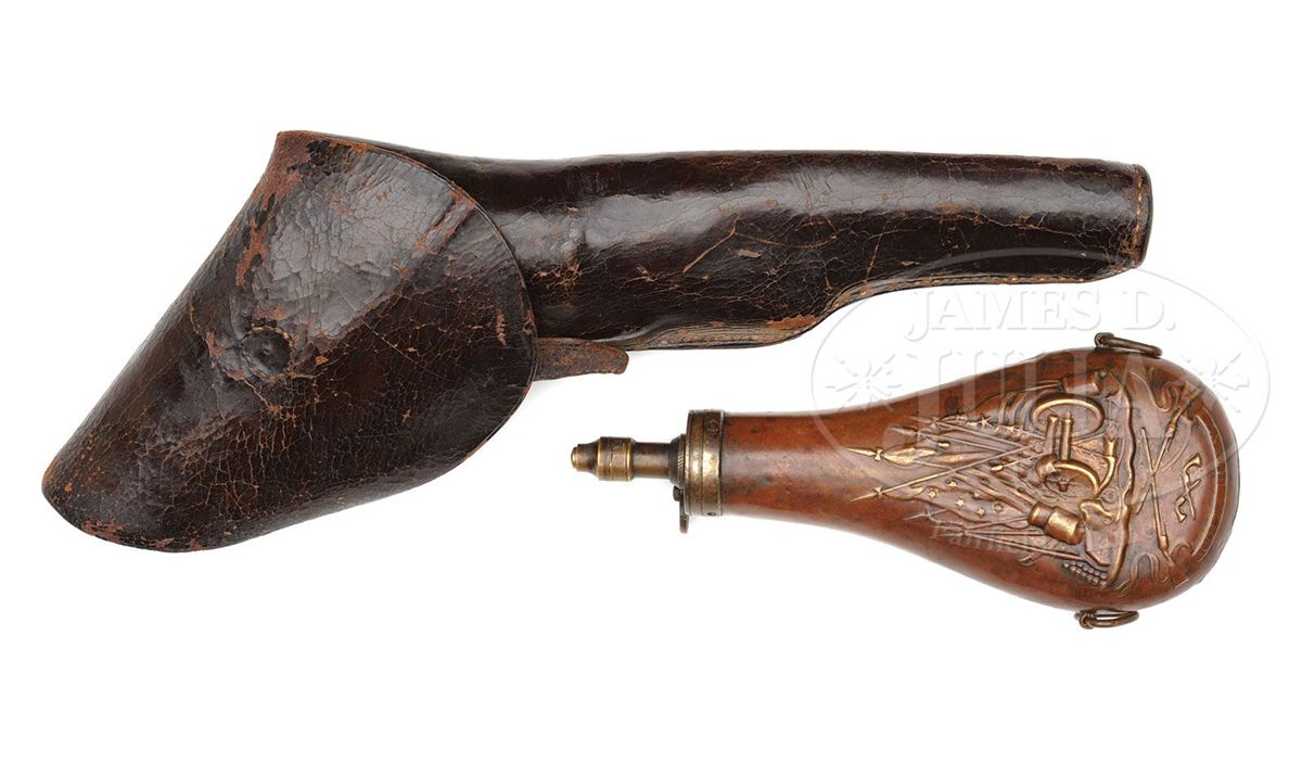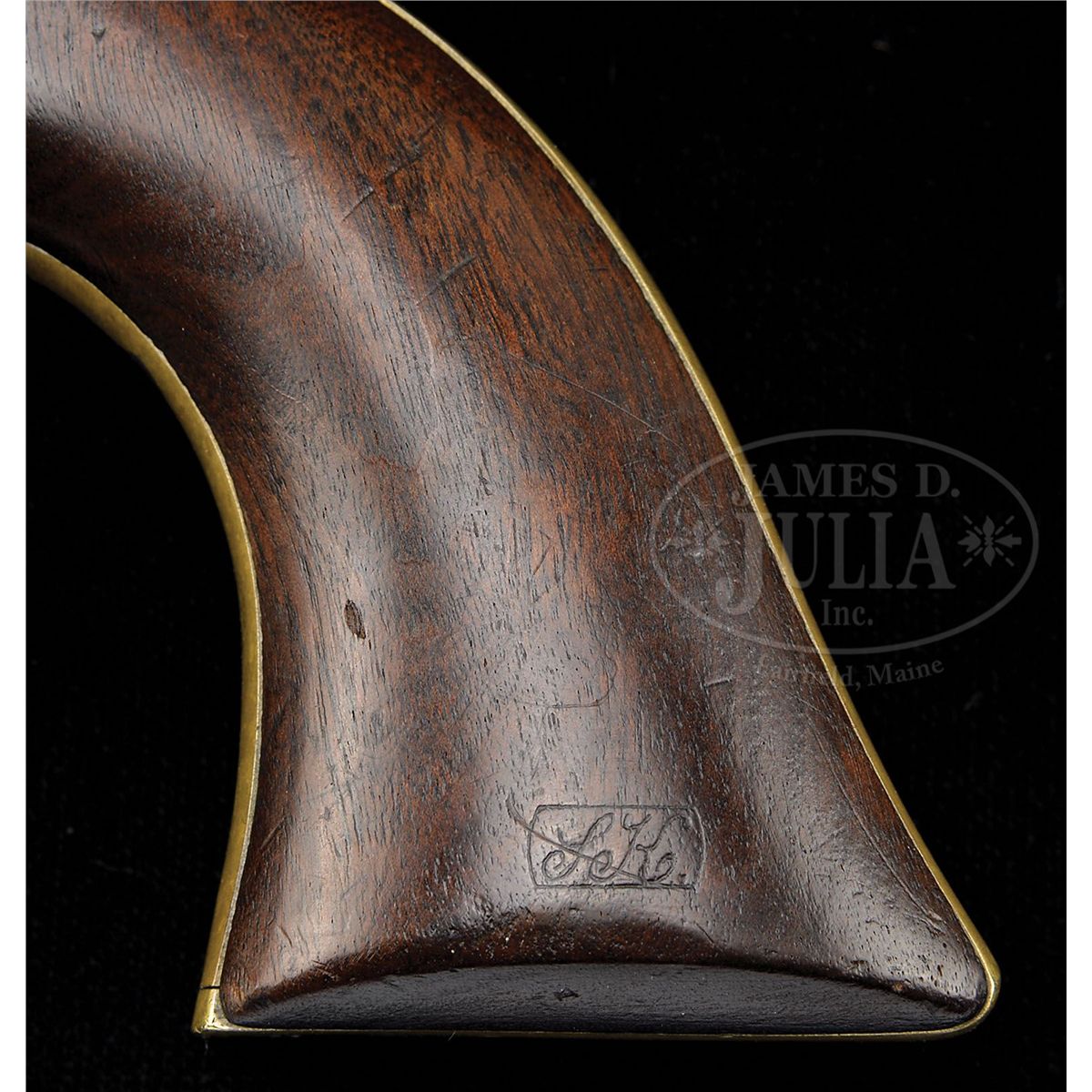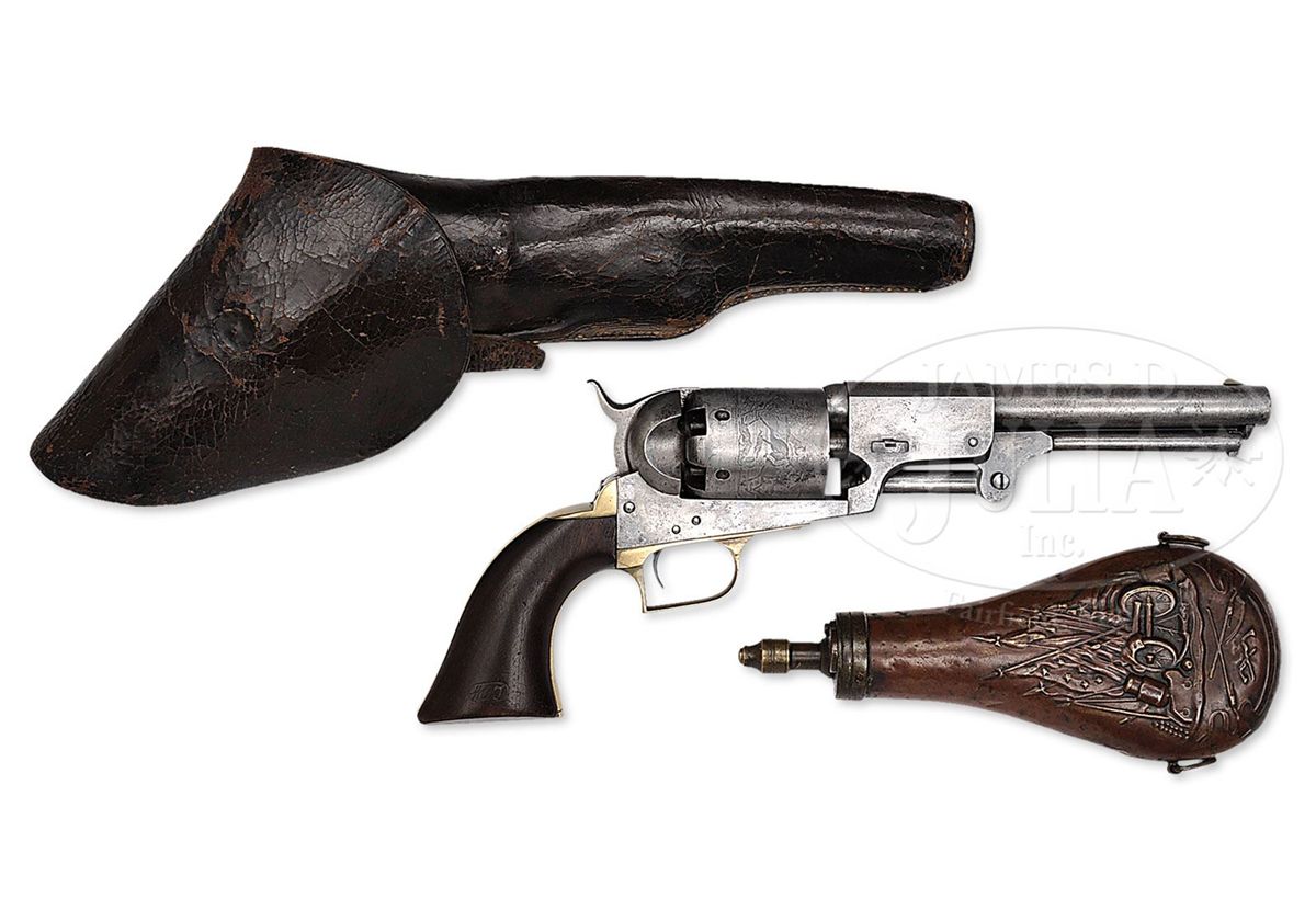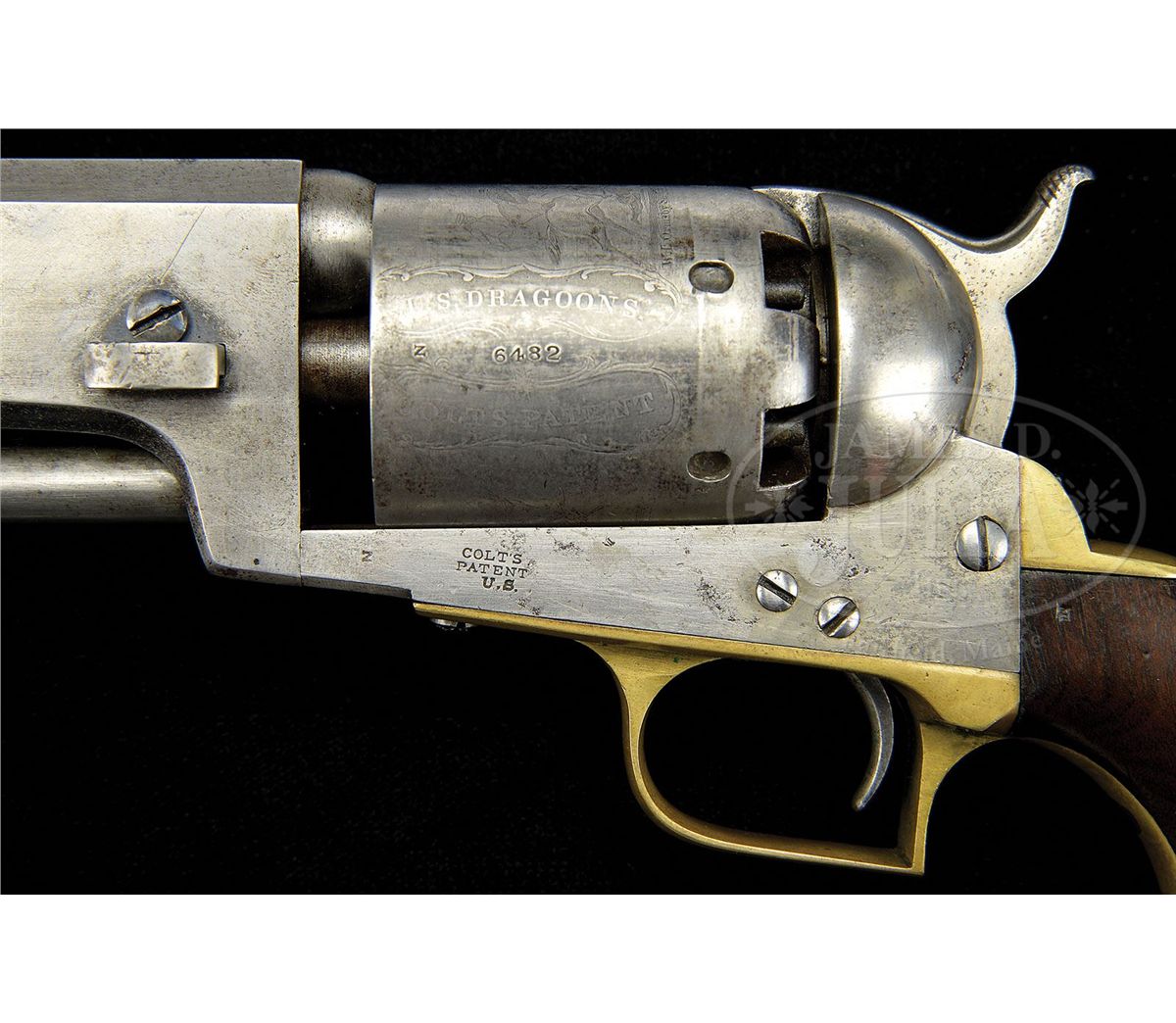 SN 6482. Cal. 44. Usual configuration with 7-1/2" oct to rnd bbl, German silver front sight and 1-line, left hand New York City address. Left side of frame is marked with a tiny "COLT'S PATENT" over a tiny "U.S." The square back brass trigger guard & back strap contain a 1-pc walnut grip with matching SN in the butt strap channel. Grip has a legible "SK" (Samuel Keeler) inspector cartouche on the left side and a "WAT" (William A. Thornton) sub-inspector cartouche on the right side. Various parts have small sub-inspector initials. Cyl is 6-shots with oval stop notches and its single prominent safety pin. Cyl has the Dragoon/Indian fight scene roll marking and the scarce "U.S. DRAGOONS" / COLT'S PATENT" panels surrounding the SN. It also has a partial pressure ridge. Accompanied by an outstanding "COLTS PATENT" Dragoon flask with plunger spout and "COLT'S PATENT" marked swinging cover ball chamber. Flask also has the "WAT" inspector initials and has low mounted, triangle shaped hangers. Additionally accompanied by a very rare russet brown leather military flap holster with tab closure and Cheyenne-style plug. 1st Model Dragoons are occasionally encountered but rarely with any cyl scene whatsoever or grip cartouches. PROVENANCE: Dr. John M. Pickup Collection. CONDITION: Fine, all matching except wedge which is unnumbered. Revolver retains traces of orig finish on the bbl with the balance having been cleaned to bare metal and has some very fine scattered pin pricks of pitting; frame, cyl & hammer are also cleaned to bare metal with scattered fine pin pricks of pitting; trigger guard & back strap are a medium mustard patina. Grip has chipped toes, otherwise is sound with moderately worn edges, a few nicks & scratches and retains a wonderful hand worn patina. Mechanics are fine, bright shiny bore, slightly frosty in the grooves. Flask has a repaired seam on the bottom with a slightly open seam on one side and retains a very dark copper patina. Holster is sound with a repaired belt loop, is dry & crackled on the flap but overall is serviceable and retains about 75% orig finish. Altogether a rare grouping. 4-46422 JR55