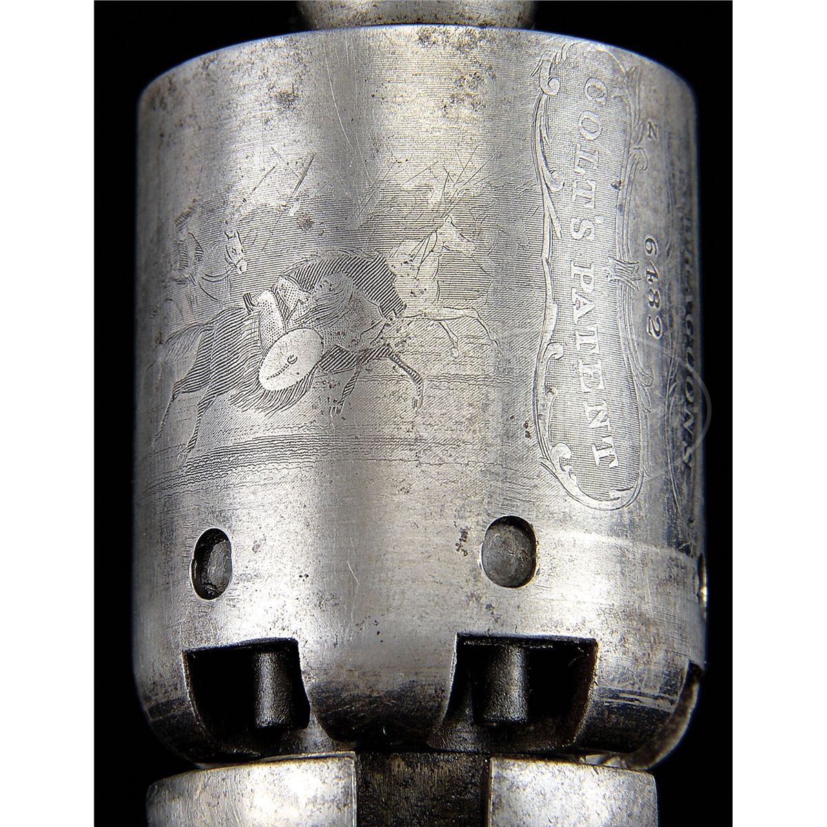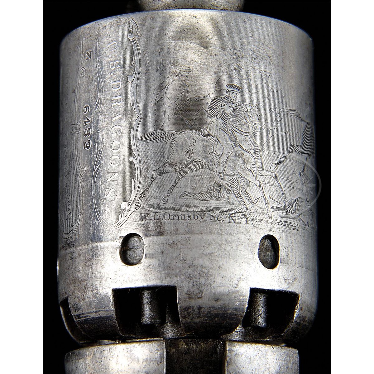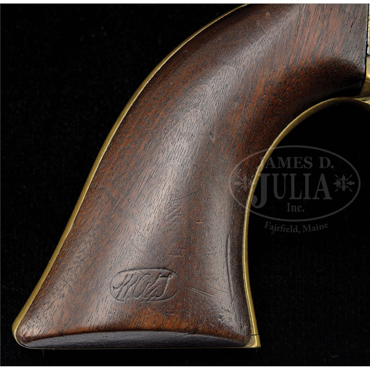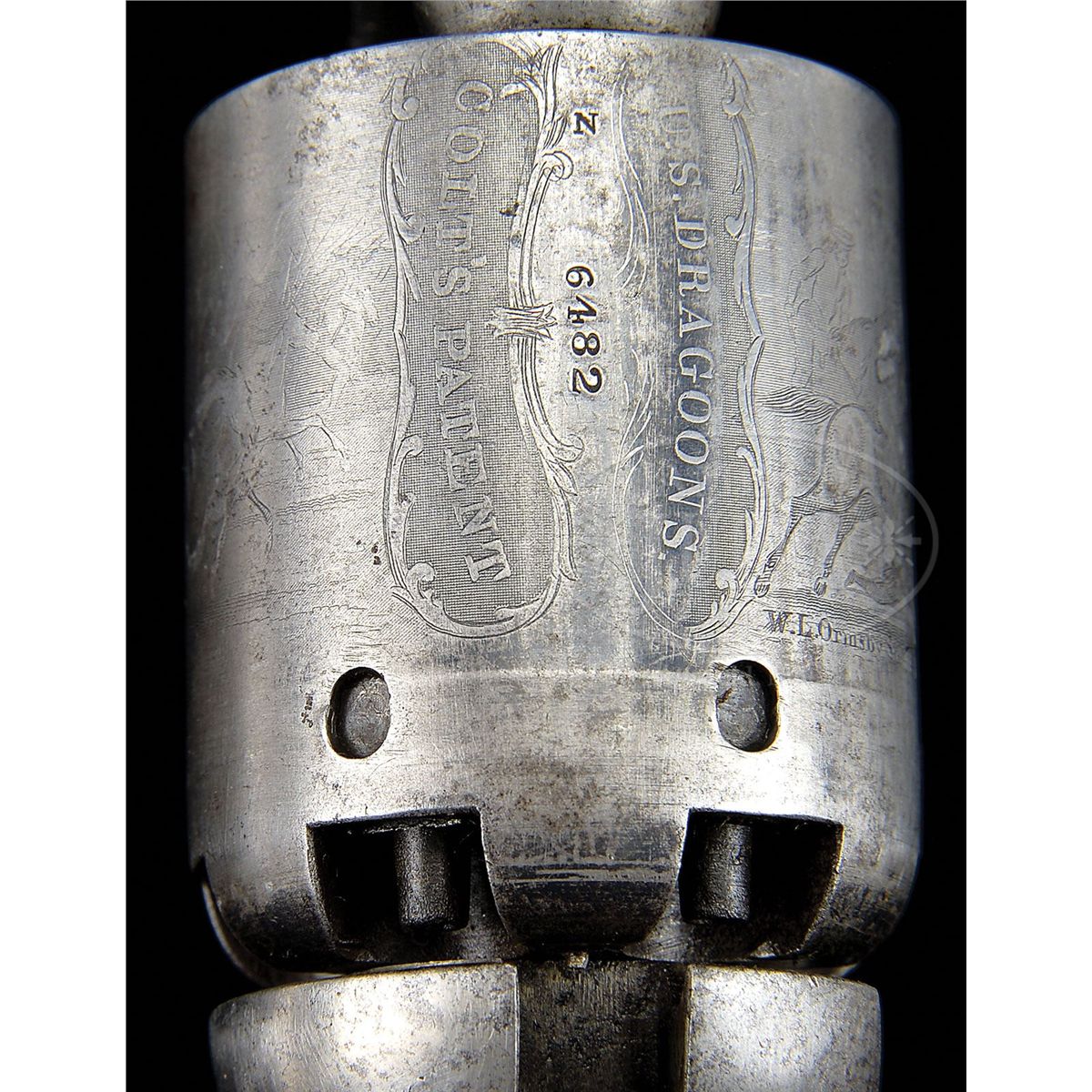 SN 6482. Cal. 44. Usual configuration with 7-1/2" oct to rnd bbl, German silver front sight and 1-line, left hand New York City address. Left side of frame is marked with a tiny "COLT'S PATENT" over a tiny "U.S." The square back brass trigger guard & back strap contain a 1-pc walnut grip with matching SN in the butt strap channel. Grip has a legible "SK" (Samuel Keeler) inspector cartouche on the left side and a "WAT" (William A. Thornton) sub-inspector cartouche on the right side. Various parts have small sub-inspector initials. Cyl is 6-shots with oval stop notches and its single prominent safety pin. Cyl has the Dragoon/Indian fight scene roll marking and the scarce "U.S. DRAGOONS" / COLT'S PATENT" panels surrounding the SN. It also has a partial pressure ridge. Accompanied by an outstanding "COLTS PATENT" Dragoon flask with plunger spout and "COLT'S PATENT" marked swinging cover ball chamber. Flask also has the "WAT" inspector initials and has low mounted, triangle shaped hangers. Additionally accompanied by a very rare russet brown leather military flap holster with tab closure and Cheyenne-style plug. 1st Model Dragoons are occasionally encountered but rarely with any cyl scene whatsoever or grip cartouches. PROVENANCE: Dr. John M. Pickup Collection. CONDITION: Fine, all matching except wedge which is unnumbered. Revolver retains traces of orig finish on the bbl with the balance having been cleaned to bare metal and has some very fine scattered pin pricks of pitting; frame, cyl & hammer are also cleaned to bare metal with scattered fine pin pricks of pitting; trigger guard & back strap are a medium mustard patina. Grip has chipped toes, otherwise is sound with moderately worn edges, a few nicks & scratches and retains a wonderful hand worn patina. Mechanics are fine, bright shiny bore, slightly frosty in the grooves. Flask has a repaired seam on the bottom with a slightly open seam on one side and retains a very dark copper patina. Holster is sound with a repaired belt loop, is dry & crackled on the flap but overall is serviceable and retains about 75% orig finish. Altogether a rare grouping. 4-46422 JR55